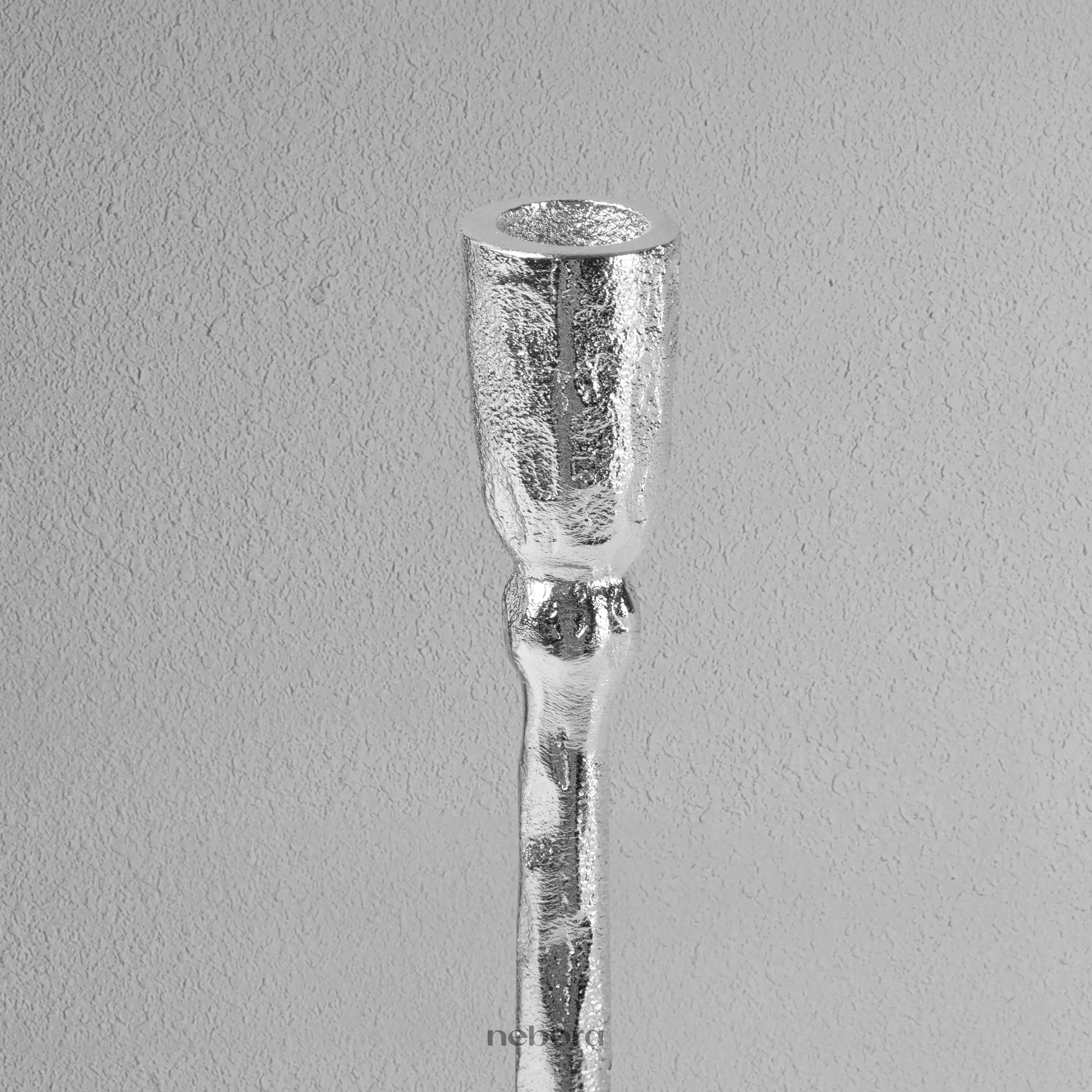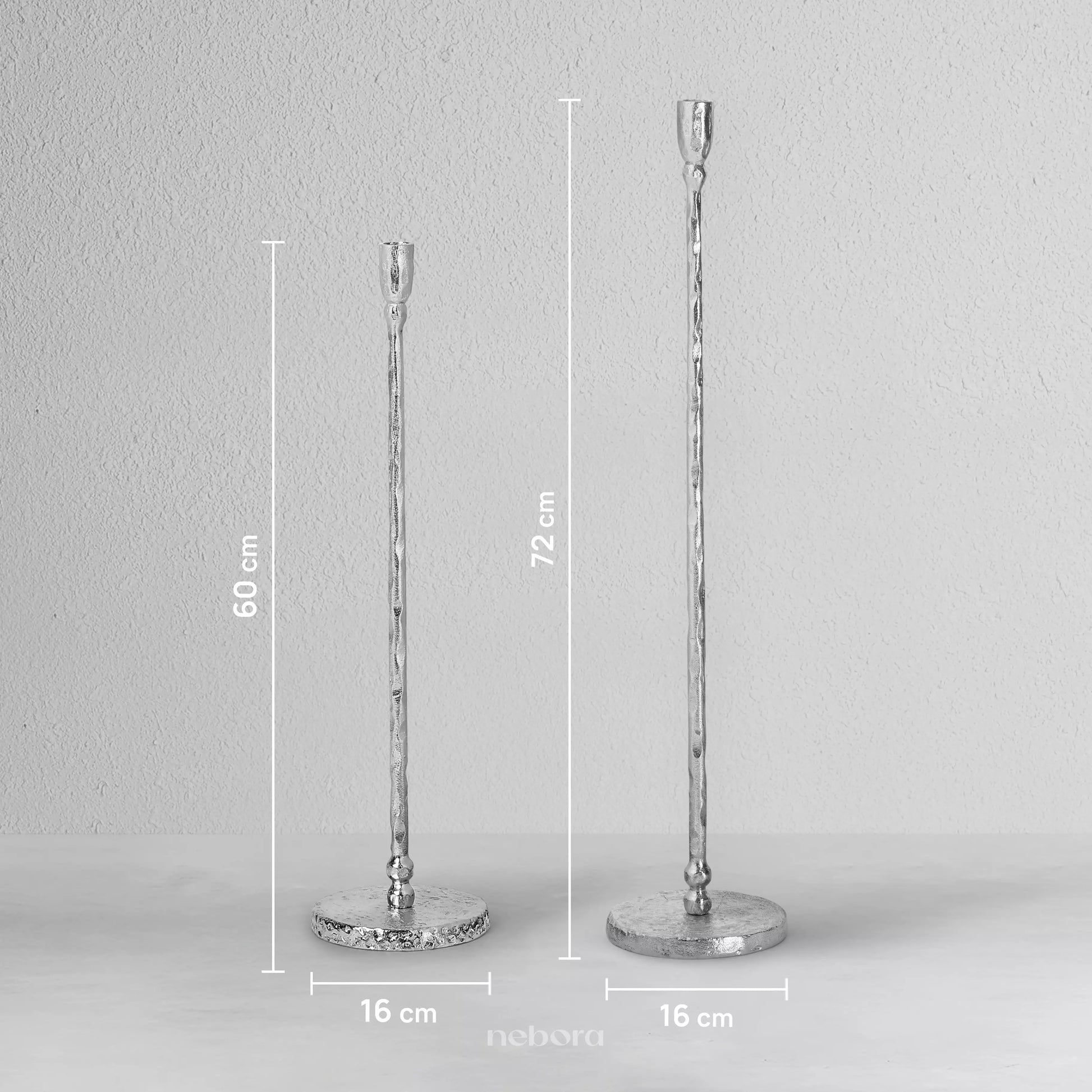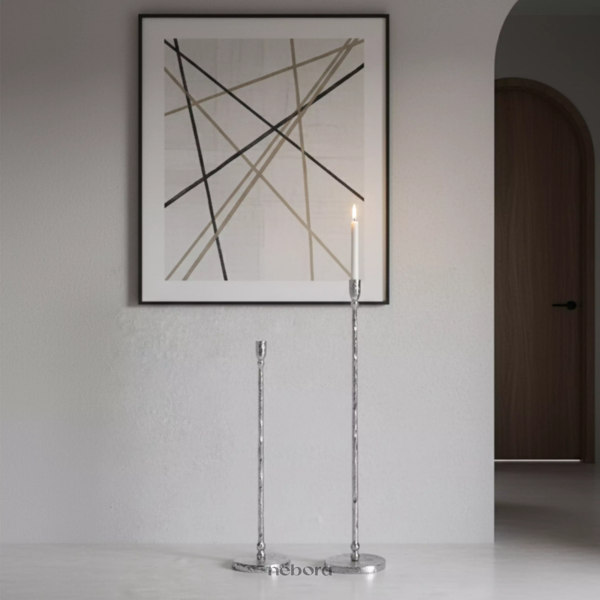 This sophisticated set of two candle stands, one large and one small, creates a beautiful harmony of proportion and style. Both pieces share a sleek silhouette and a captivating, hand-forged texture in a polished silver finish, allowing them to complement each other perfectly. Ideal for a fireplace mantel or a prominent console table, this set adds a dynamic and artistic focal point that feels both timeless and elegantly modern.