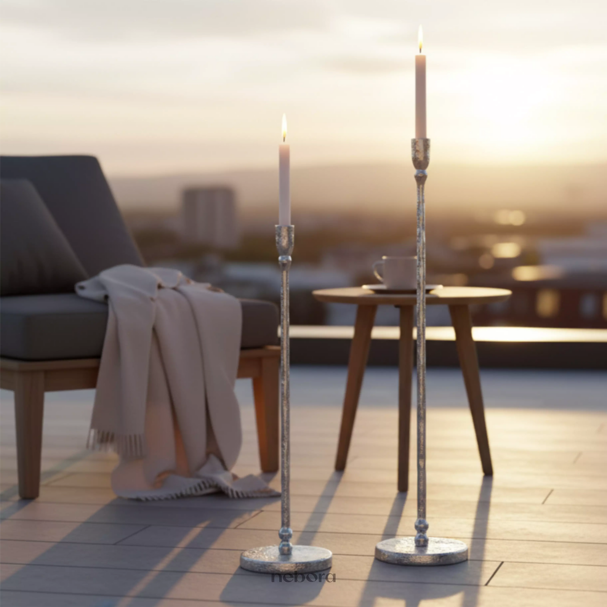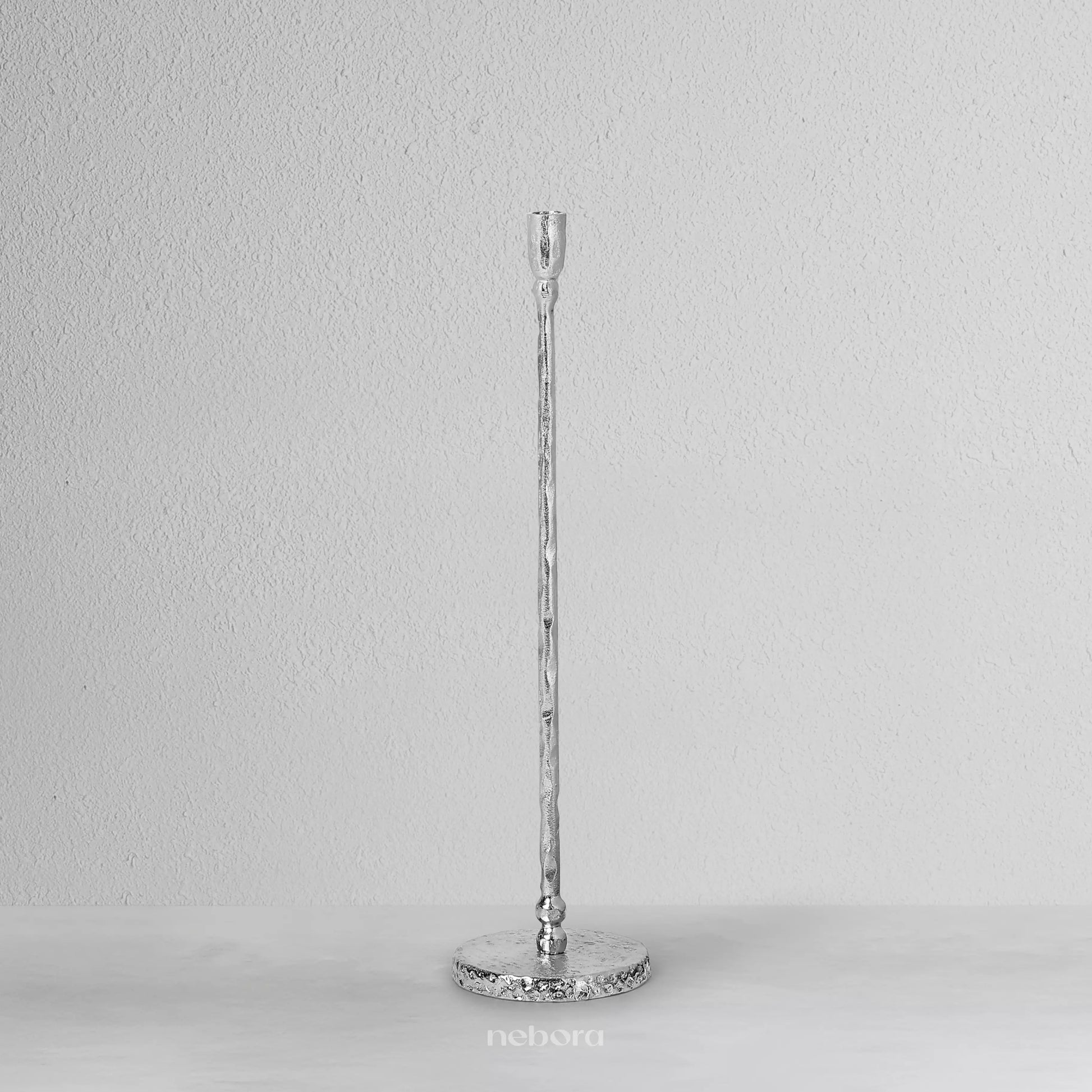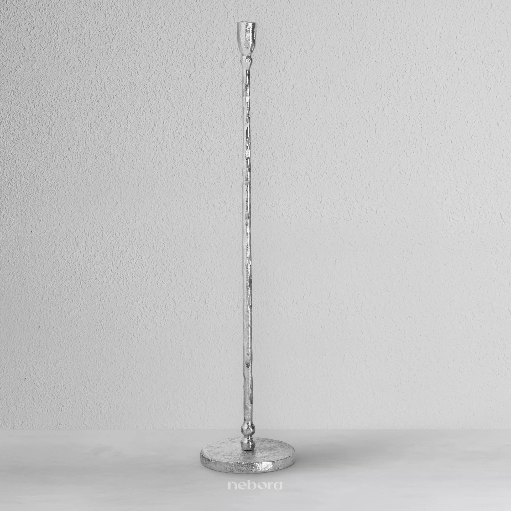 This sophisticated set of two candle stands, one large and one small, creates a beautiful harmony of proportion and style. Both pieces share a sleek silhouette and a captivating, hand-forged texture in a polished silver finish, allowing them to complement each other perfectly. Ideal for a fireplace mantel or a prominent console table, this set adds a dynamic and artistic focal point that feels both timeless and elegantly modern.
