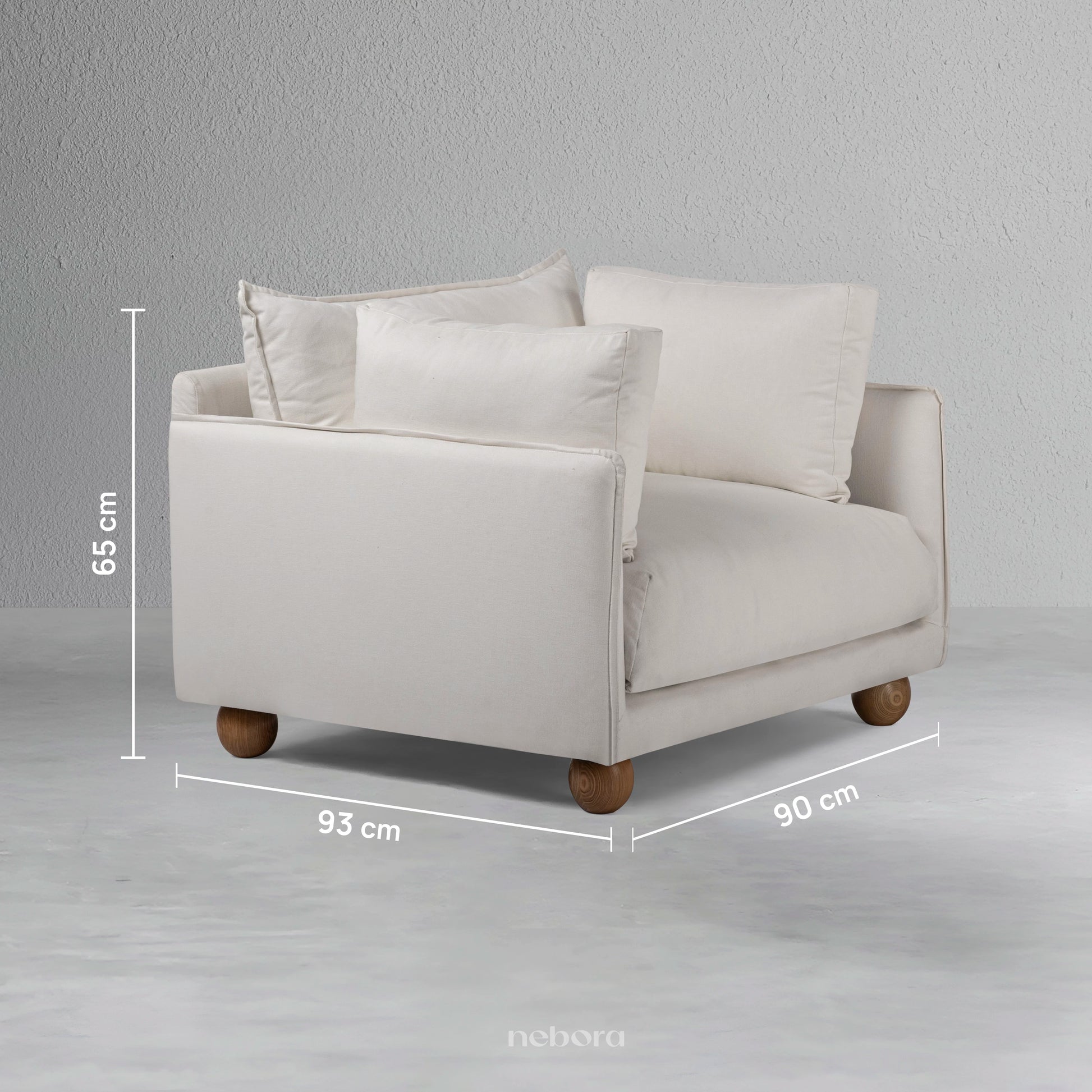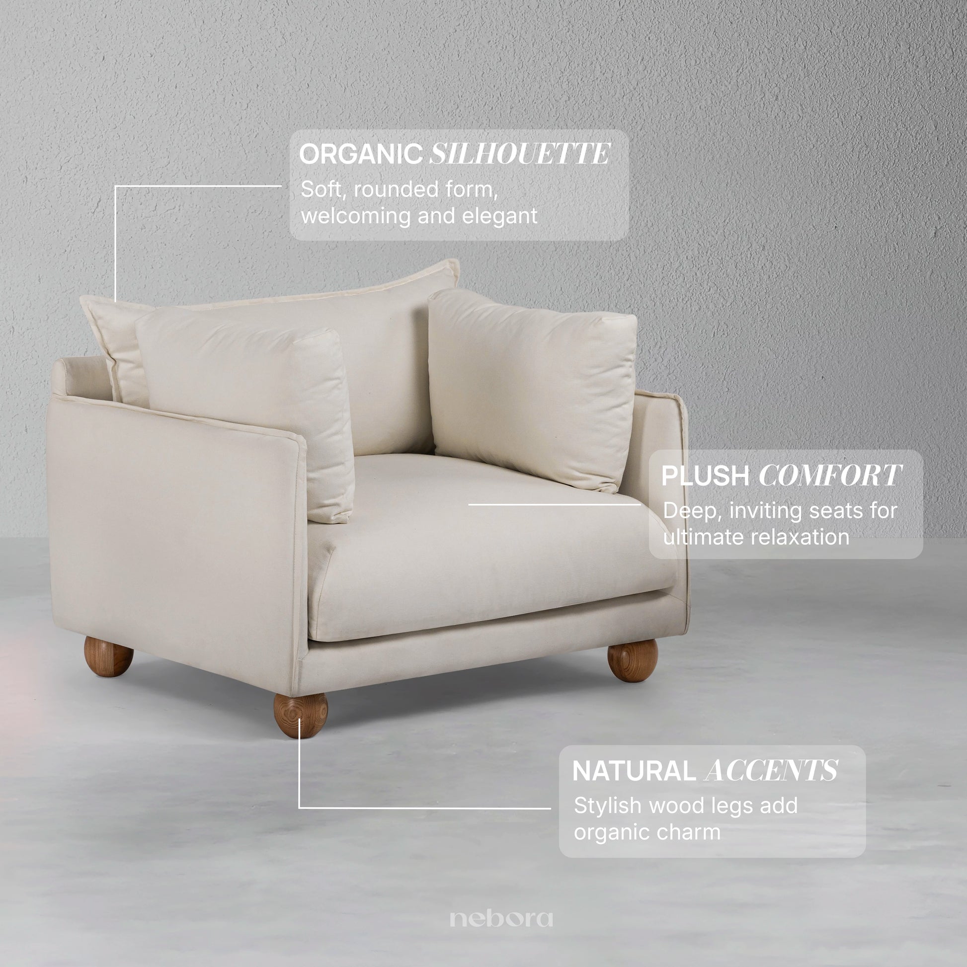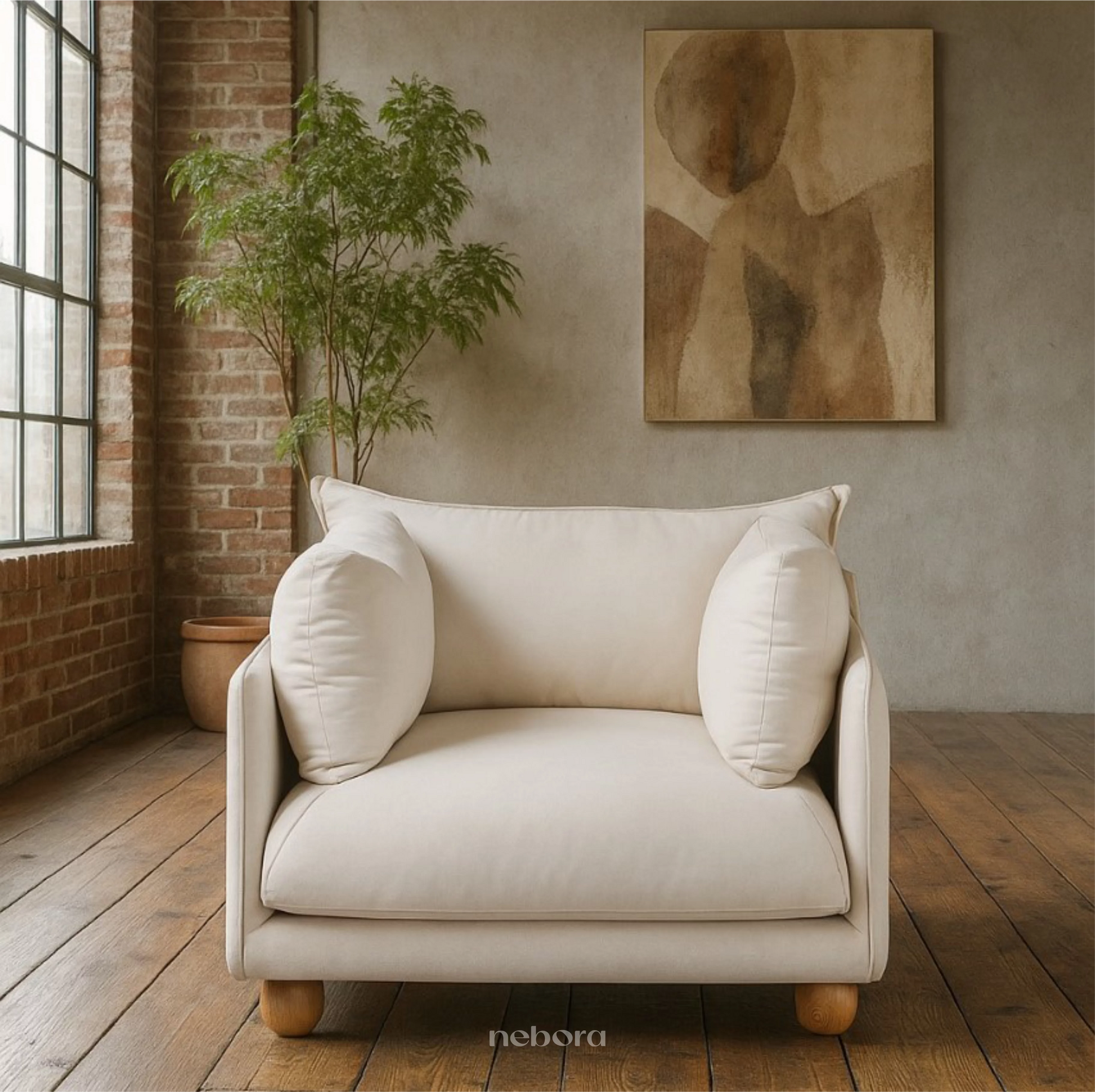 Unwind in style with the Aura Single Seater Sofa. Its organic silhouette, plush deep seating, and natural wood legs combine for a truly inviting and elegant experience, making it the perfect accent piece for a serene reading nook or a stylish living room. Crafted with a solid wood frame and premium fabric, it's the ultimate blend of comfort and modern charm