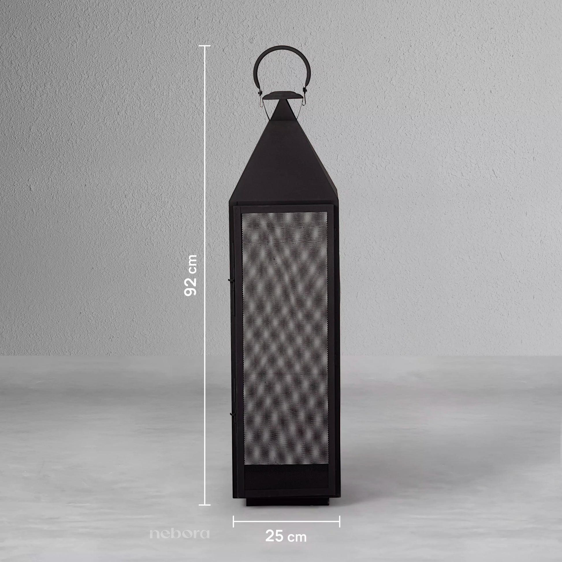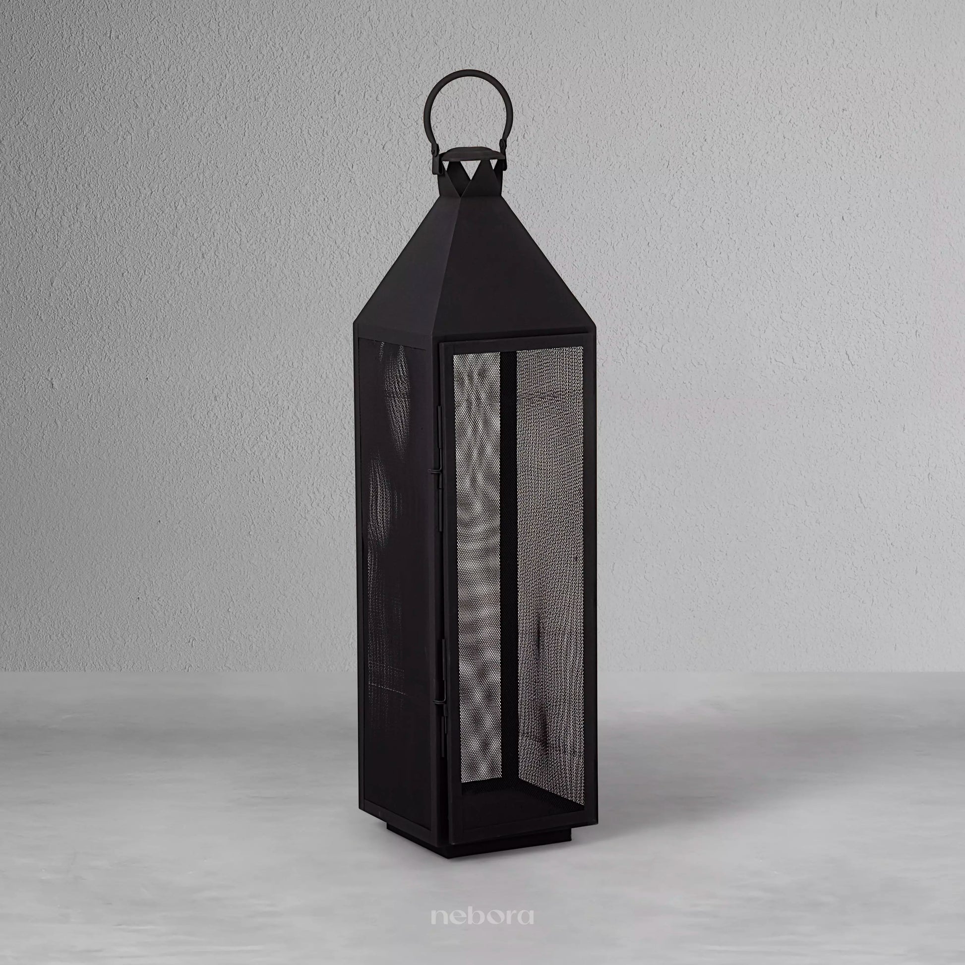 A captivating blend of form and function, this lantern is a modern sculpture that contains a hidden light. Its matte black, architectural frame provides a strong, graphic silhouette, while the intricate mesh panels hint at the warm glow within. This piece is perfect for adding a touch of urban elegance and a quiet, mysterious charm to any corner, making a bold statement even before a candle is lit.