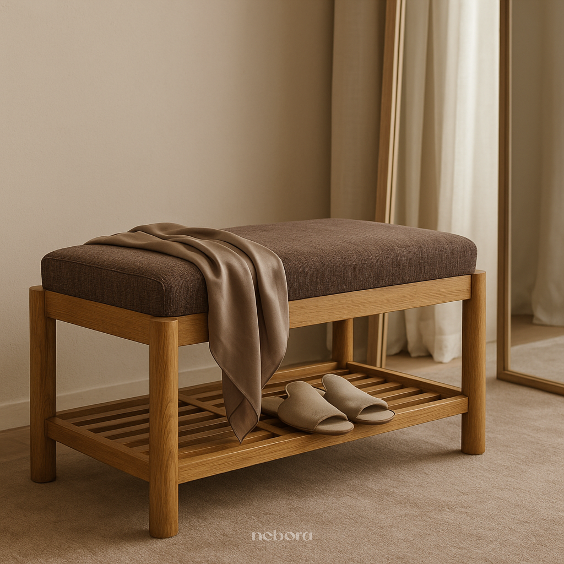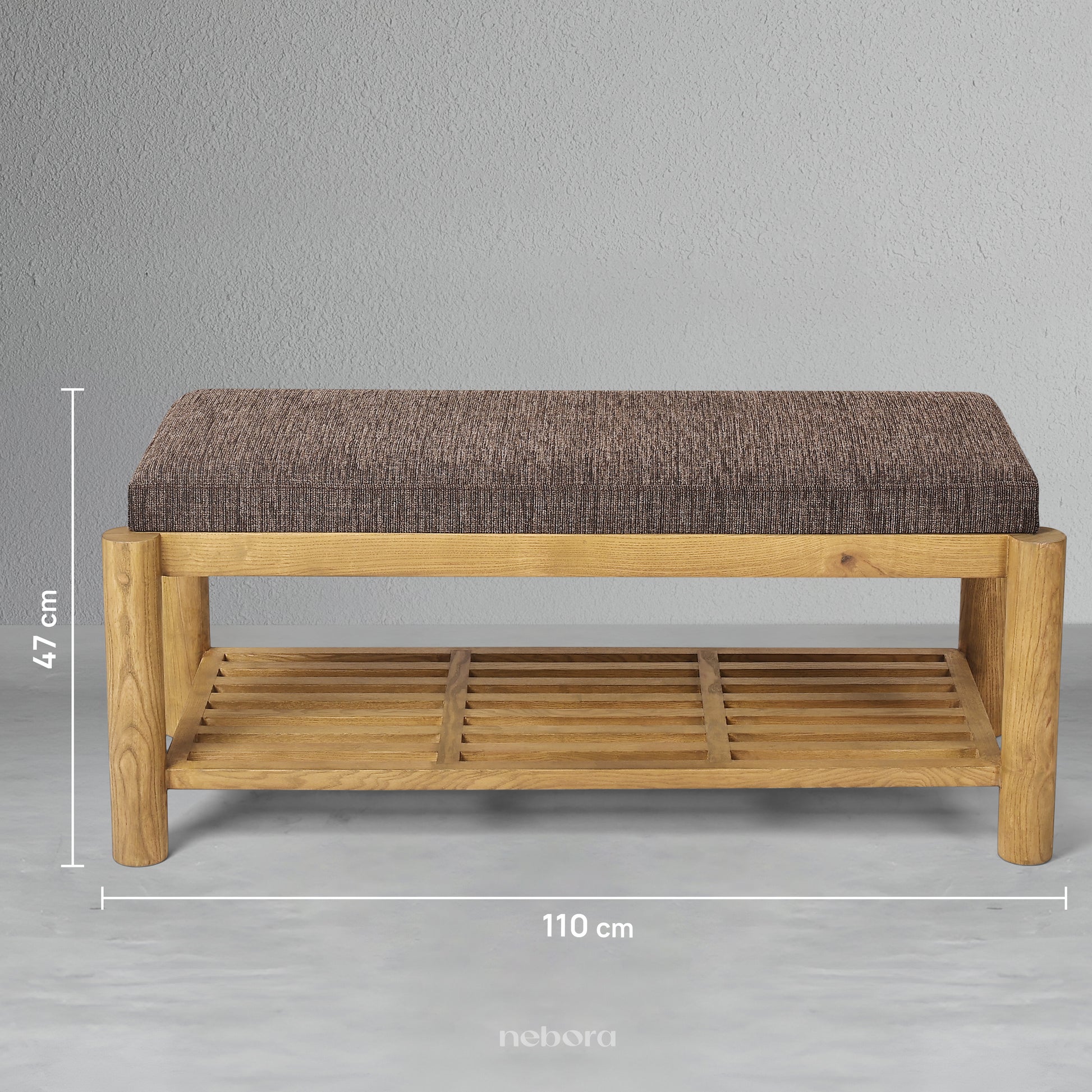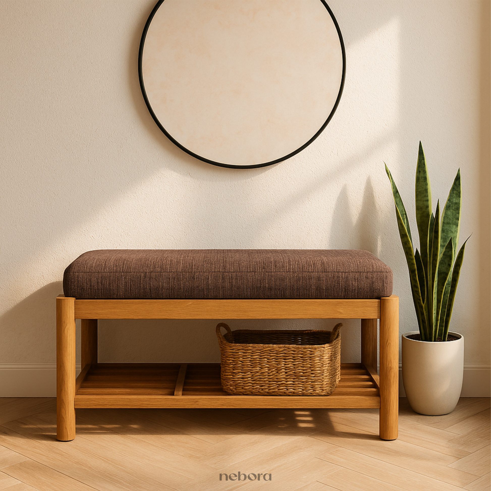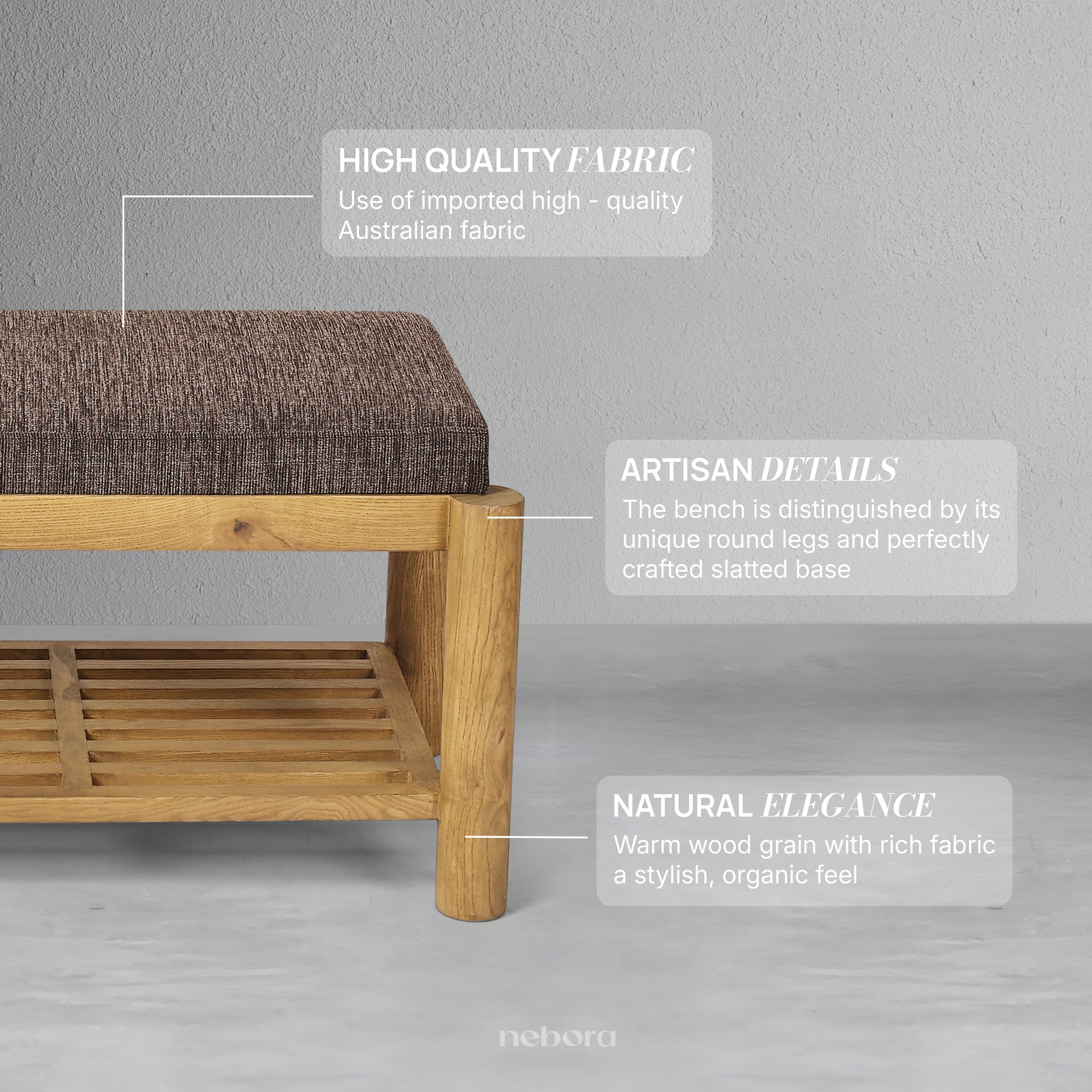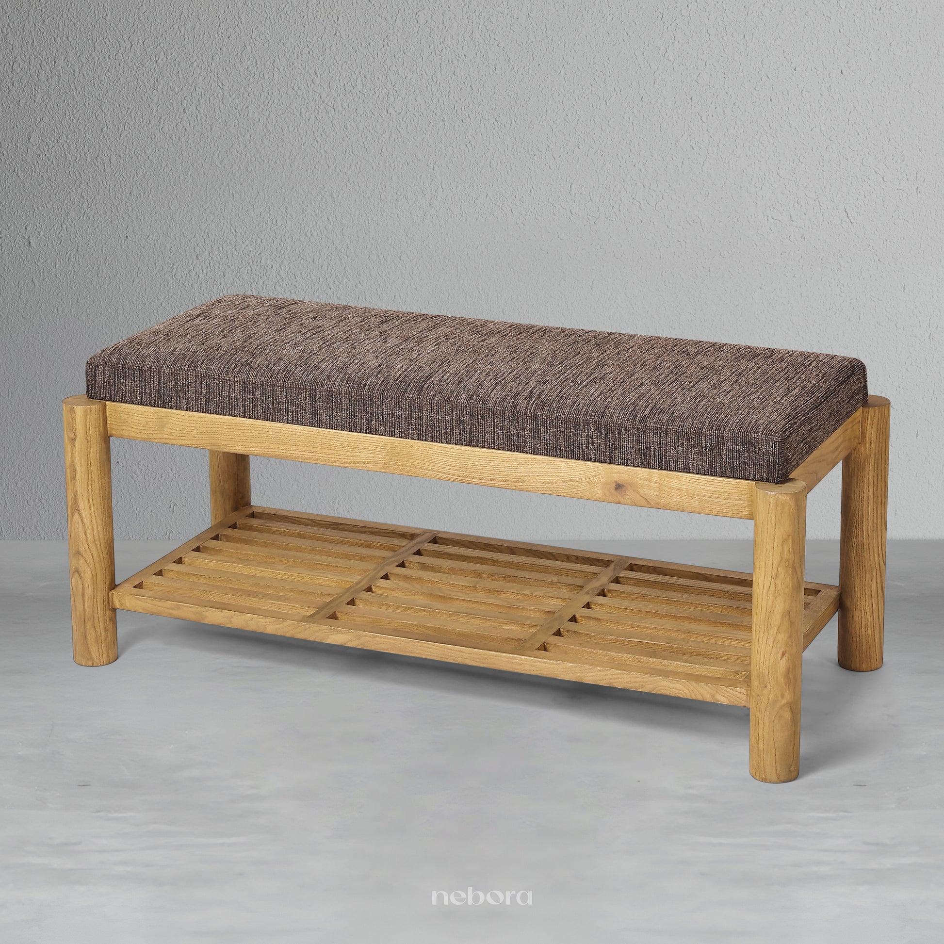 Welcome home to a moment of calm. This bench, with its plush, textured cushion and a beautifully slatted shelf, is the perfect landing spot after a long day. Place it in your entryway or mudroom as a functional and inviting piece, where you can sit and decompress before stepping fully into the comfort of your home.