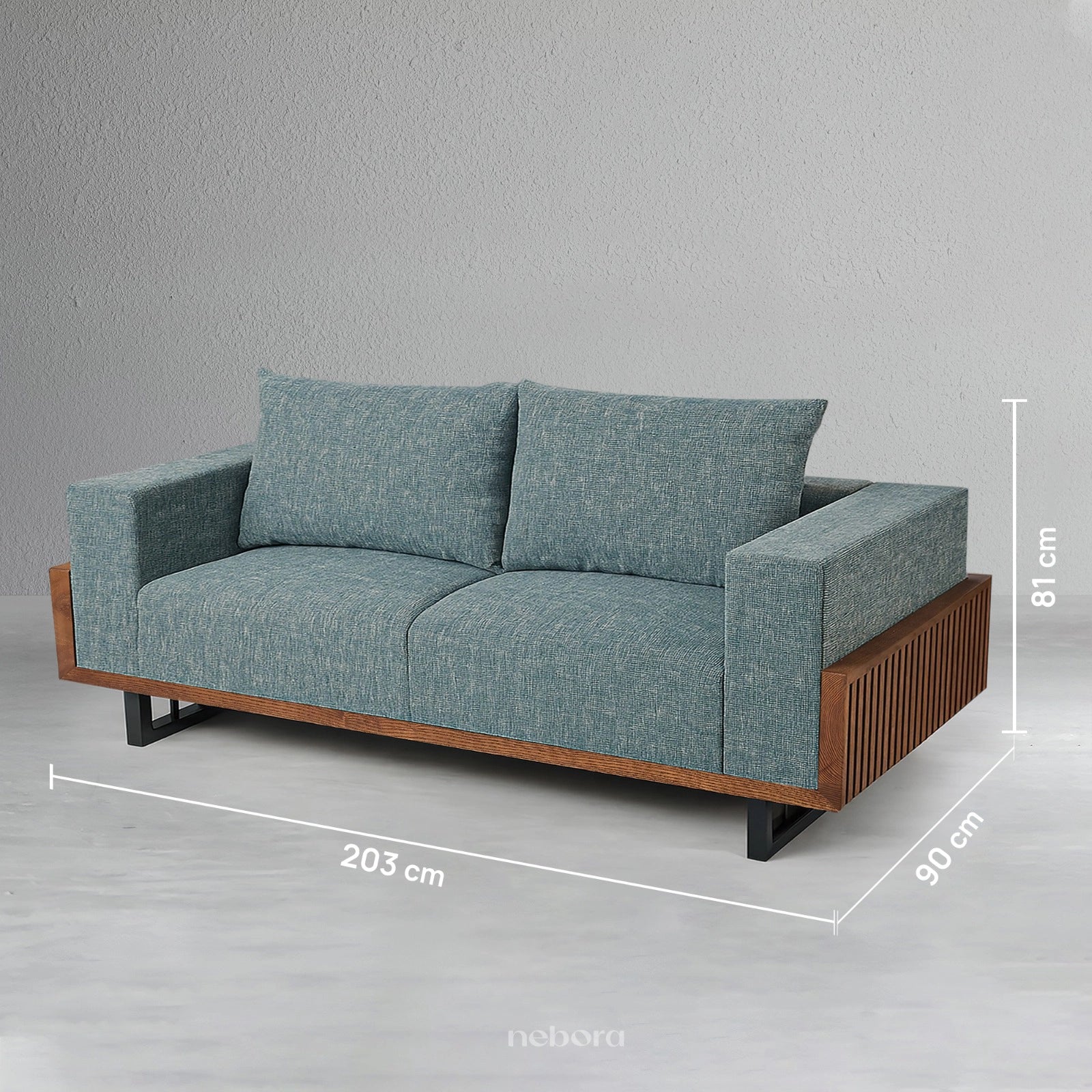 A perfect blend of comfort and architectural beauty. This three seater sofa, with its elegant wooden frame and textured teal upholstery, creates a personal haven for relaxation. Place it in your living room or study to create a stylish, quiet space where you can unwind and find a moment of peace.