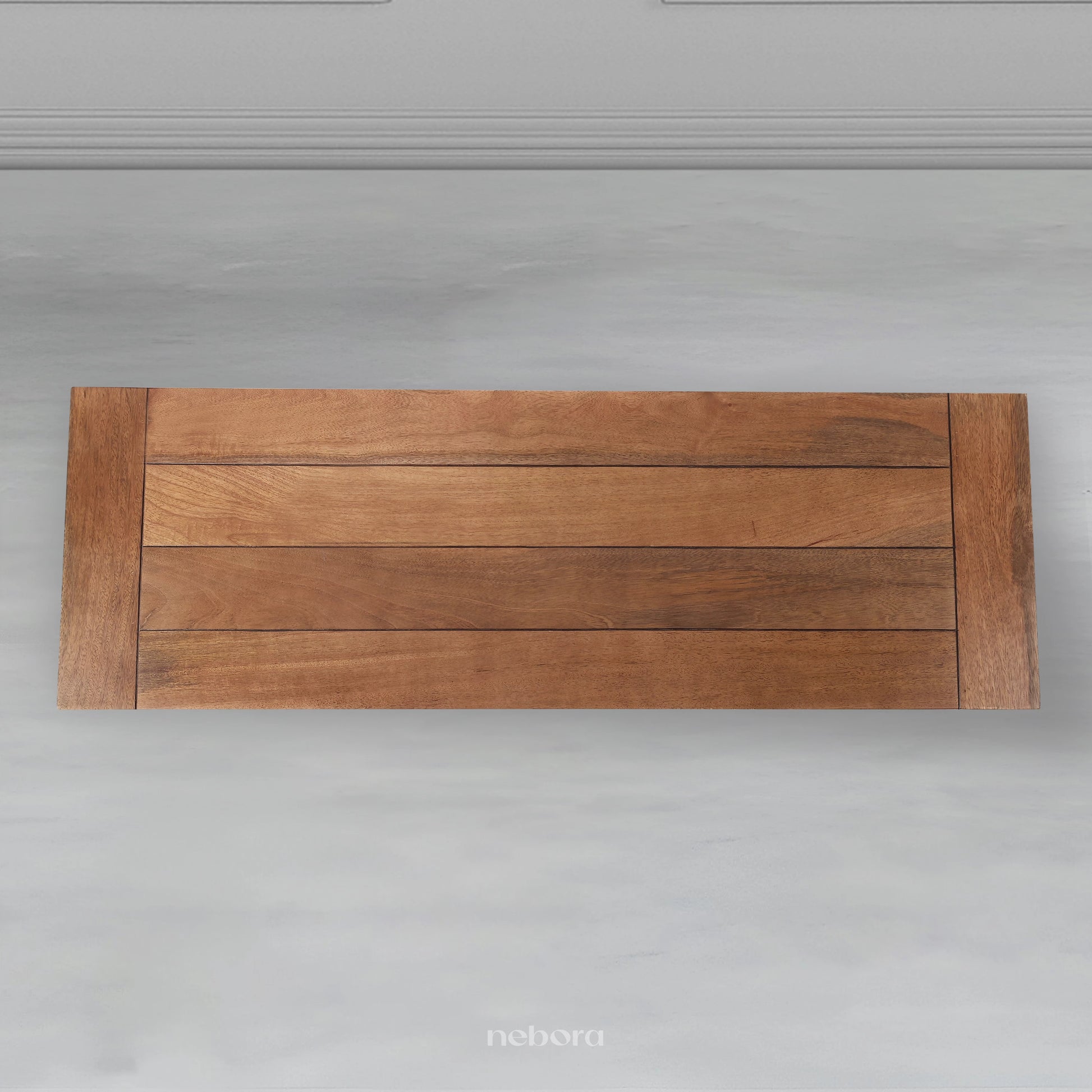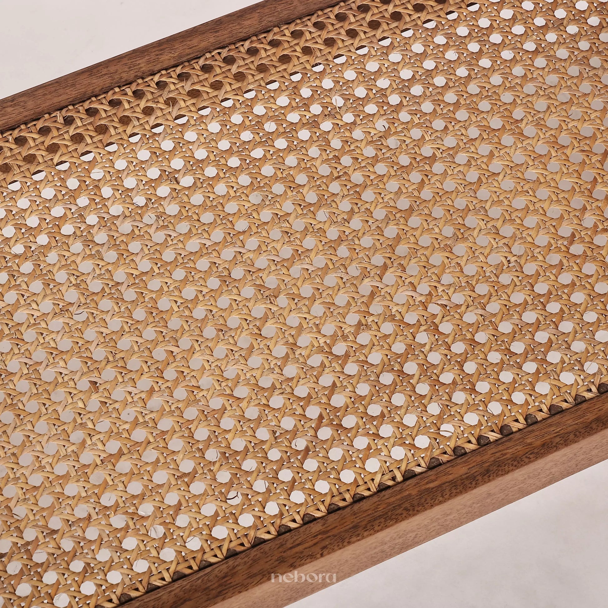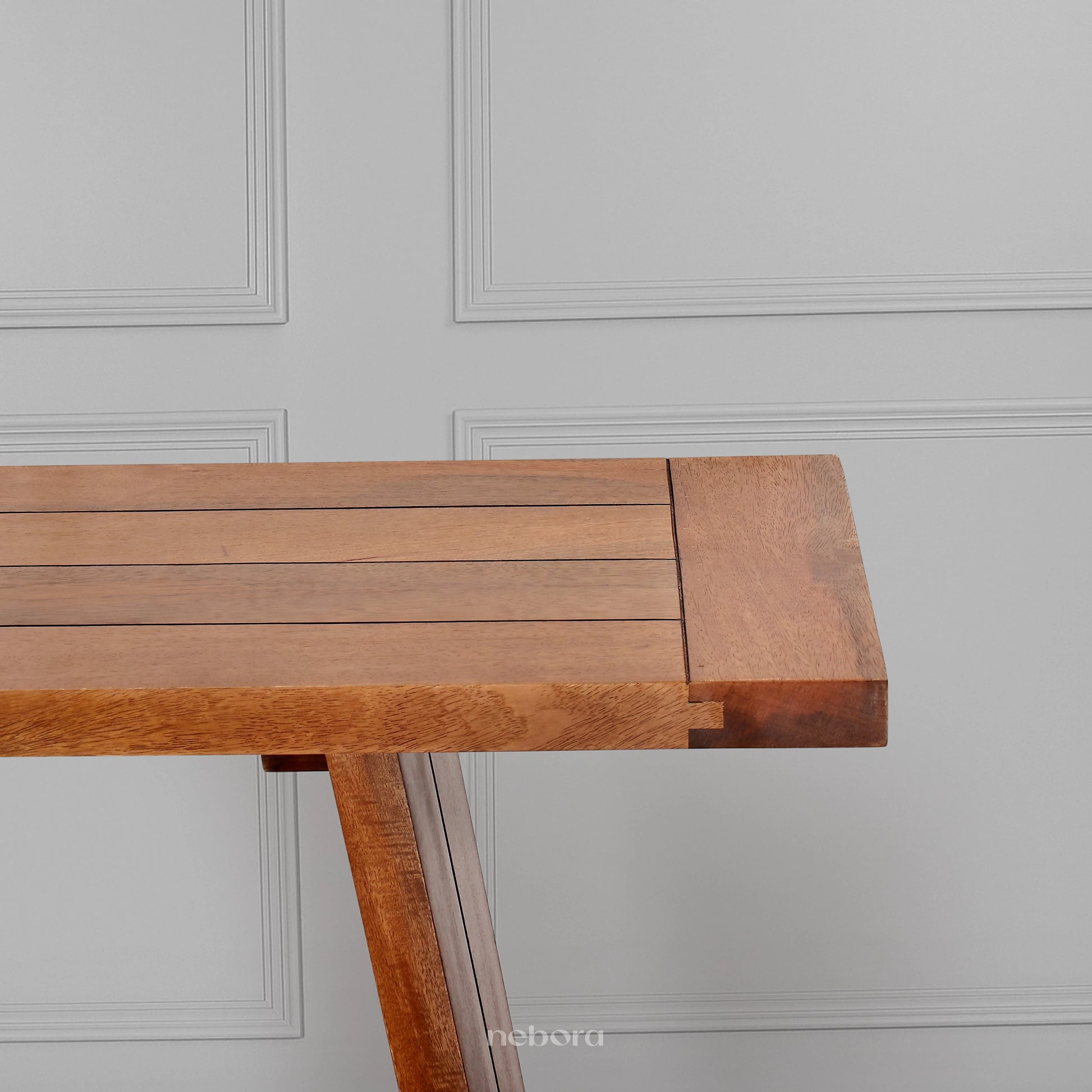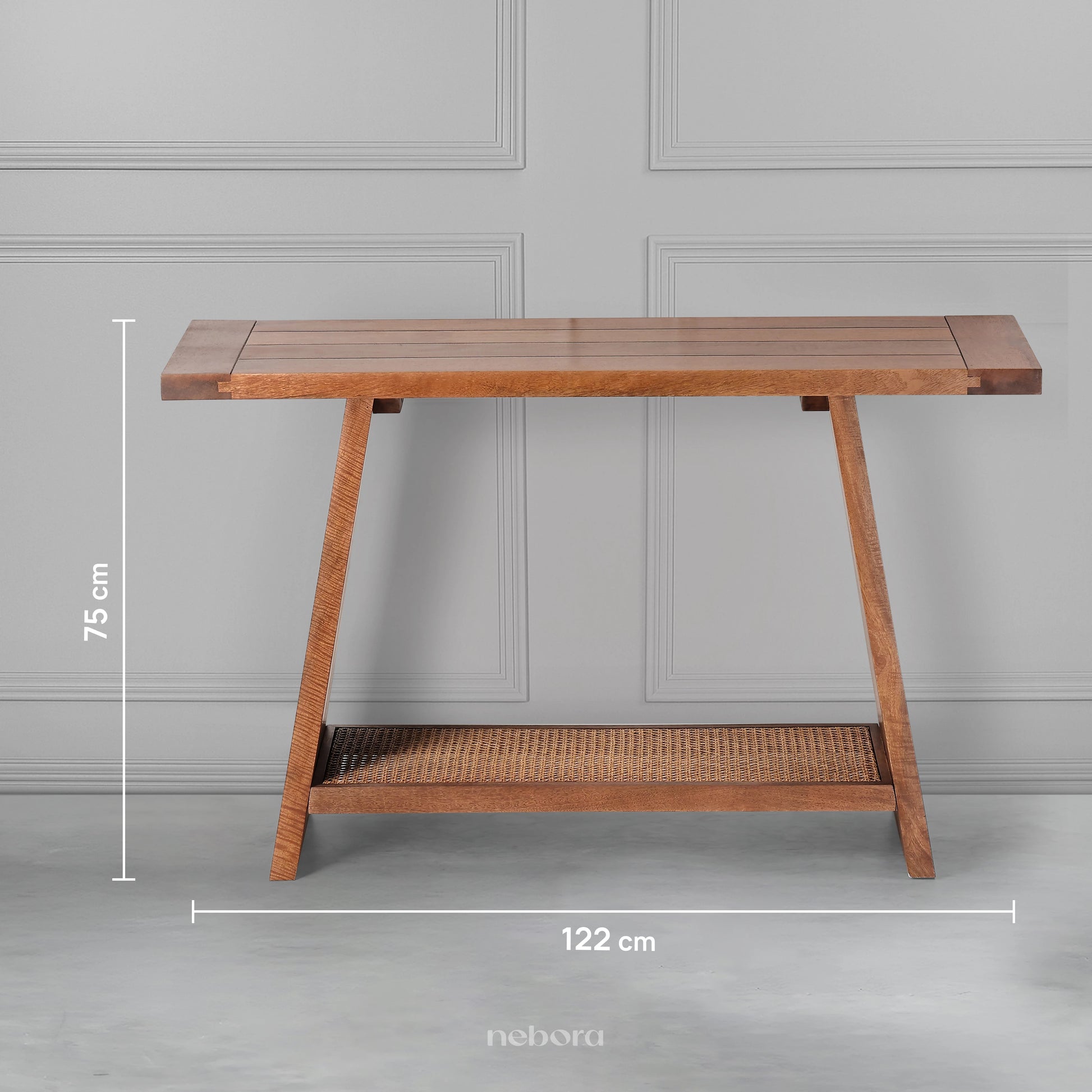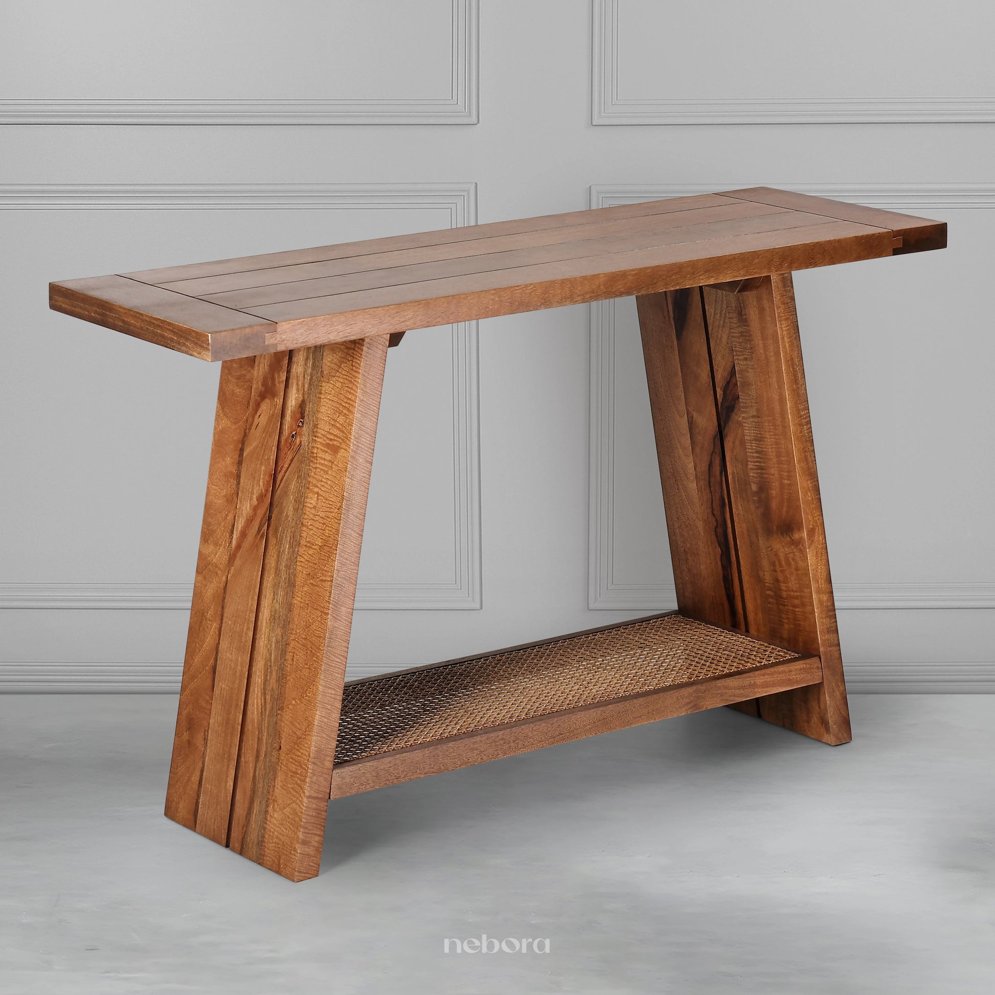 With its warm, natural wood finish and a beautifully woven cane shelf, this console table blends rustic charm with modern craftsmanship. The clean-lined A-frame silhouette gives it a light and airy feel, while the textural details create a sense of inviting warmth and handcrafted beauty. This piece is perfect for an entryway or behind a sofa, where it will serve as a welcoming hearth for displaying cherished items and infusing your home with a cozy, organic elegance.