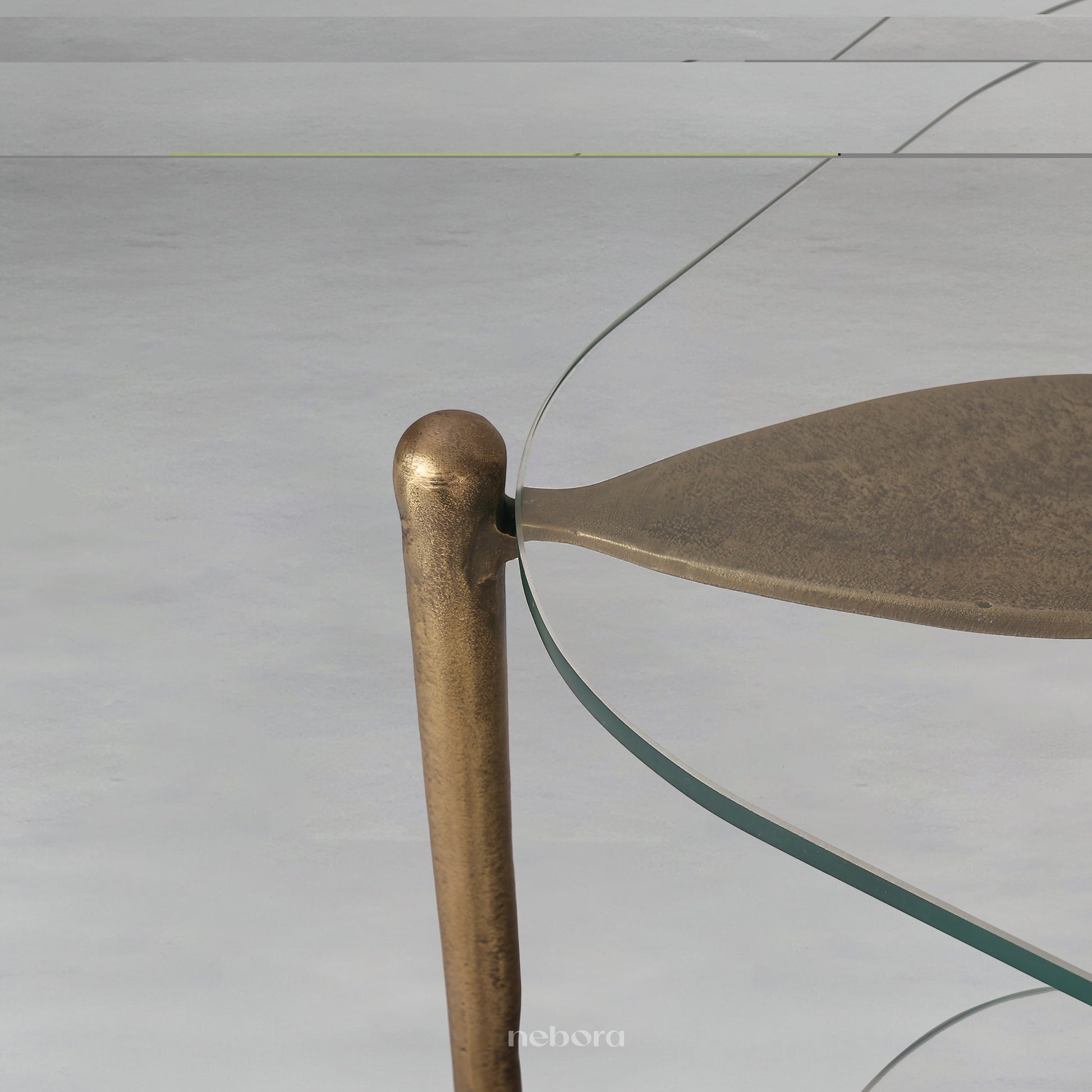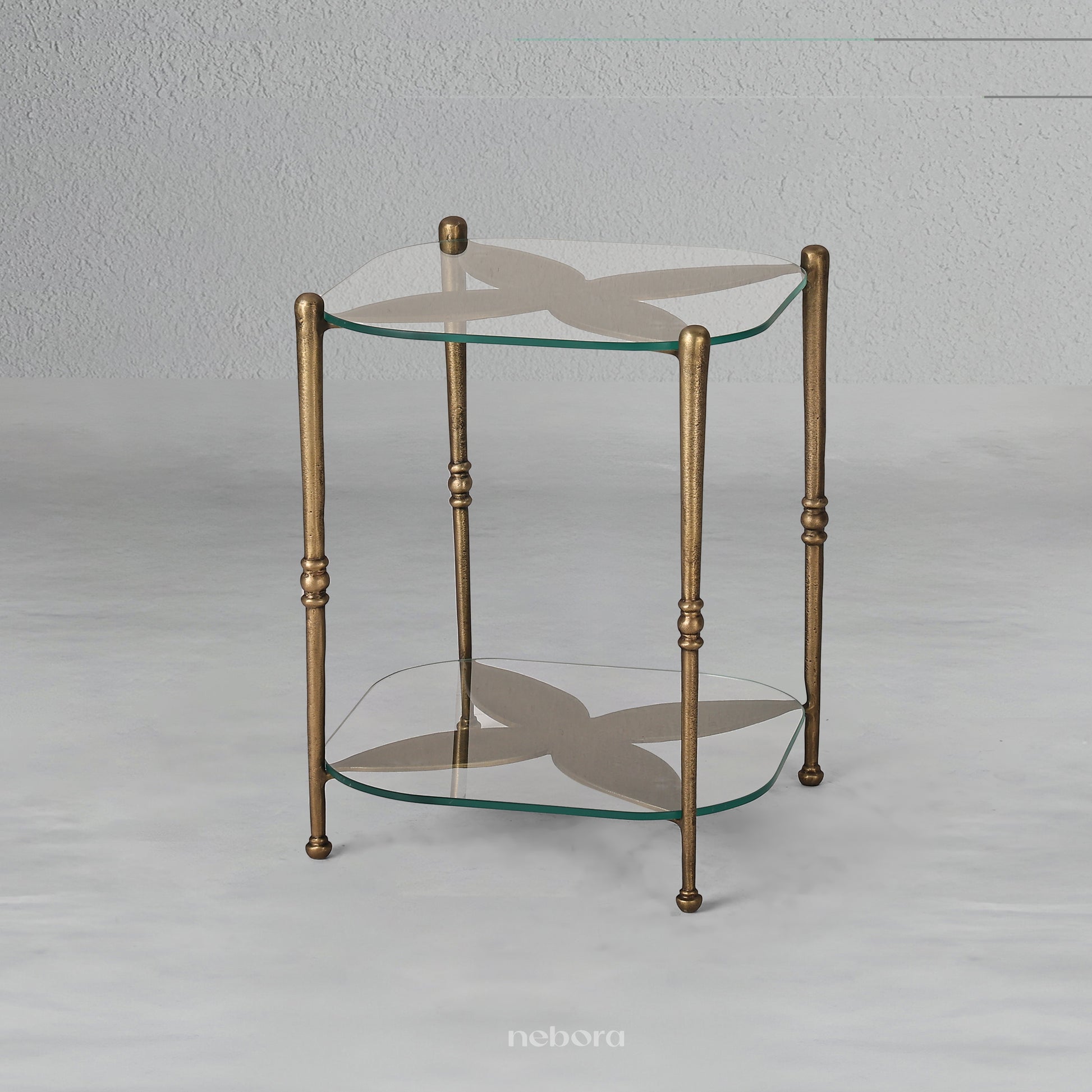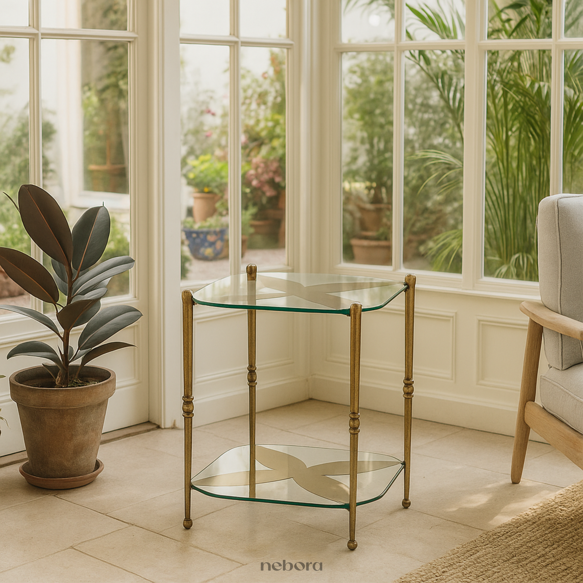 Crafted to capture and reflect light, this delicate piece creates a sense of airy sophistication. Its slender silhouette makes it an ideal complement to a minimalist reading nook or as a chic perch for a delicate vase and a lamp, inviting a serene and open atmosphere.