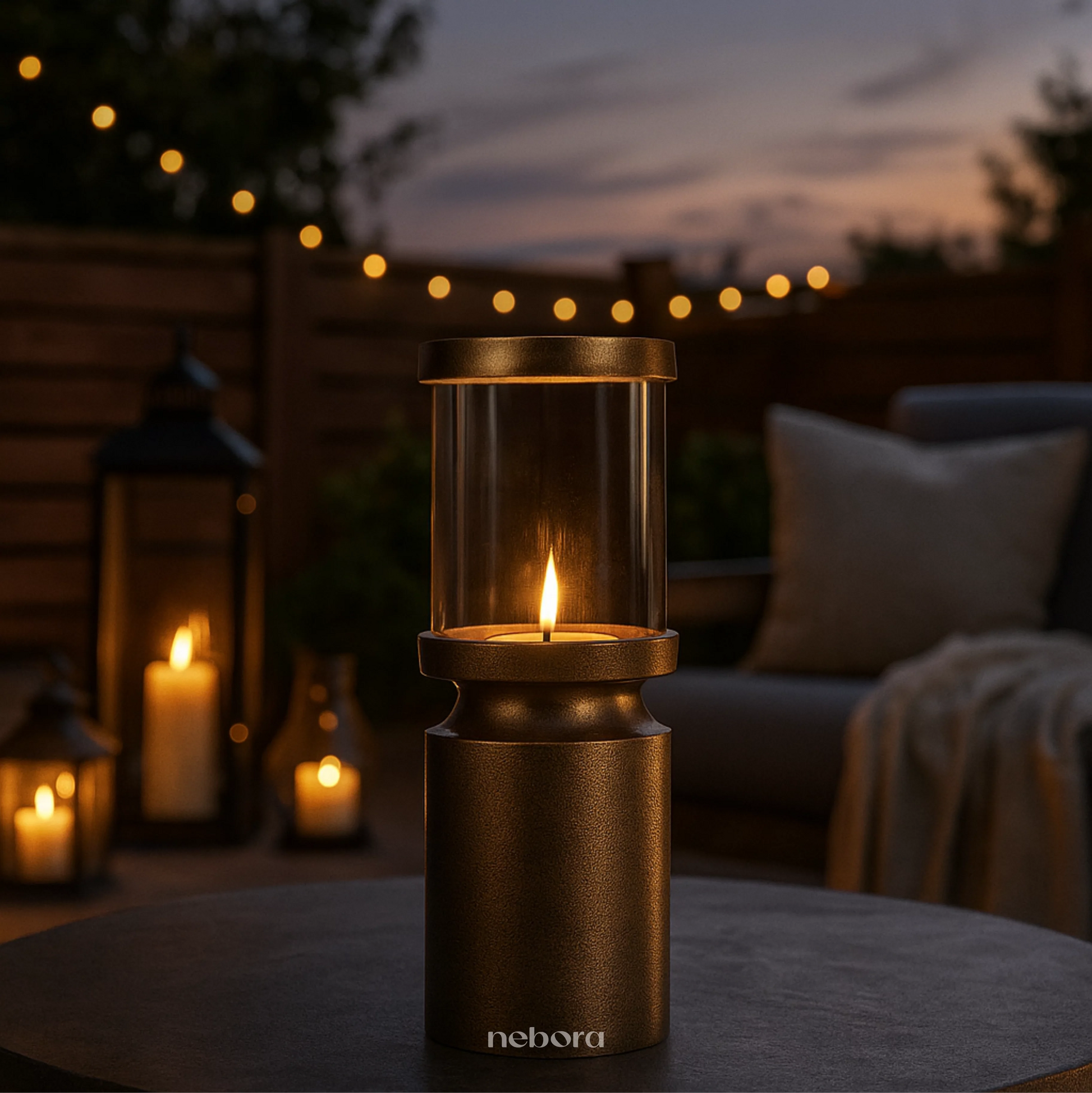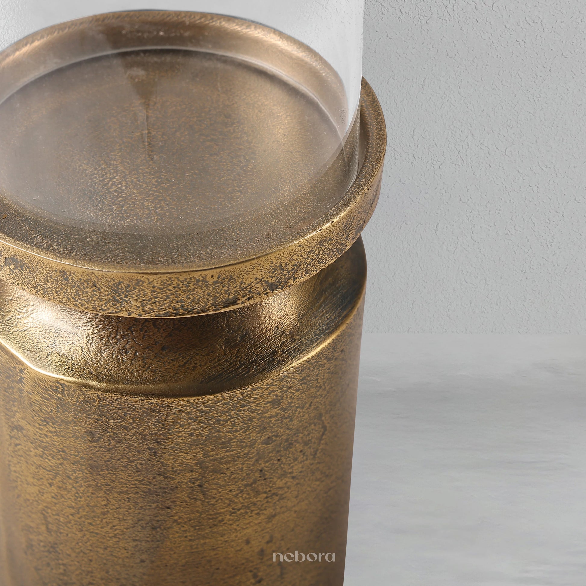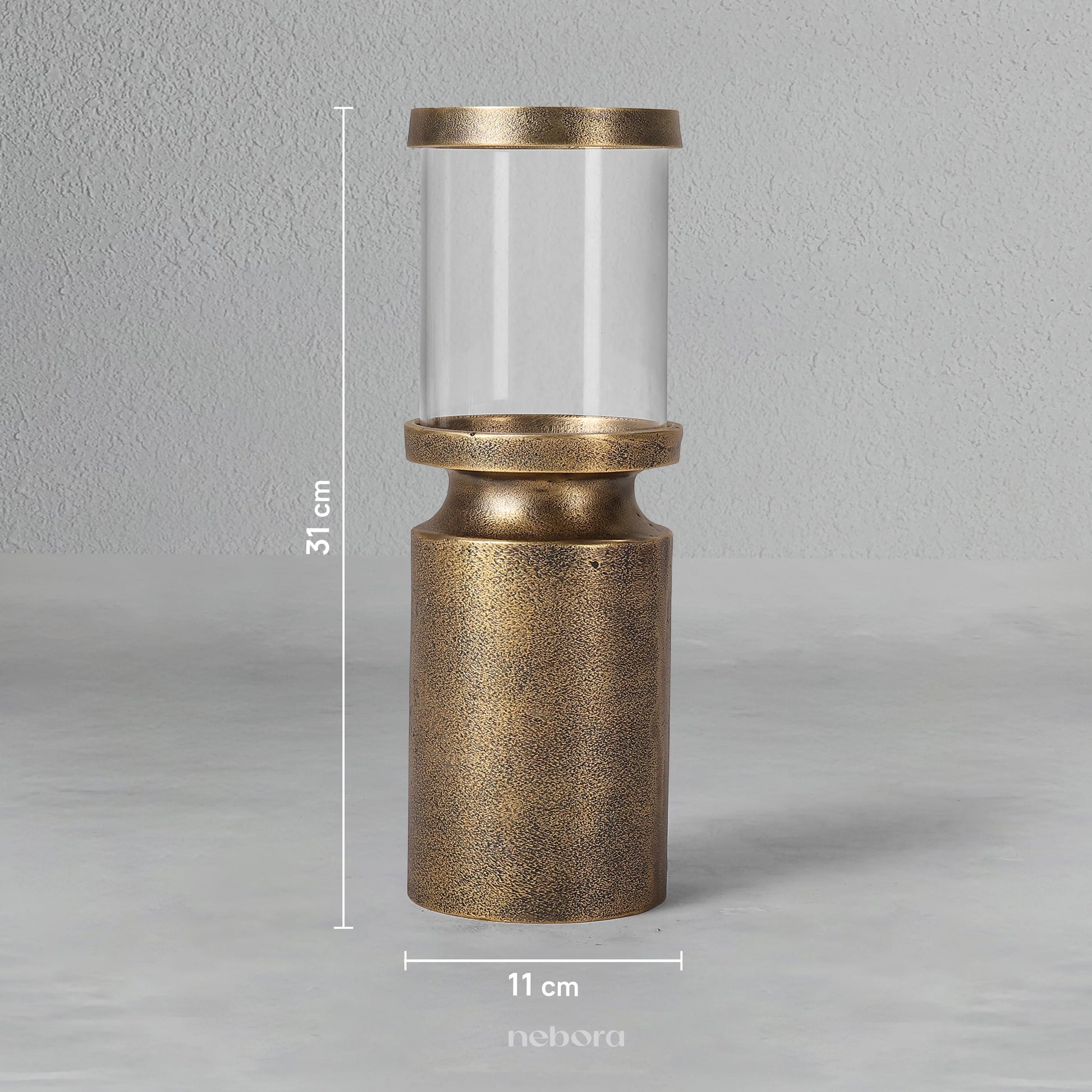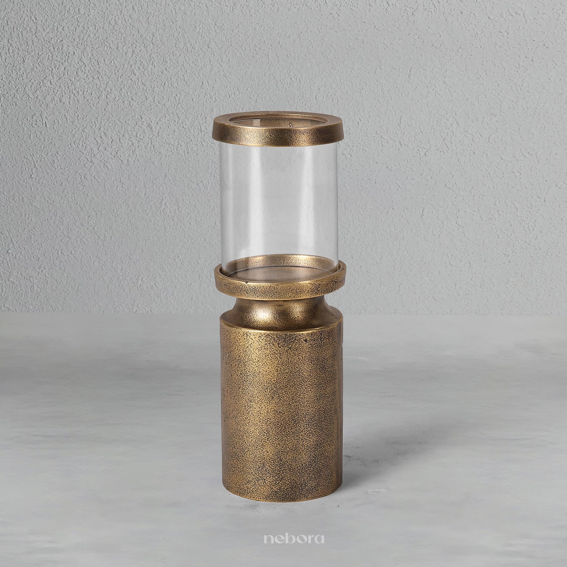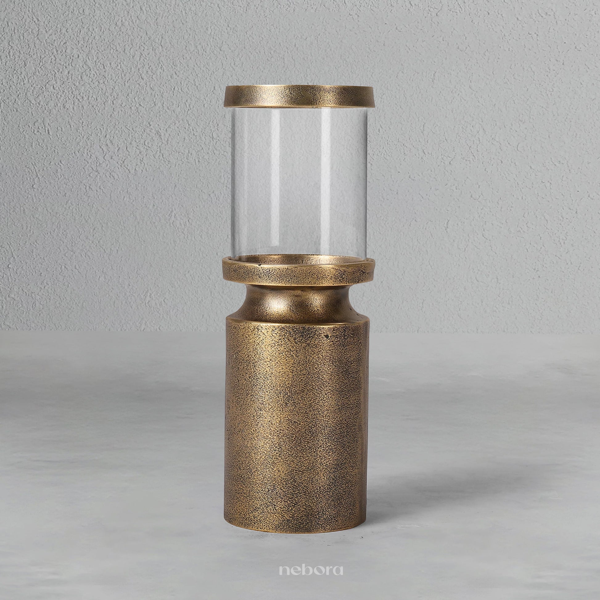 This hurricane holder is a vessel for light and warmth, designed to cradle a flame and cast a soft, inviting glow. Its aged, textured finish evokes a feeling of timeless comfort, creating a cozy and magical ambiance for an evening of quiet reflection.
