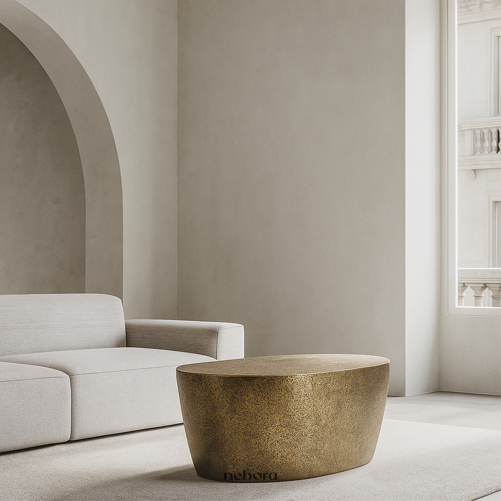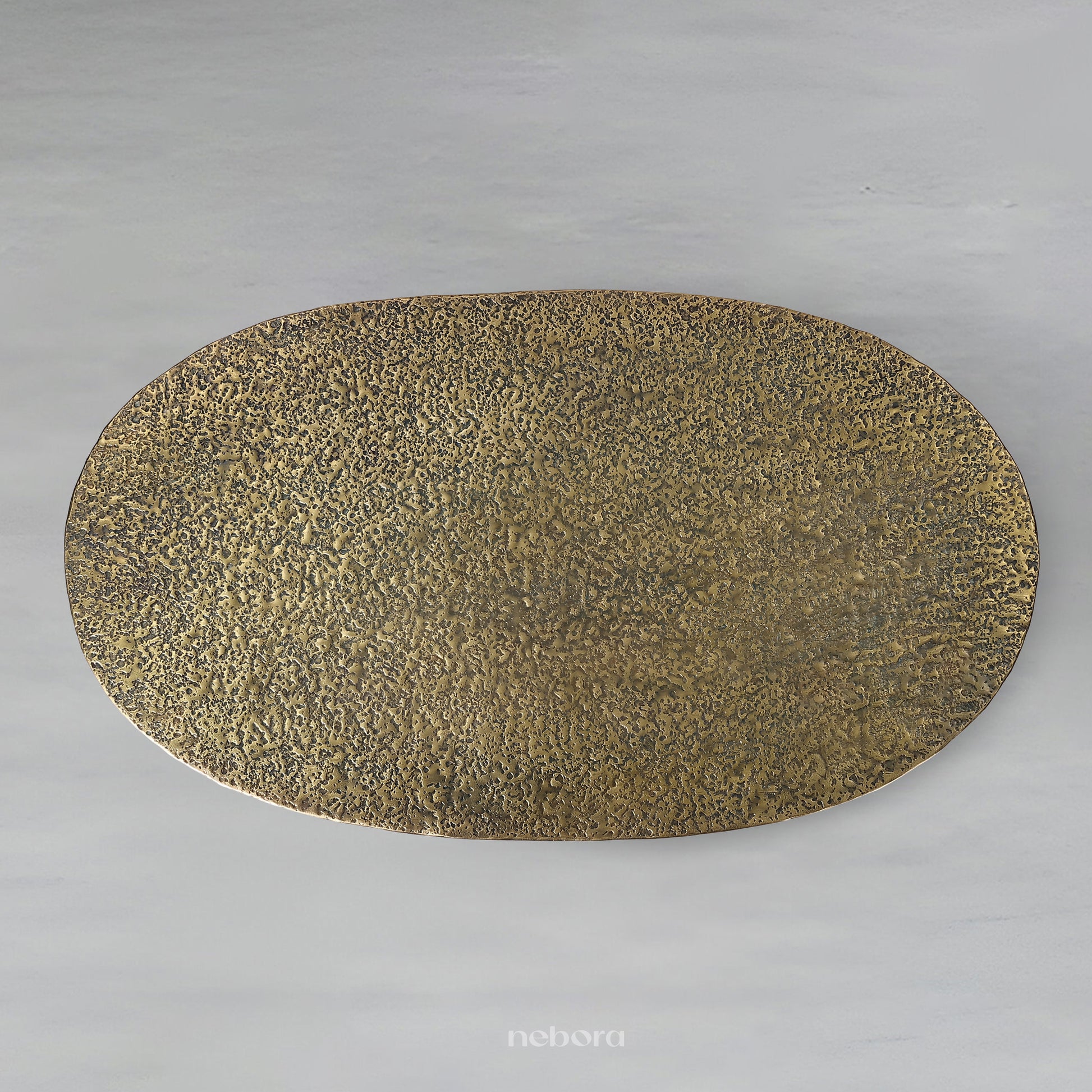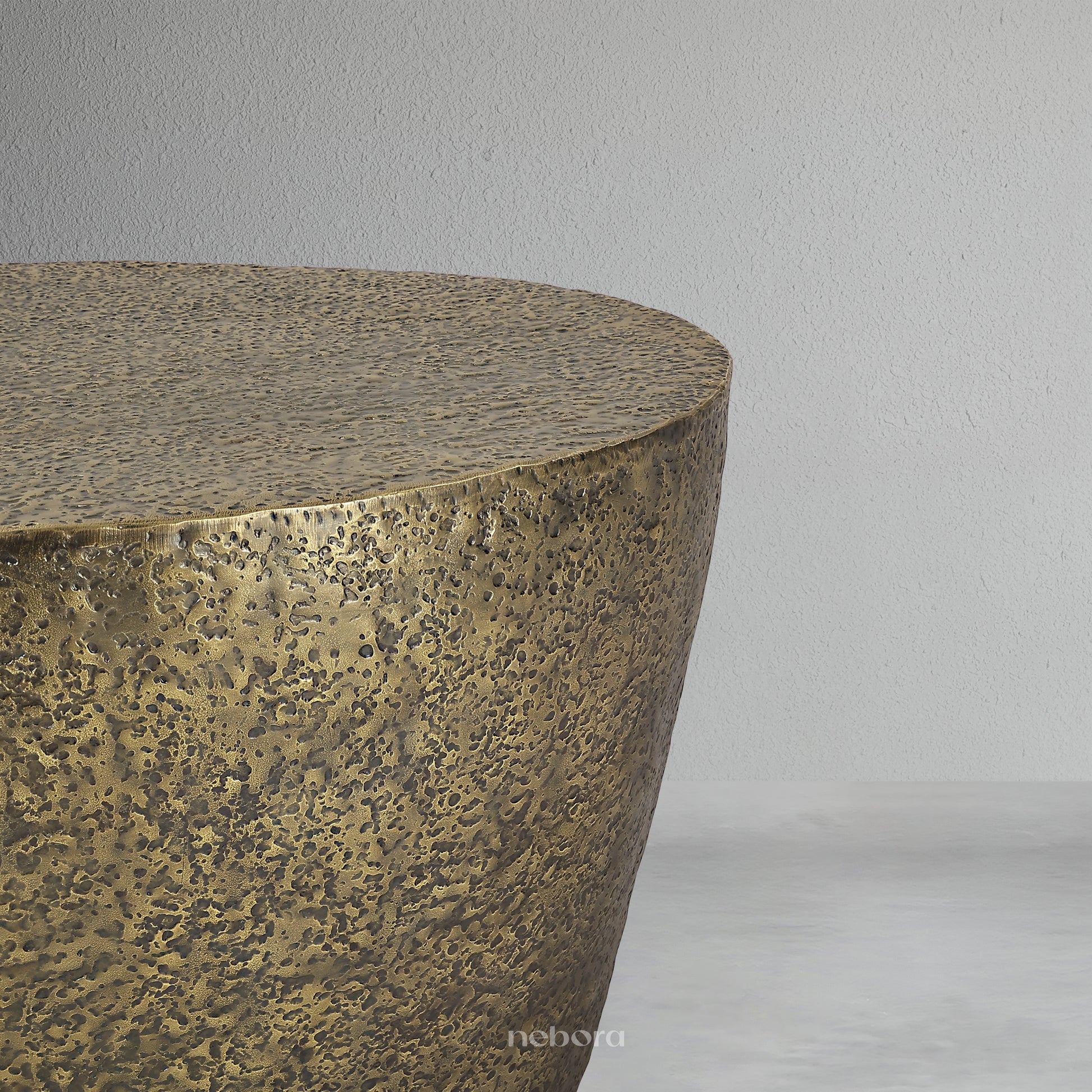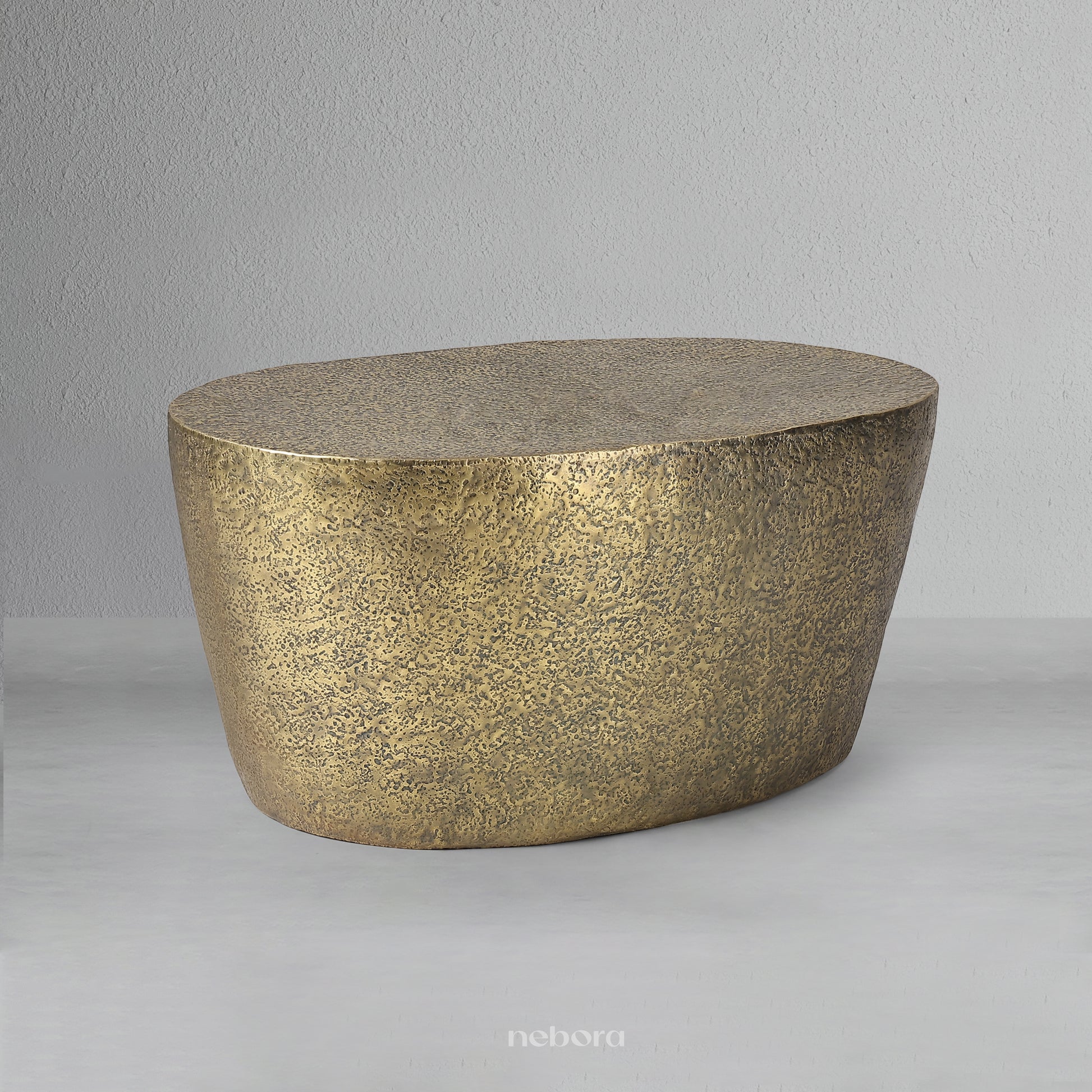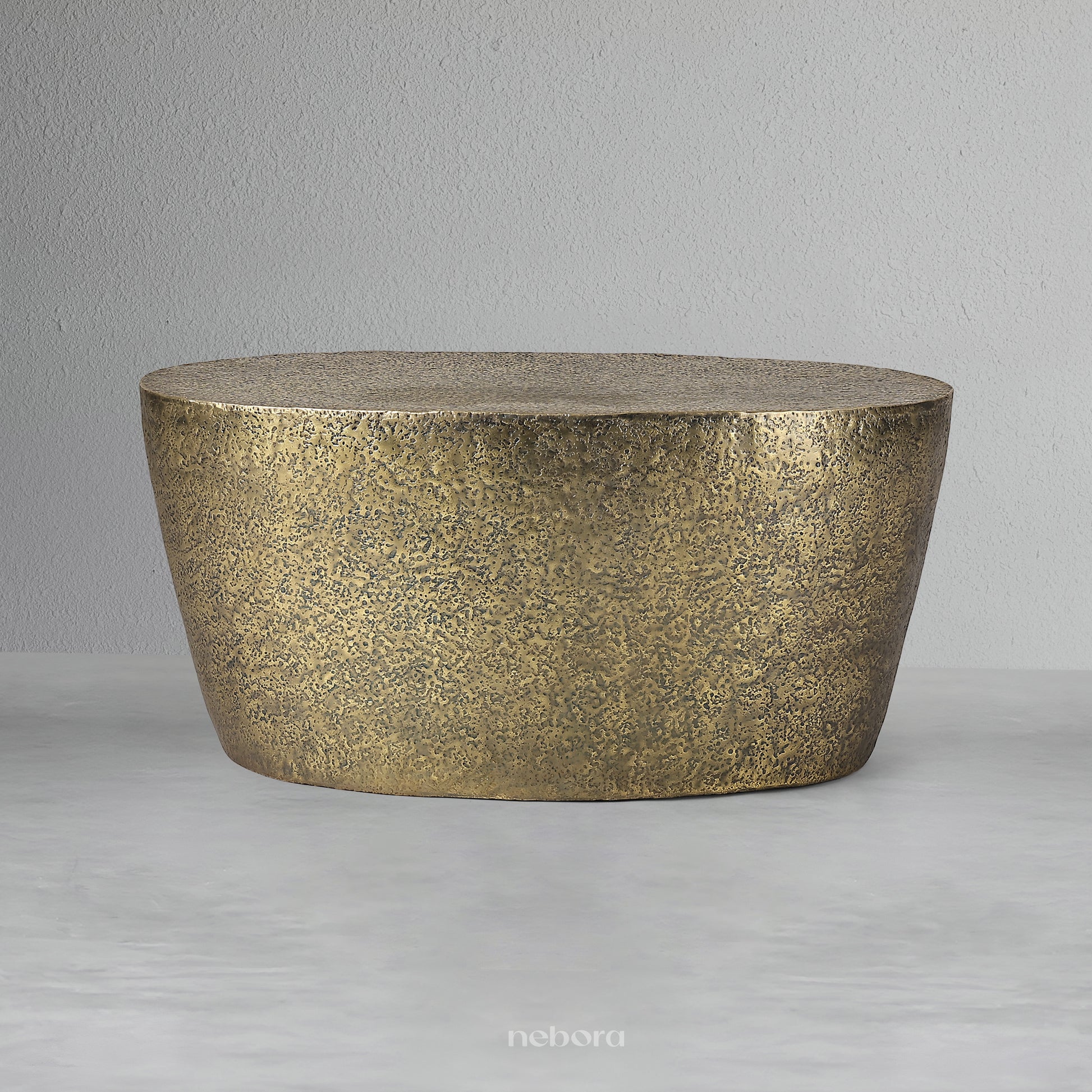 Discover a grounding presence and organic luxury with this captivating coffee table. Its substantial, yet elegantly tapered form and richly textured, antiqued brass finish evoke a feeling of natural artistry and enduring warmth. Perfect for anchoring a spacious living room, it invites gathering and conversation around its unique, tactile surface.