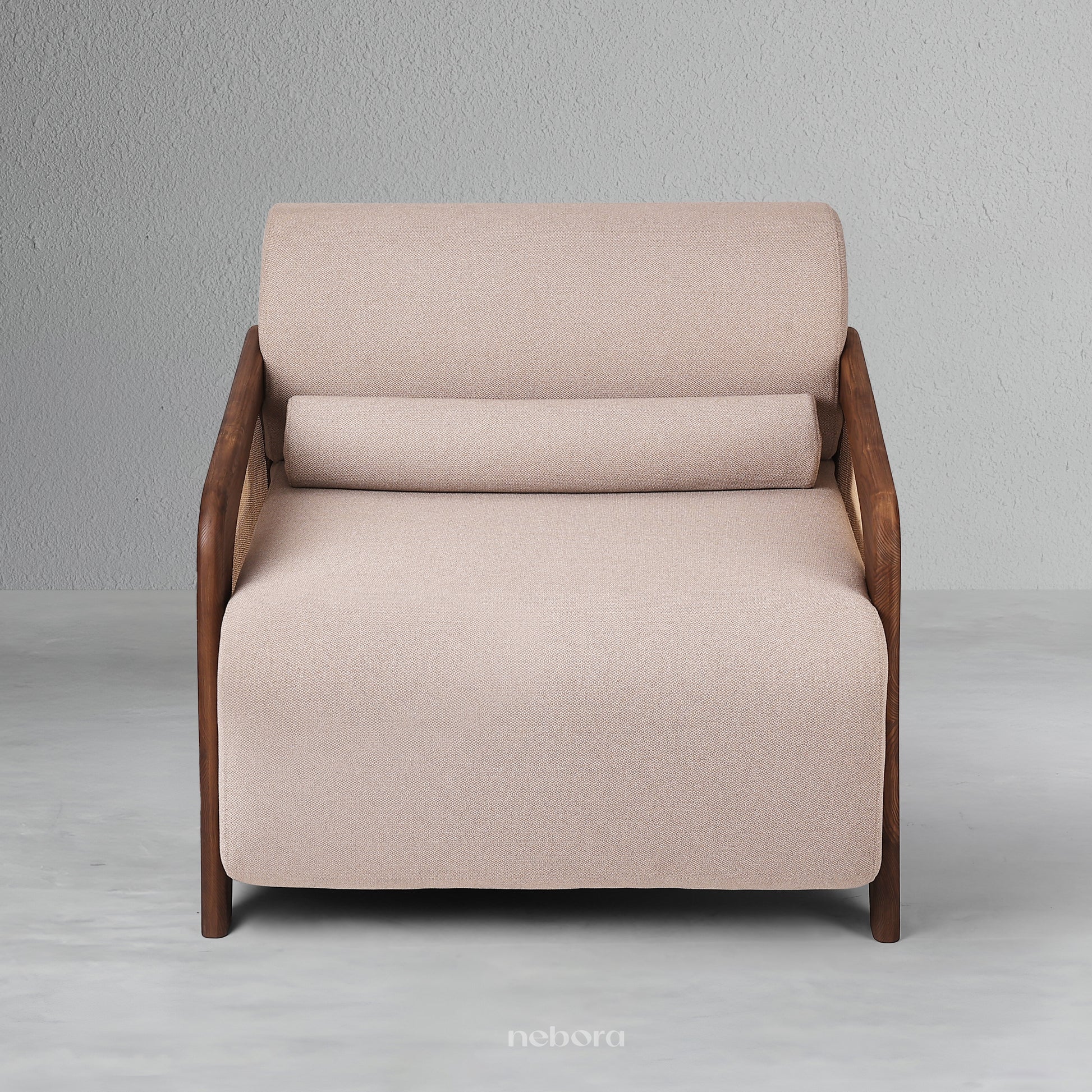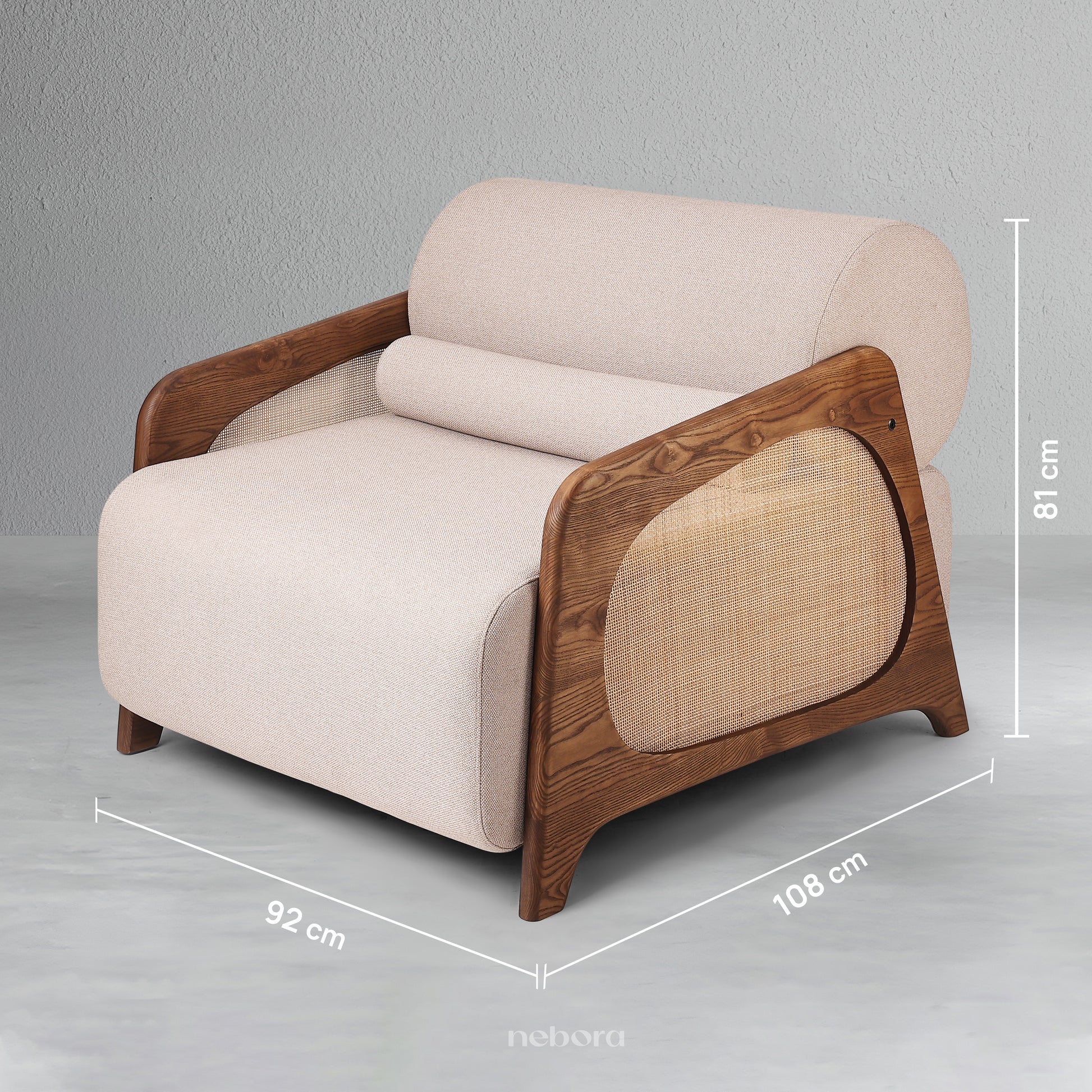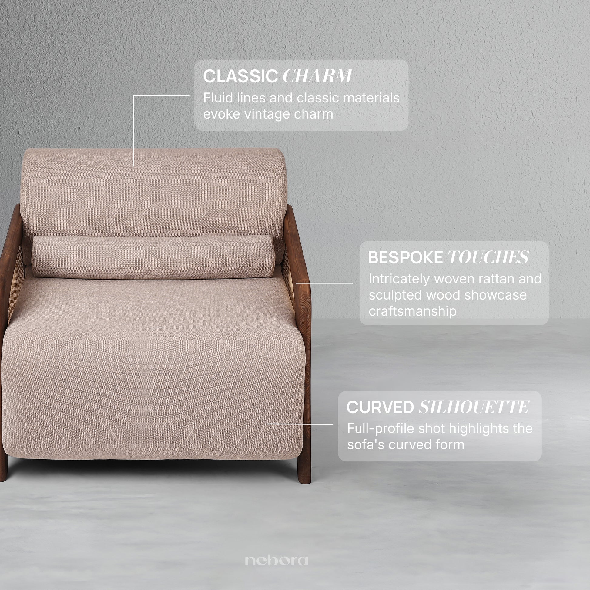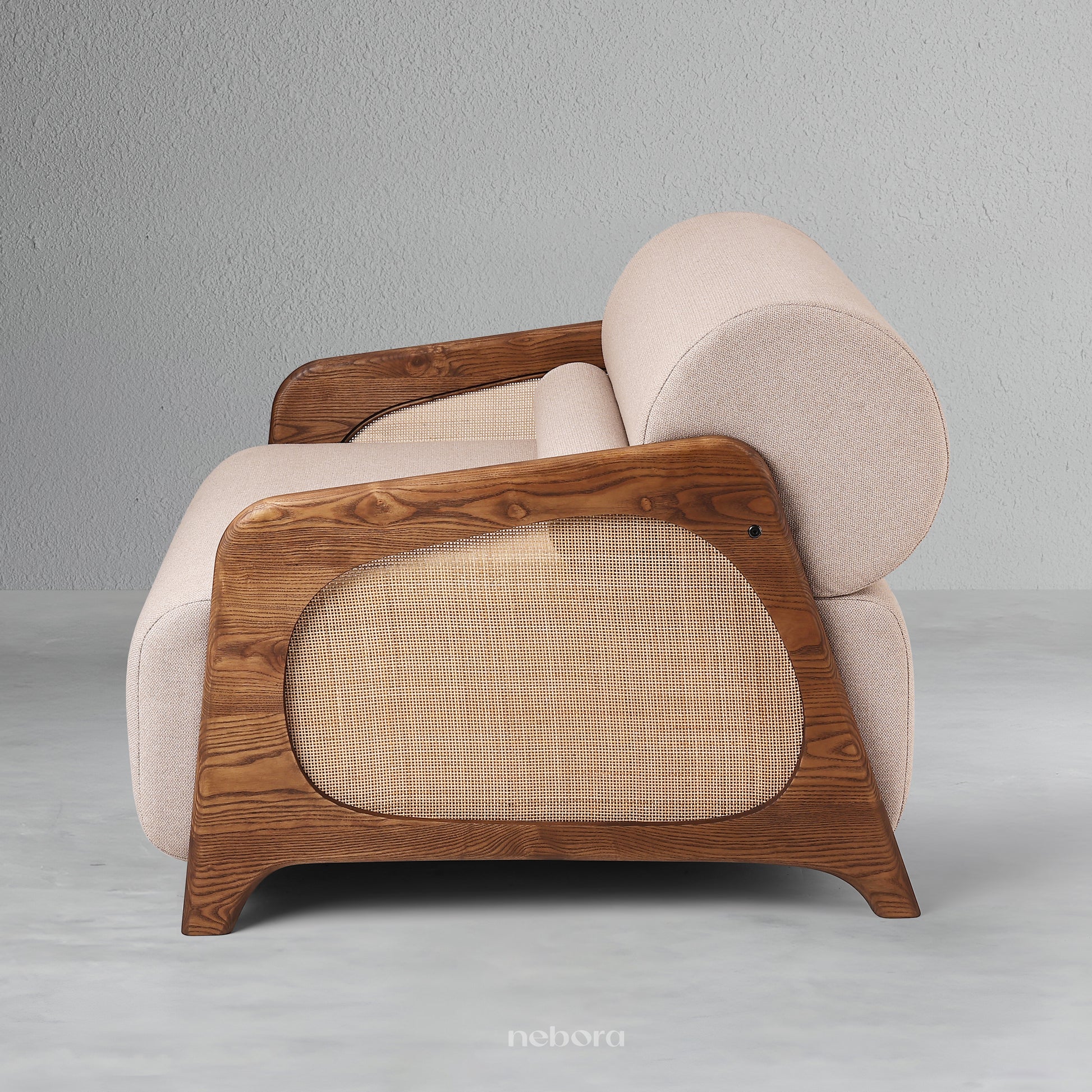 Feel the elegant embrace of a design that connects you to nature. The unique, flowing lines of the wooden frame and the tactile rattan side panels create a sense of organic harmony. This sofa isn't just a place to sit, it's a sculptural piece that beckons you to unwind, reflect and enjoy the beautiful simplicity of a moment to yourself.