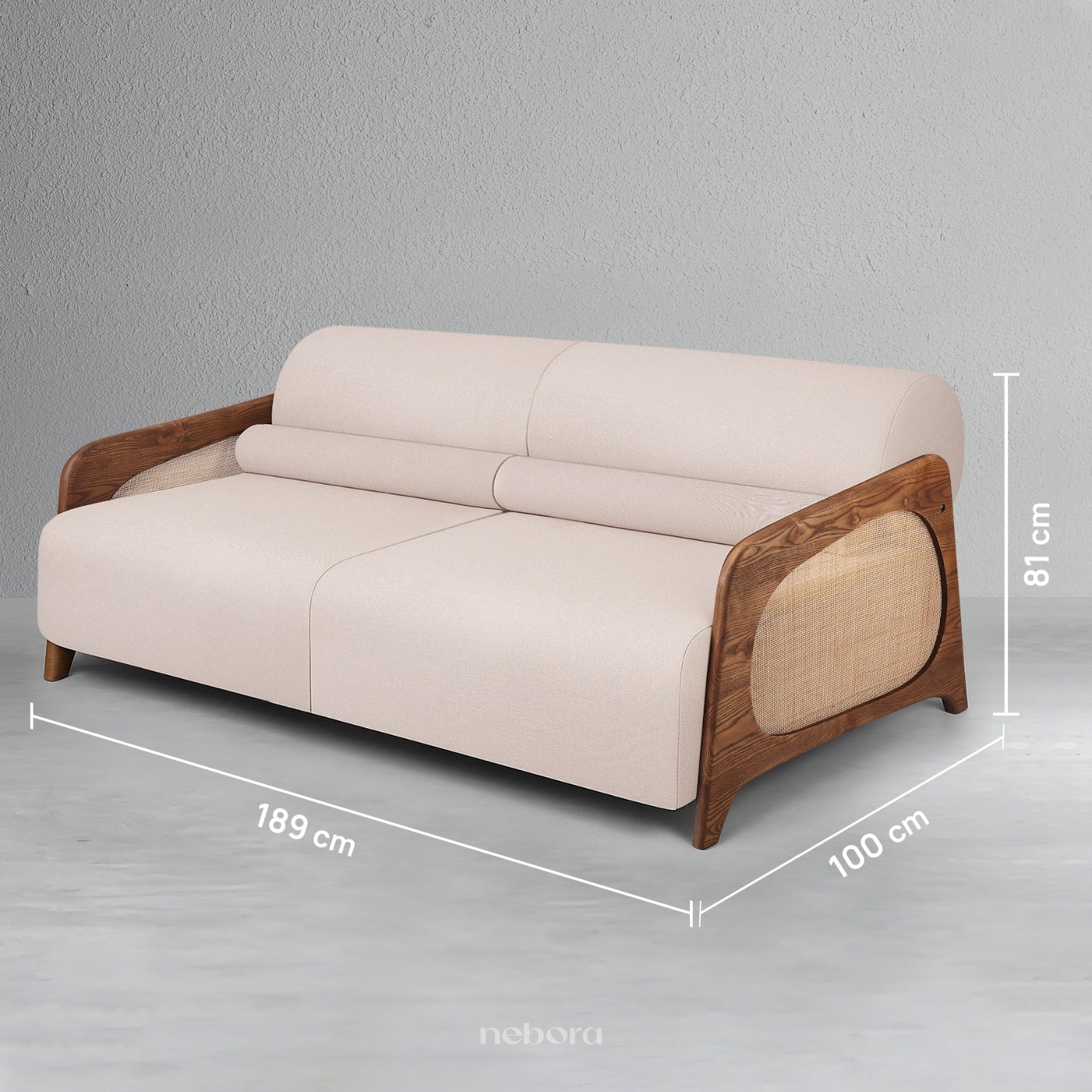 Feel the elegant embrace of a design that connects you to nature. The unique, flowing lines of the wooden frame and the tactile rattan side panels create a sense of organic harmony. This sofa isn't just a place to sit, it's a sculptural piece that beckons you to unwind, reflect and enjoy the beautiful simplicity of a moment to yourself.