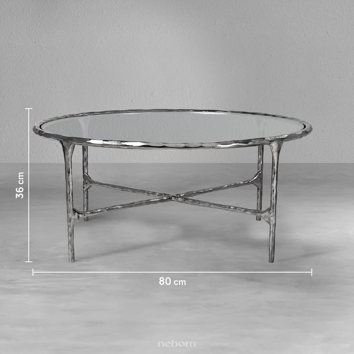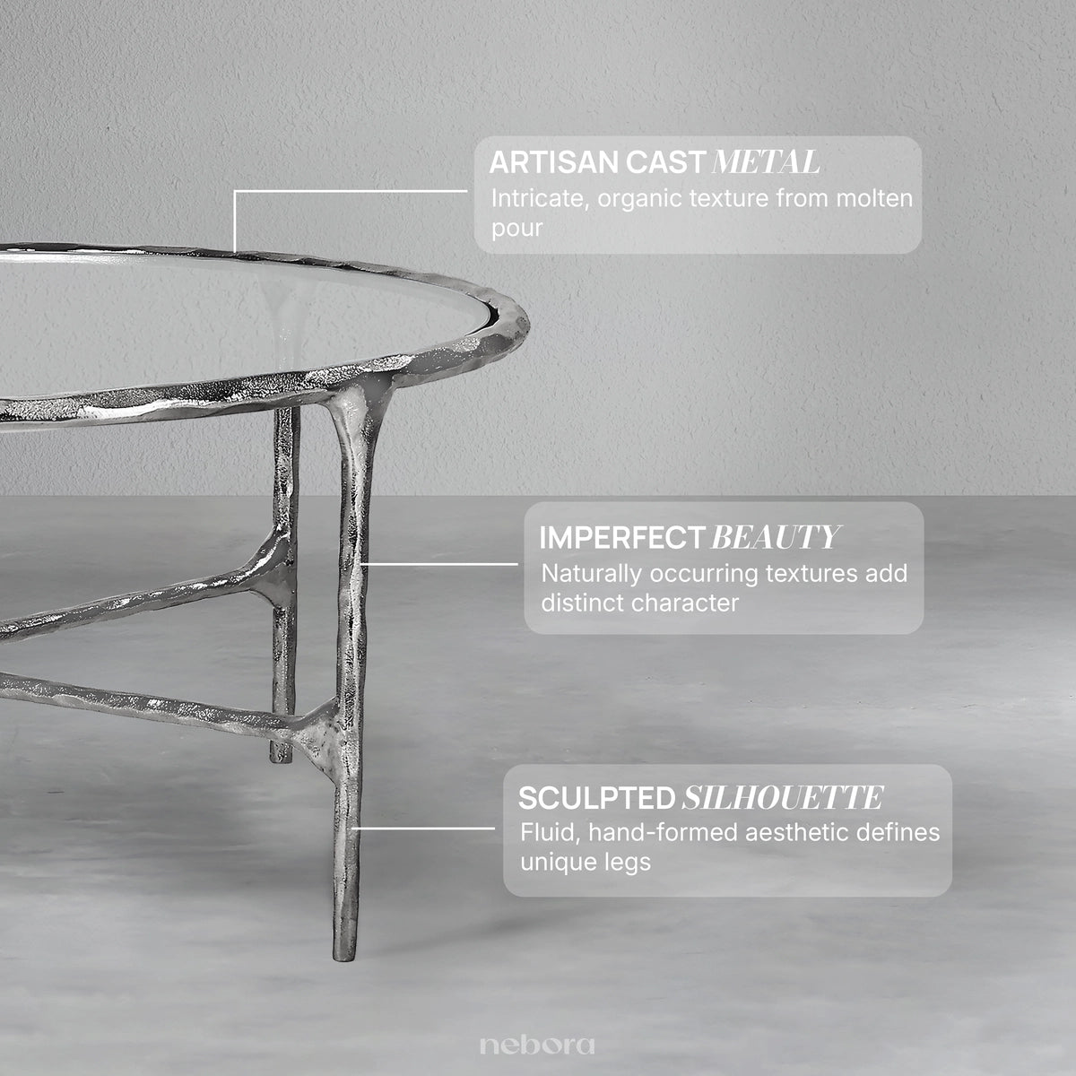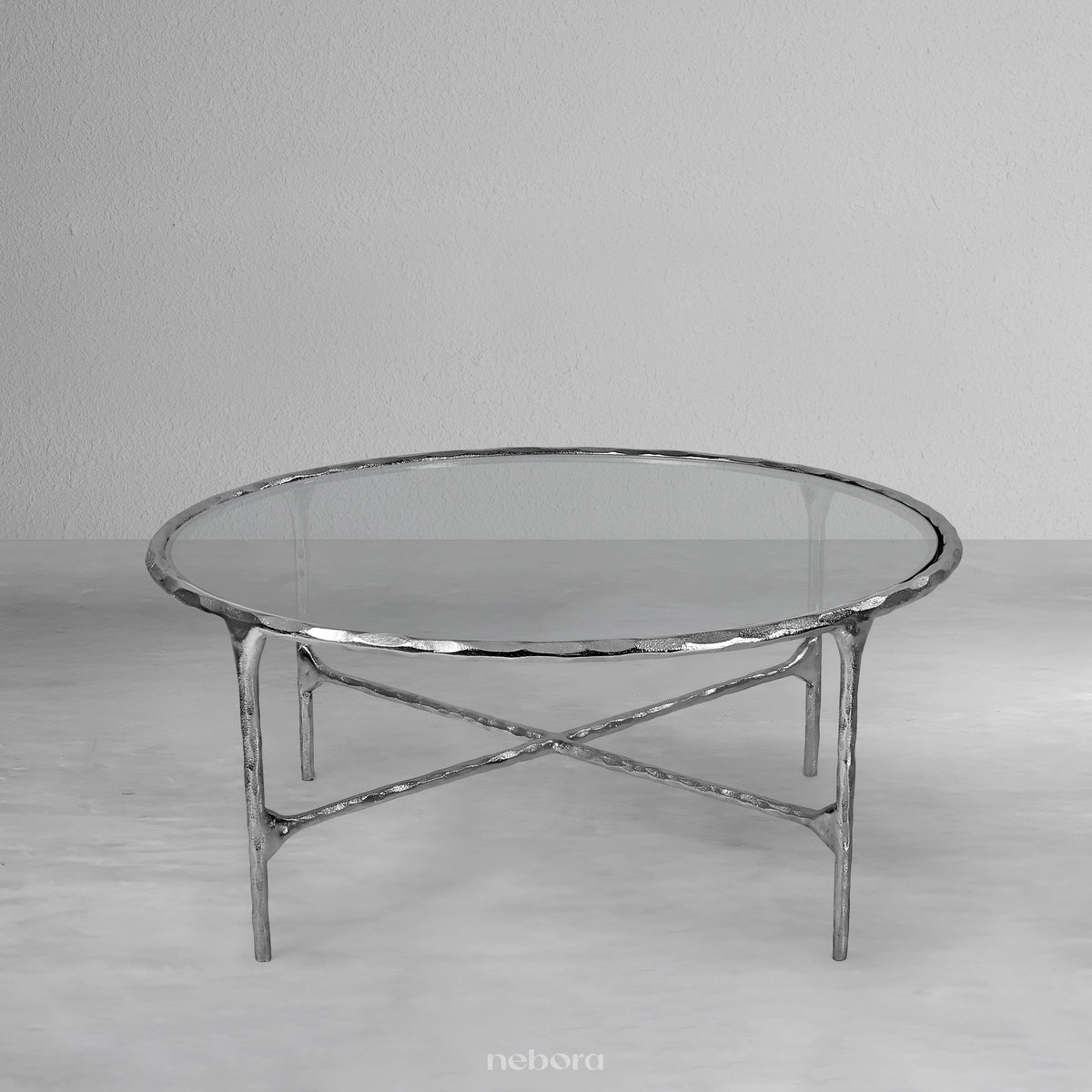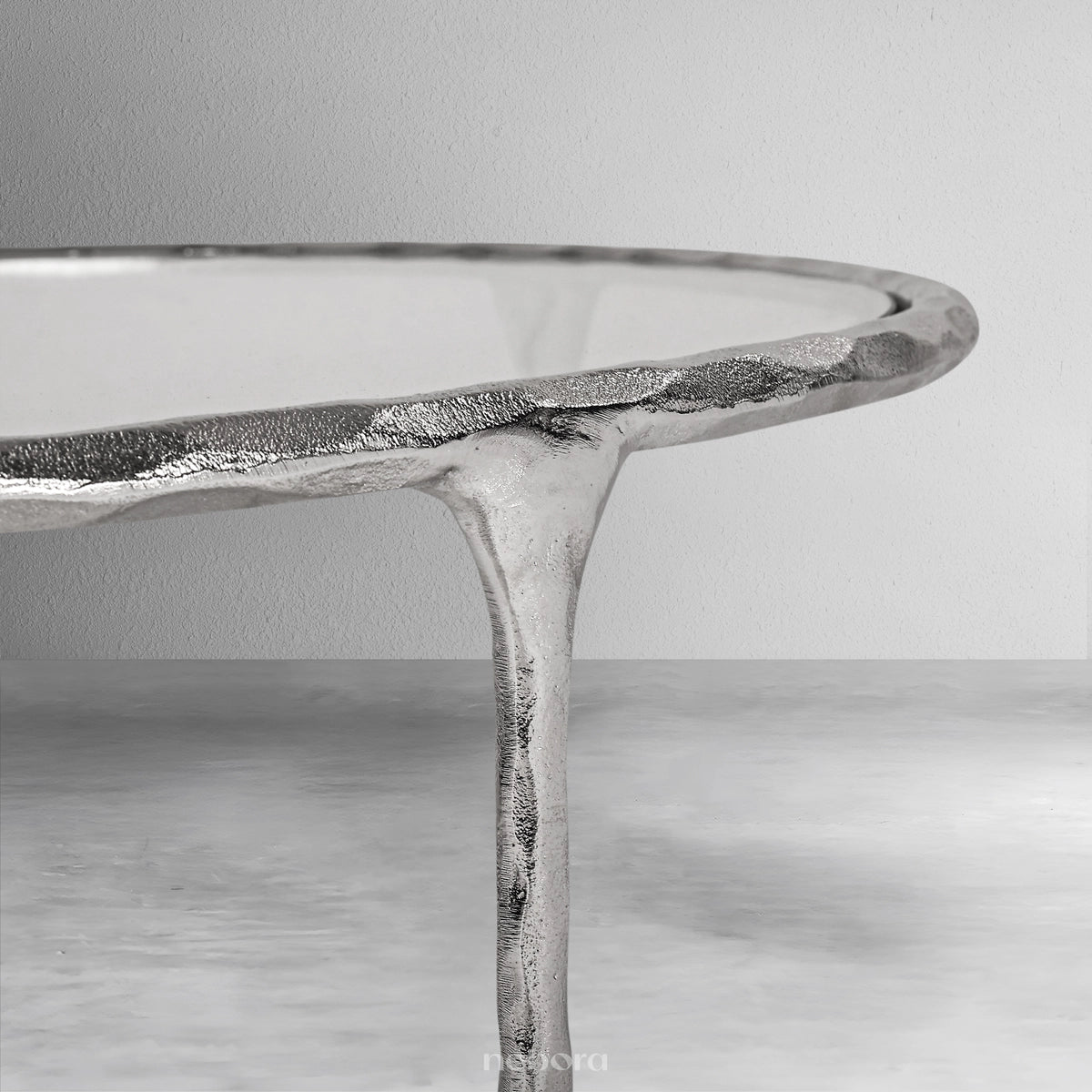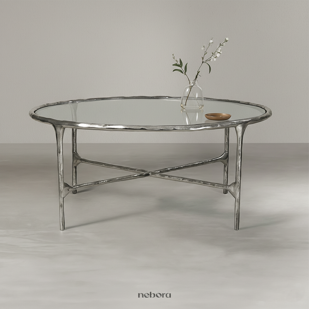 With its rugged, hand-forged frame and a captivating hammered texture, the "Lunar Hammered Coffee Table" is a stunning fusion of organic artistry and modern elegance. The cool, silvery finish and sleek glass top create a feeling of sophisticated contrast, making it a powerful centerpiece. This table is a perfect anchor for a living room, adding a unique, earthy yet refined character to your space.