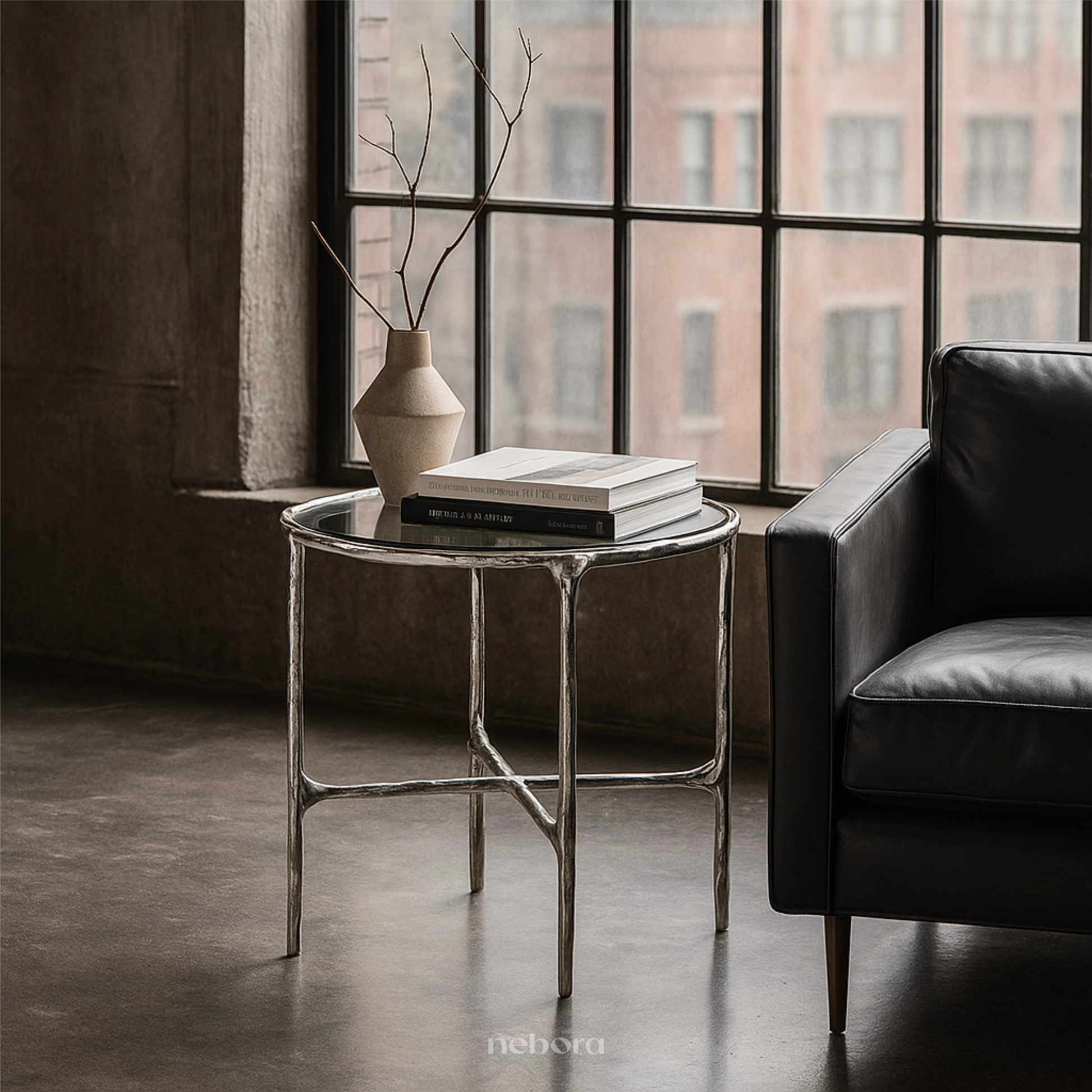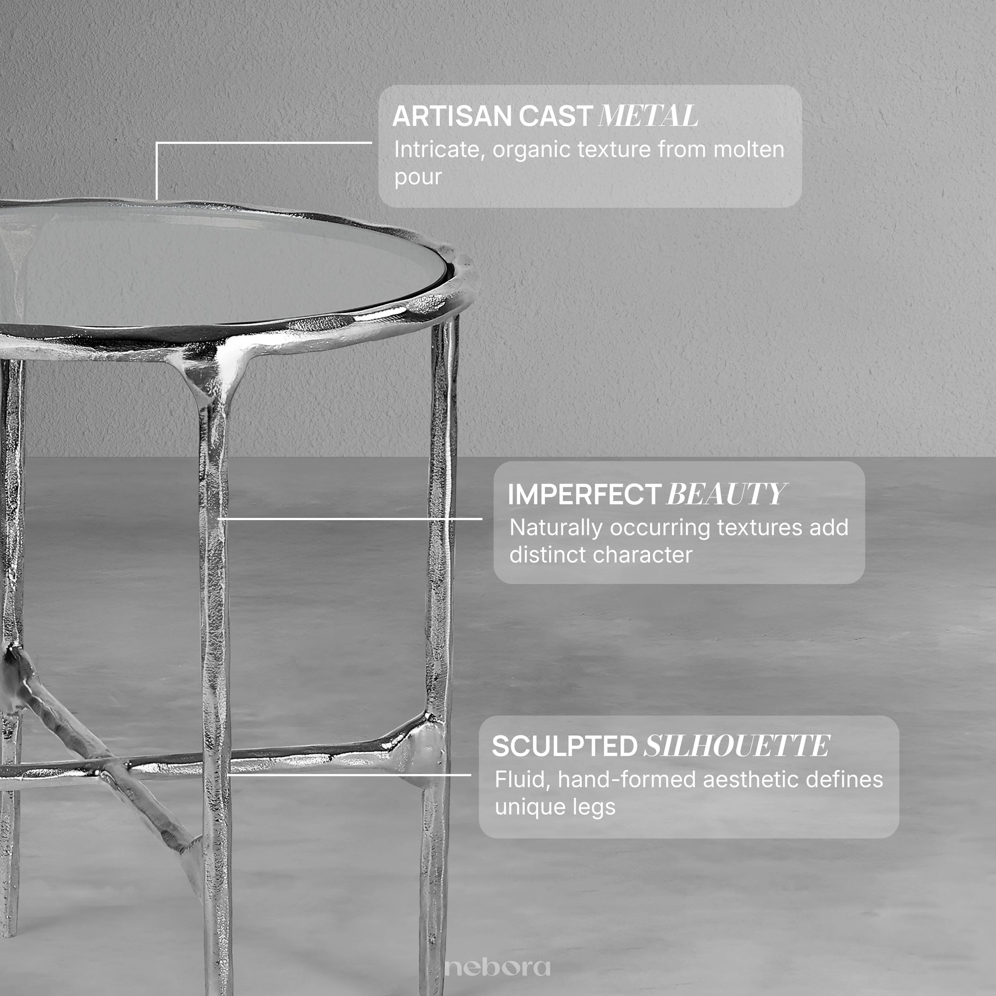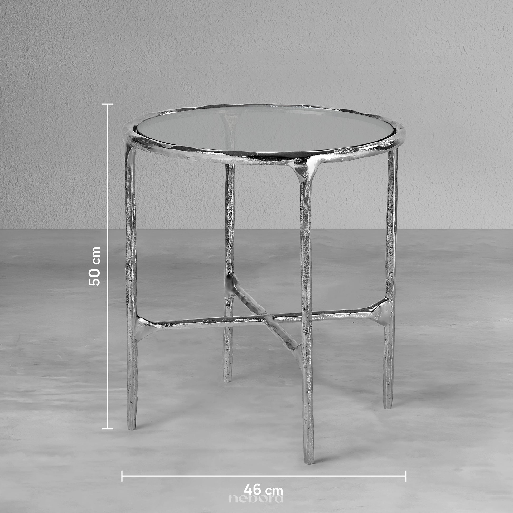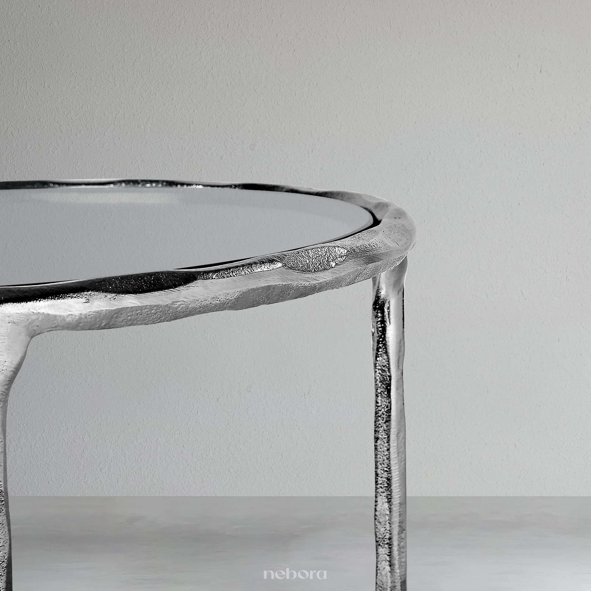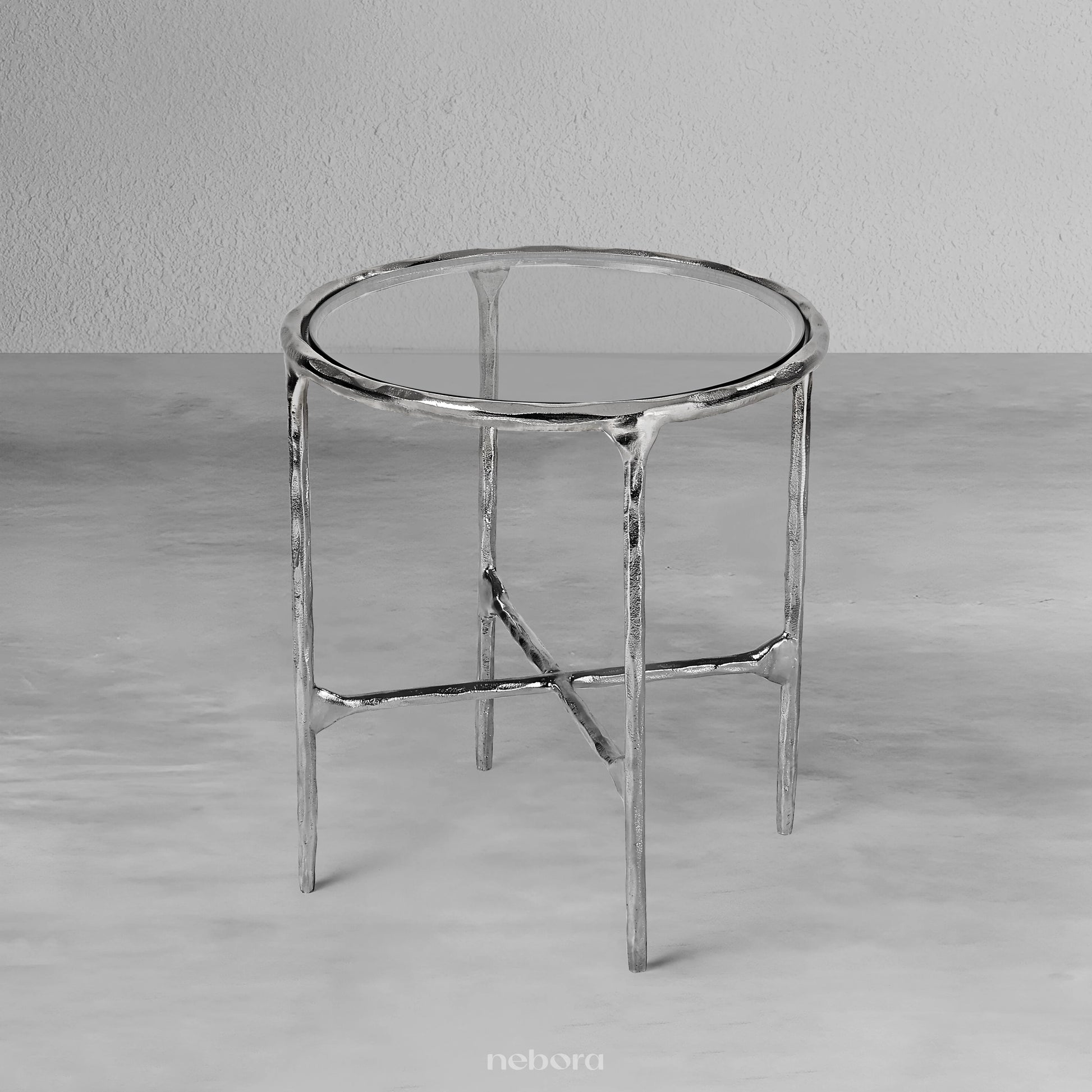 The "Lunar Hammered Side Table" is a captivating piece that brings an organic, artistic flair to your home with its unique, hand-forged metal base. The intricate texture and beautiful silvery finish create a feeling of sophisticated artistry, while the simple glass top maintains a sleek, modern look. It's the perfect size for adding a touch of elegant personality next to your favorite chair or as a unique bedside companion.