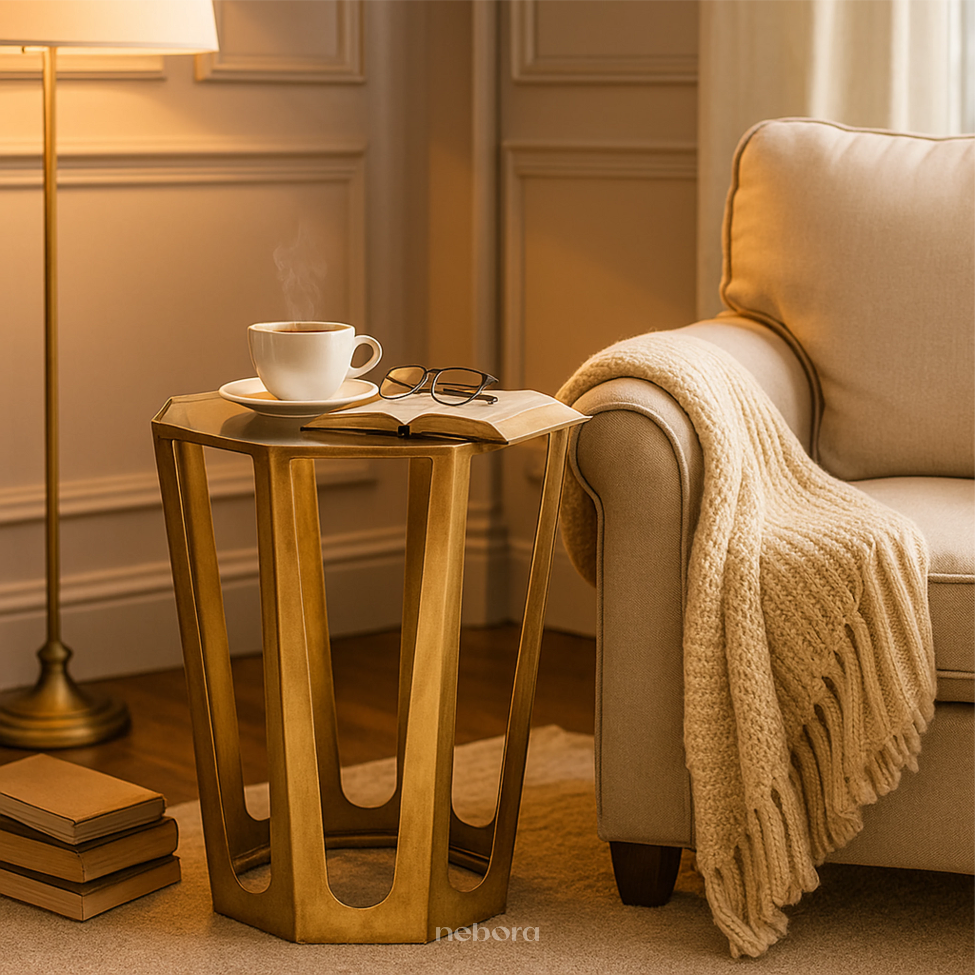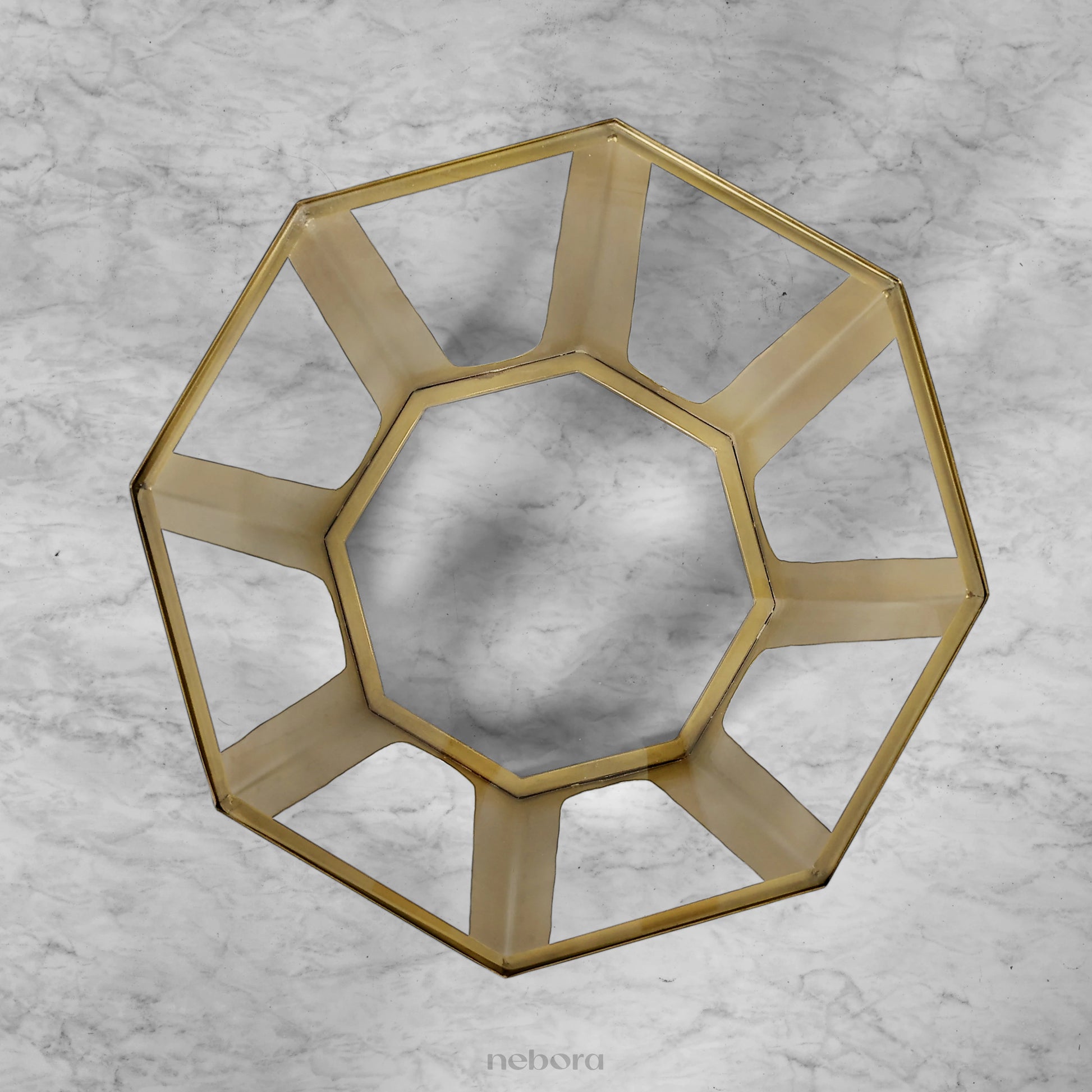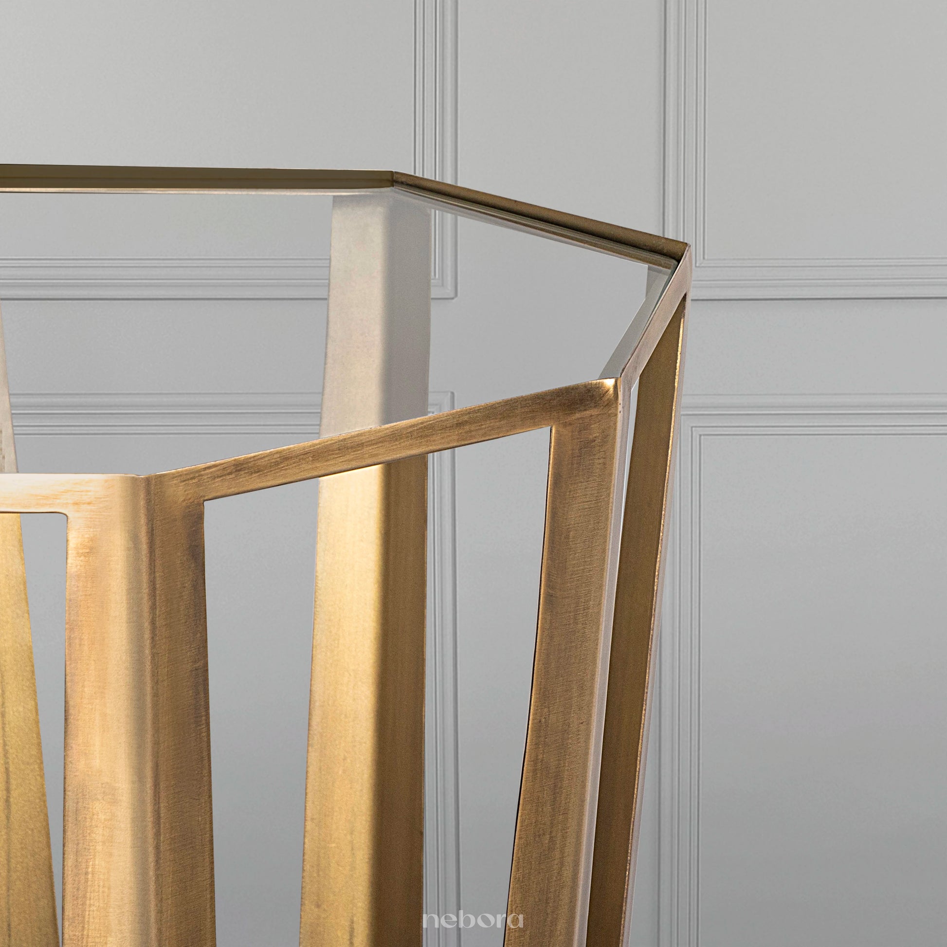 This Luxe Octa Side Table is a captivating blend of modern sculpture and functional elegance, with its sleek, antiqued brass frame forming a unique, airy base. The design feels both strong and delicate, giving a sense of sophisticated lightness to any room. Topped with a clear glass surface, it's the ideal accent piece to showcase beside an elegant sofa or as a statement nightstand, adding a touch of glamorous, artistic flair.
