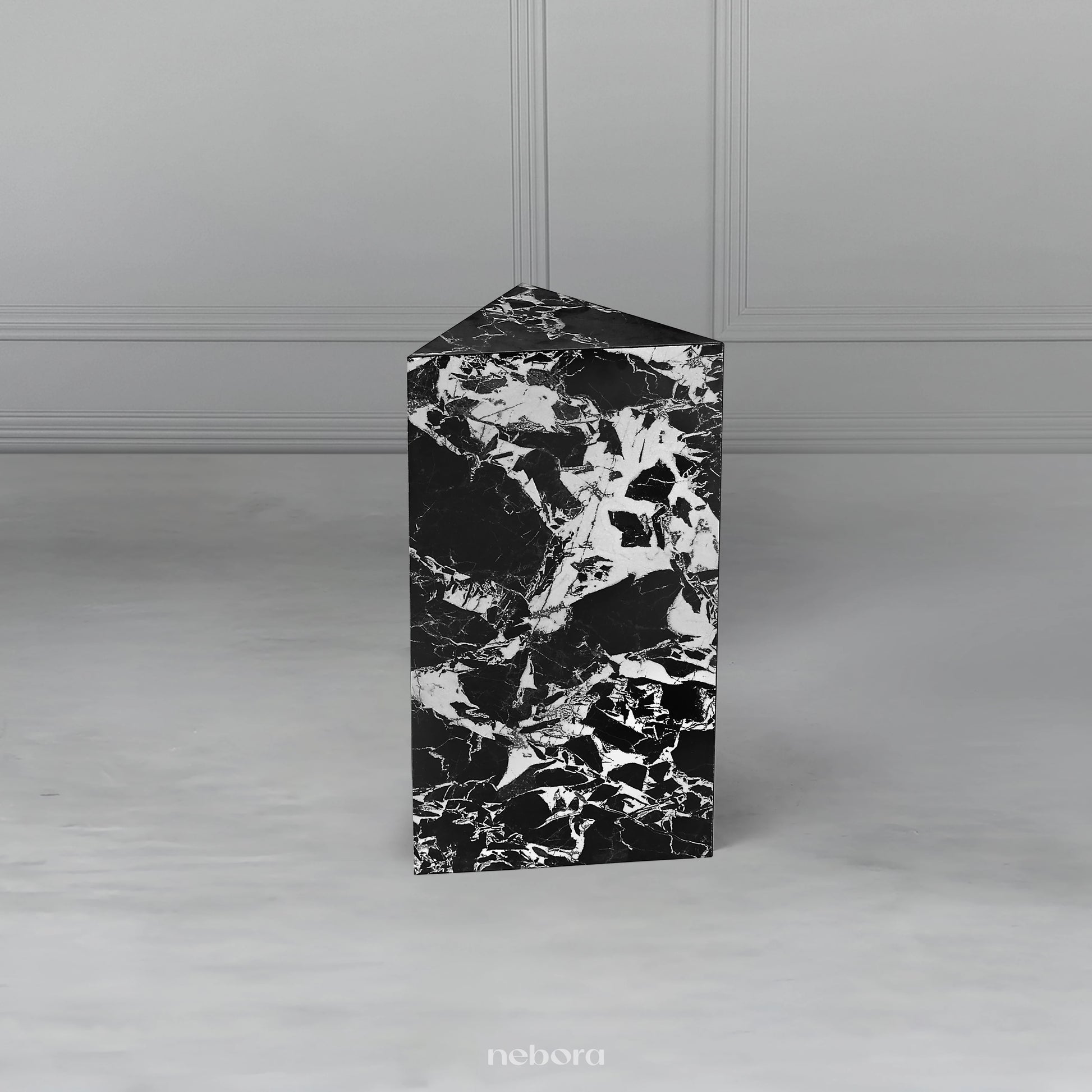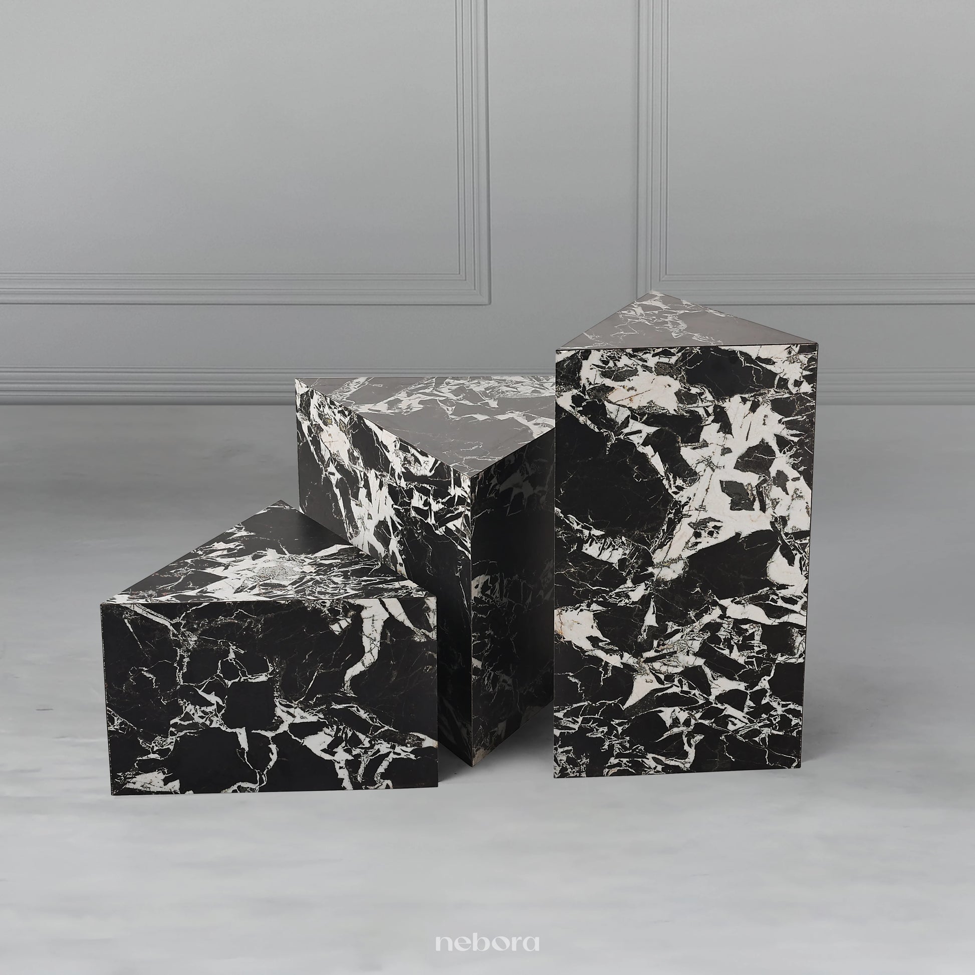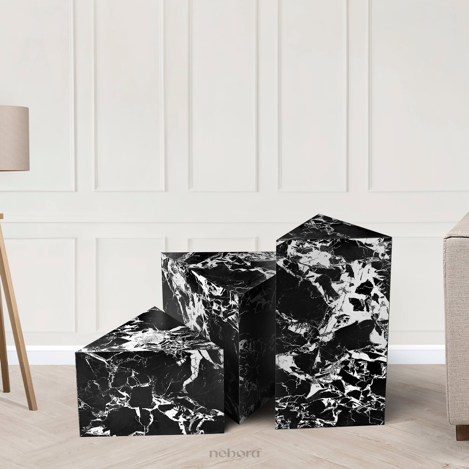 Elevate your living space with the Nebora Marquina Pedestals Tables, a set of three luxurious accent tables. Crafted from premium wood and finished with a stunning marble-textured sunmica, these tables exude sophistication. Their unique geometric design makes them a captivating focal point, perfect for adding a touch of modern elegance to any room. Arrange them beside a sofa or armchair to create a dynamic accent and a stylish display for decorative items.