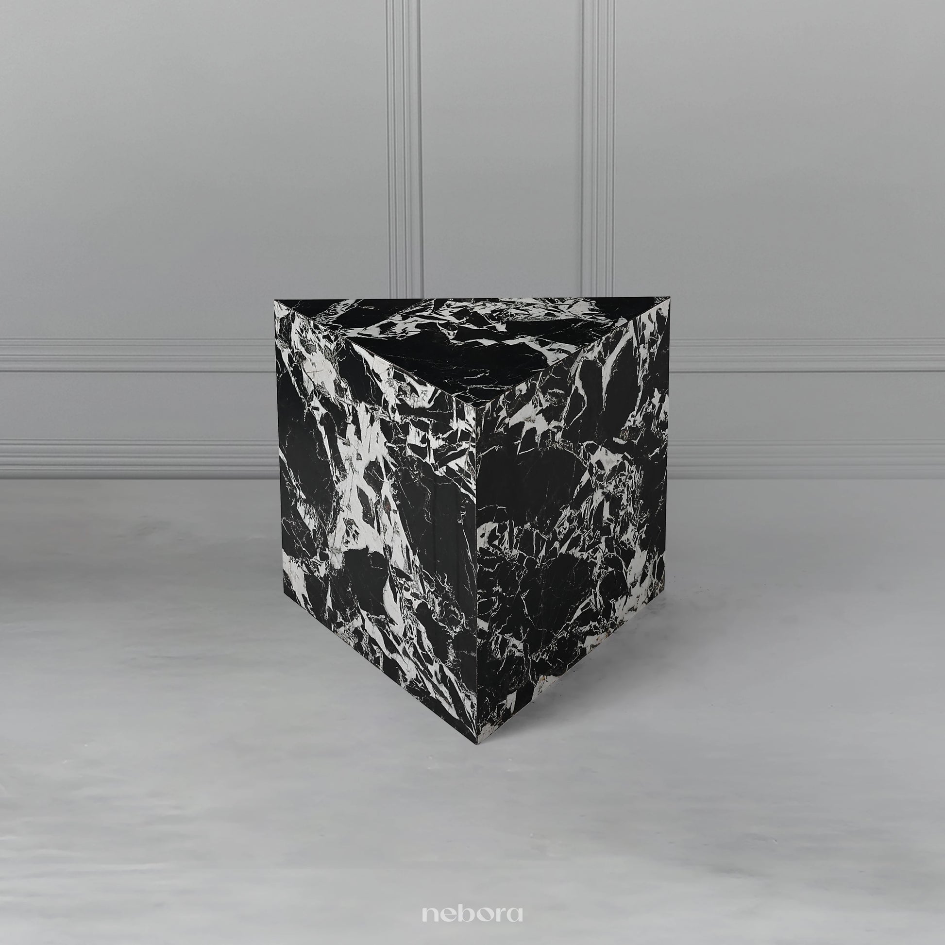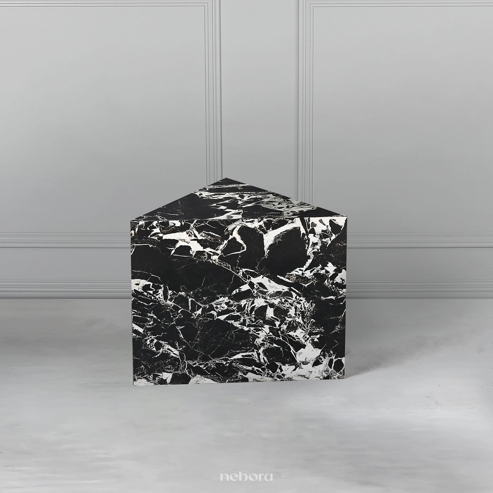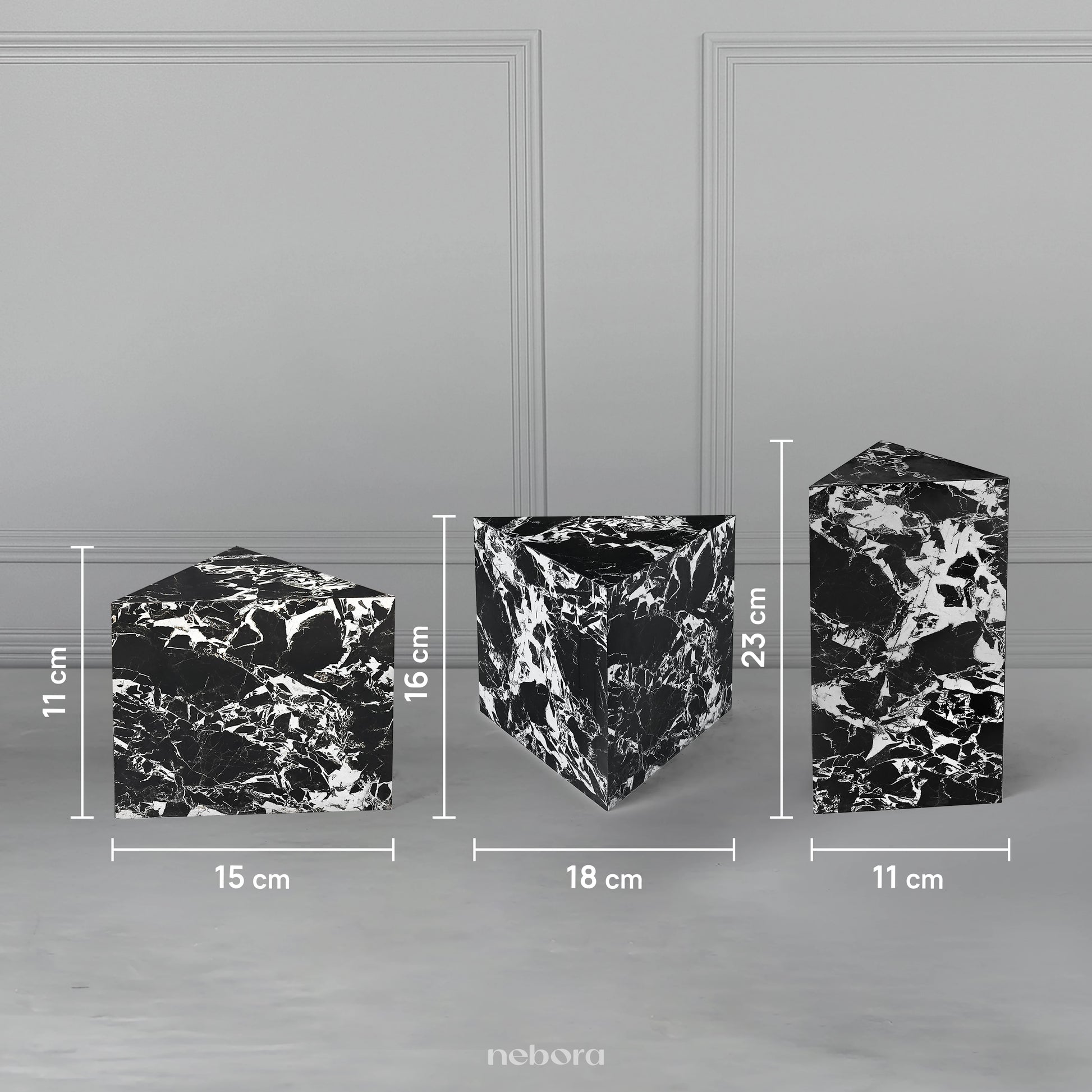 Elevate your living space with the Nebora Marquina Pedestals Tables, a set of three luxurious accent tables. Crafted from premium wood and finished with a stunning marble-textured sunmica, these tables exude sophistication. Their unique geometric design makes them a captivating focal point, perfect for adding a touch of modern elegance to any room. Arrange them beside a sofa or armchair to create a dynamic accent and a stylish display for decorative items.