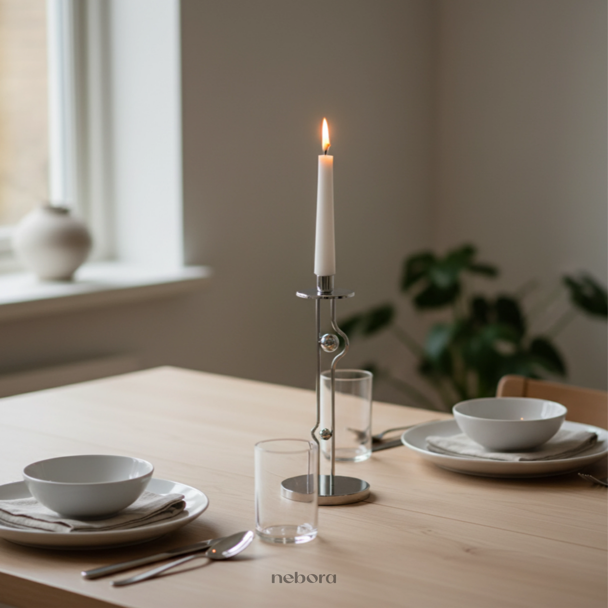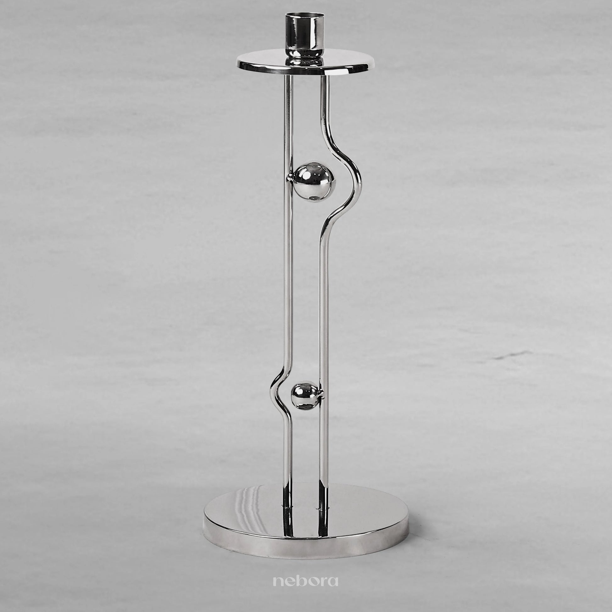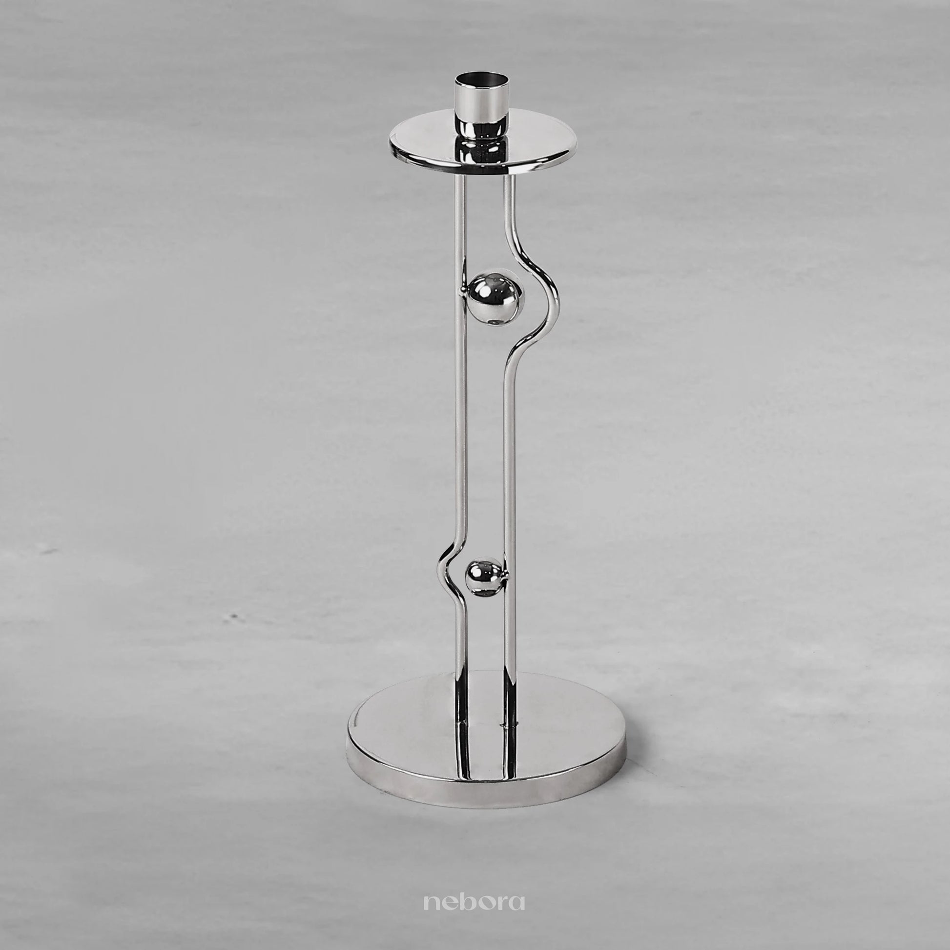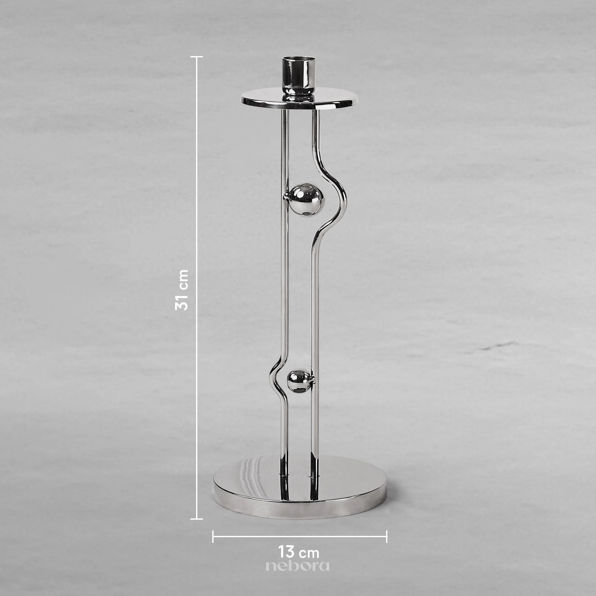 With its sleek, polished silver finish, this candle holder is a magnificent piece of contemporary sculpture in a compact form. The delicate frame gracefully cradles two polished orbs, creating a visual rhythm that is both dynamic and serene. This piece is a perfect accent for a bookshelf, a side table, or as a pair on a mantel, adding a touch of artistic sophistication and quiet beauty to your home.