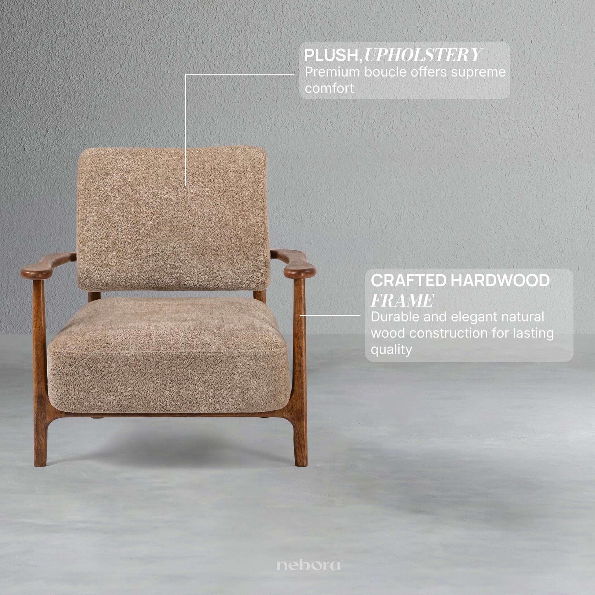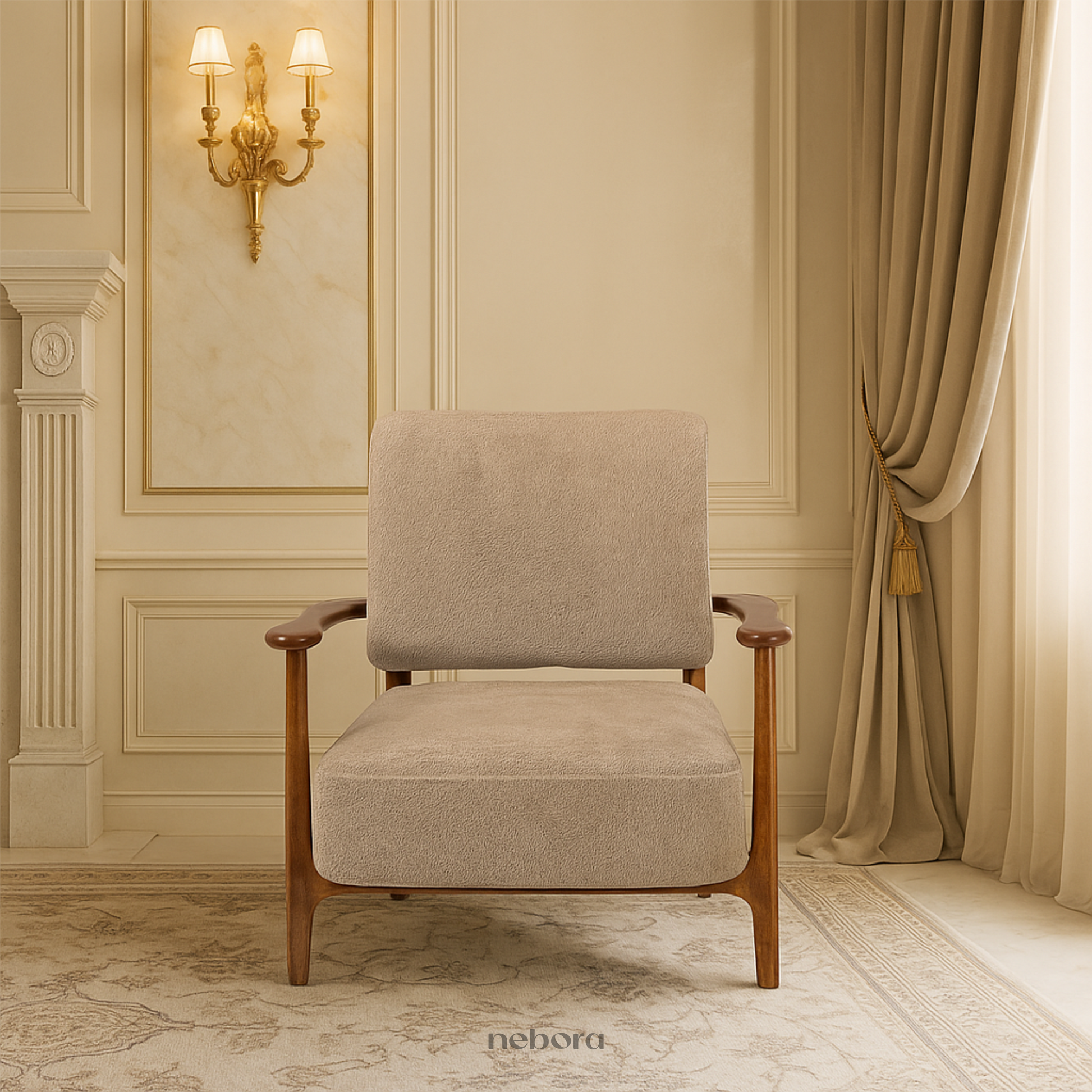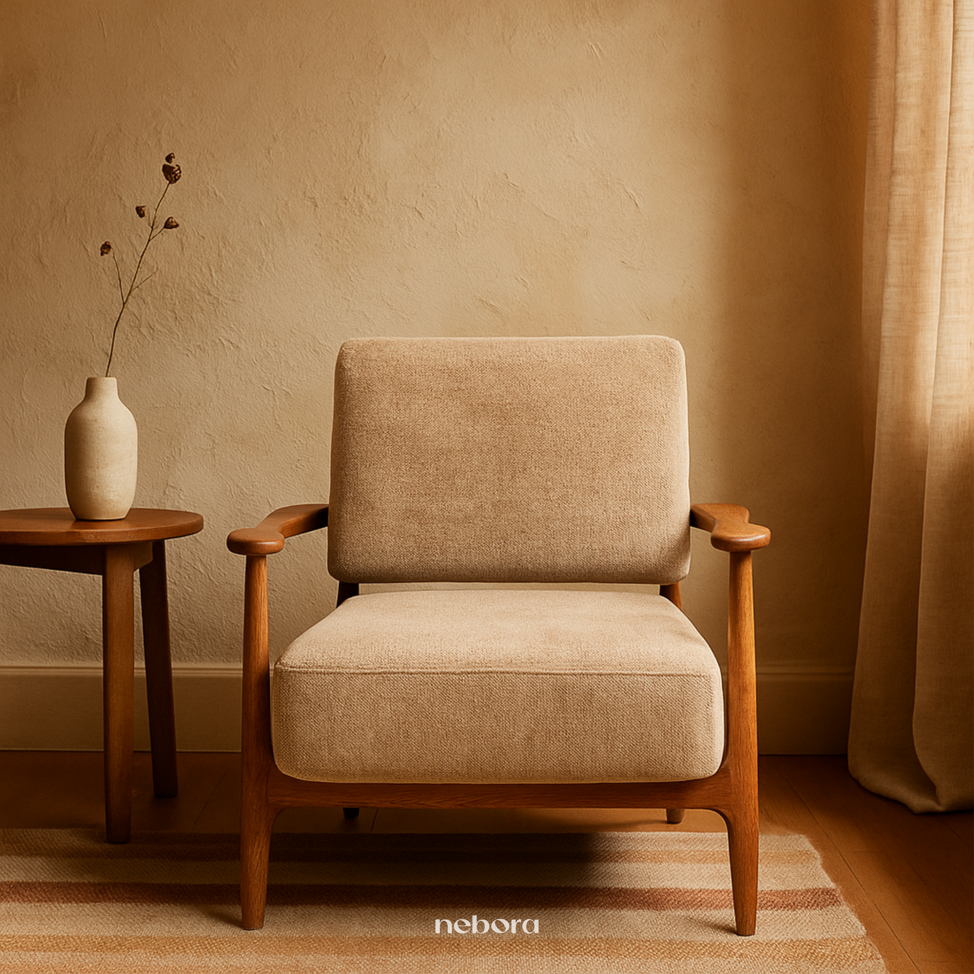 Experience the embrace of timeless comfort with the Milan Single Seater Sofa. Its solid wooden frame, featuring elegantly curved armrests and tapered legs, pays homage to classic mid-century design. Upholstered in a soft, textured fabric in a warm neutral tone, this sofa invites you to sink in and let the day's worries fade away. It's more than just a seat, it's a feeling of serene style and cozy relaxation, designed to be your favourite place to unwind.