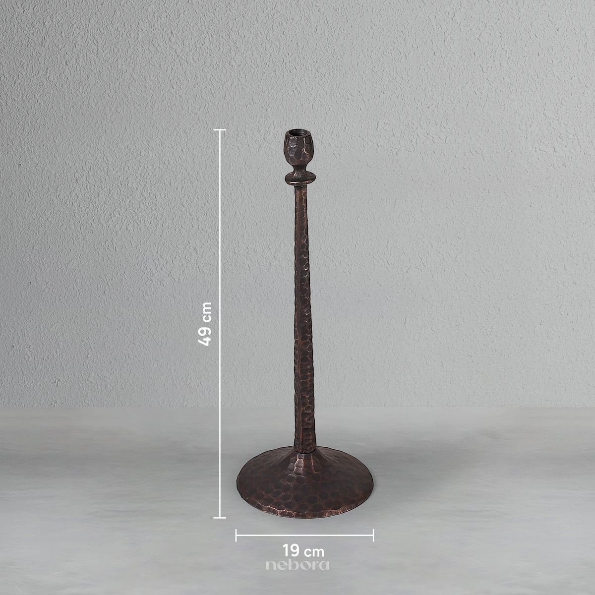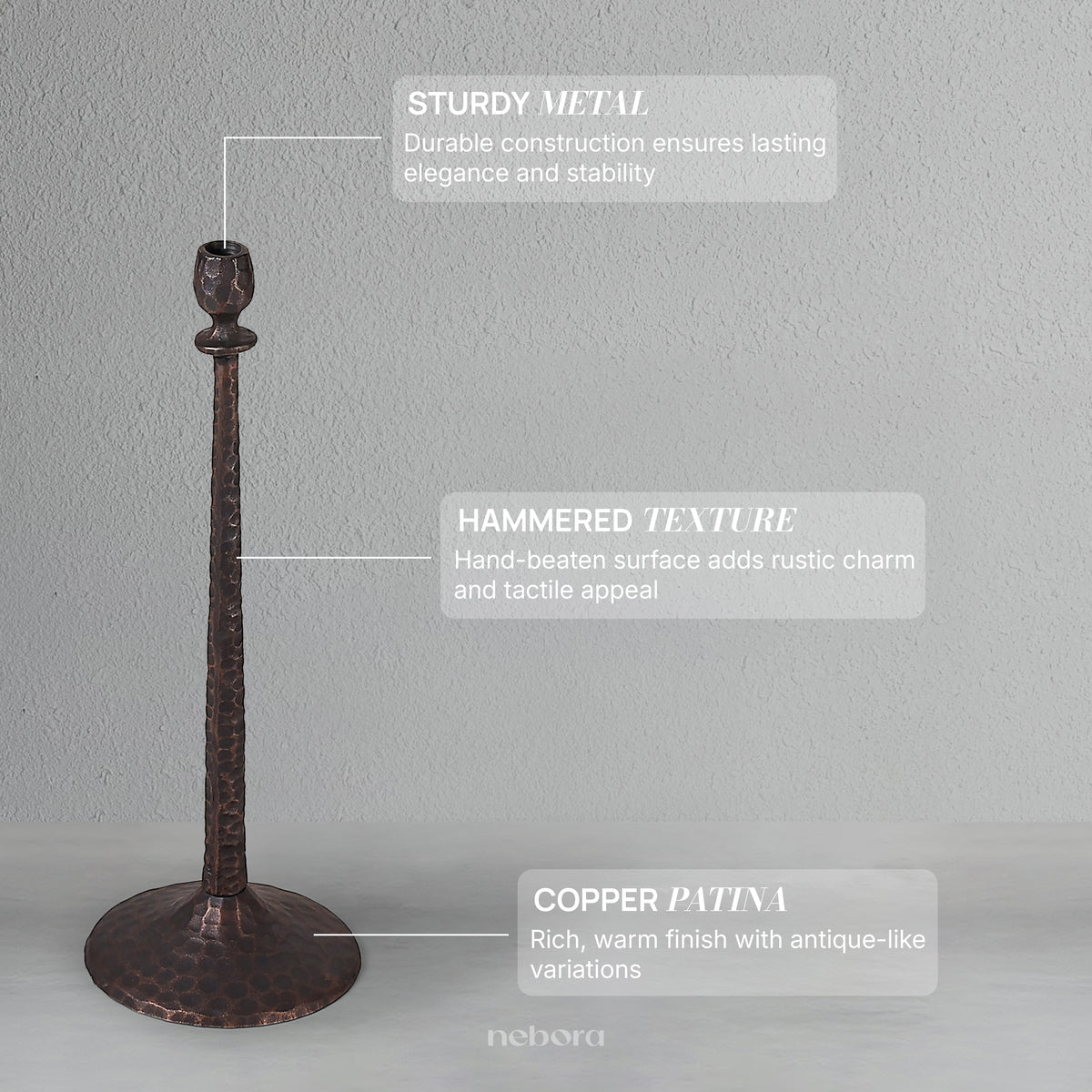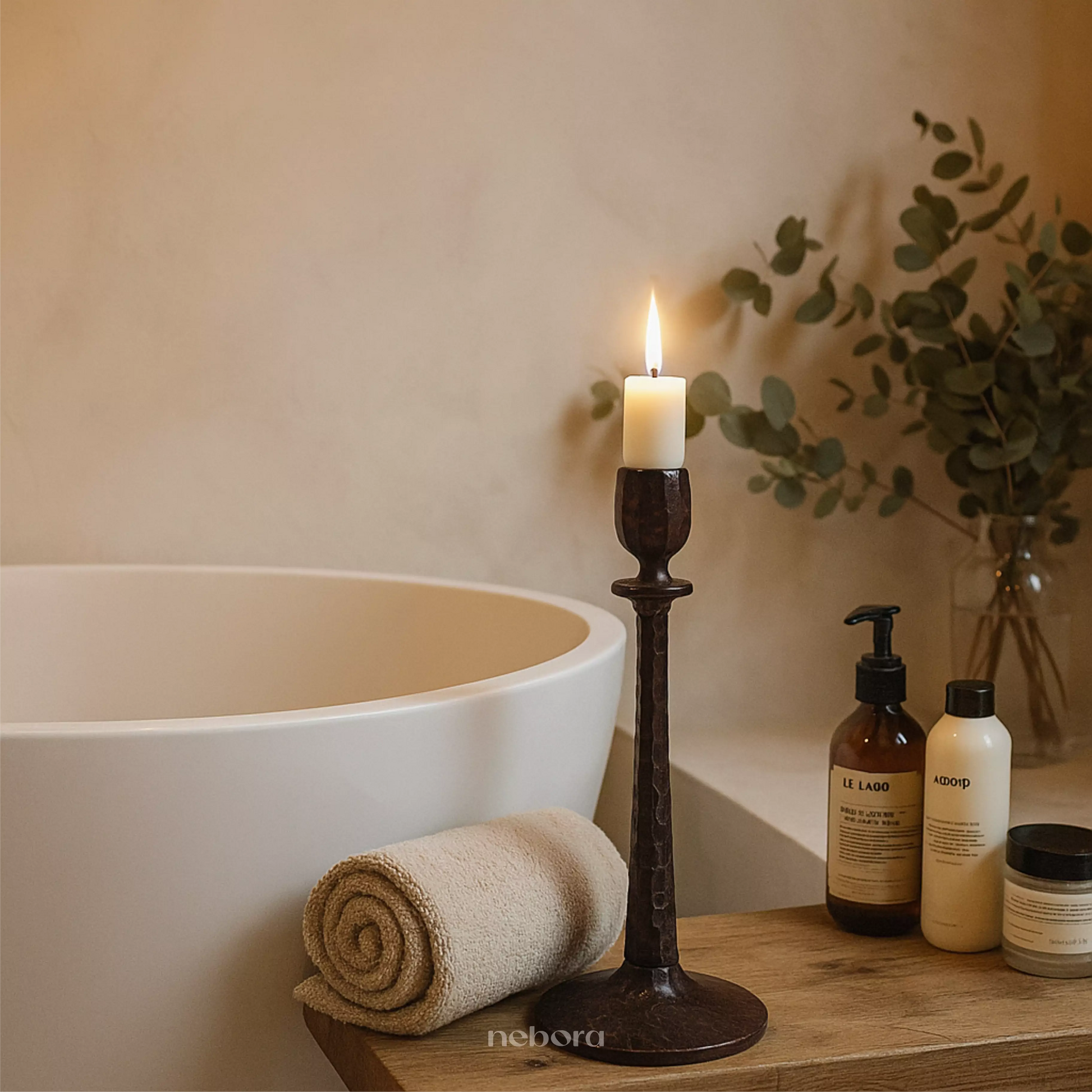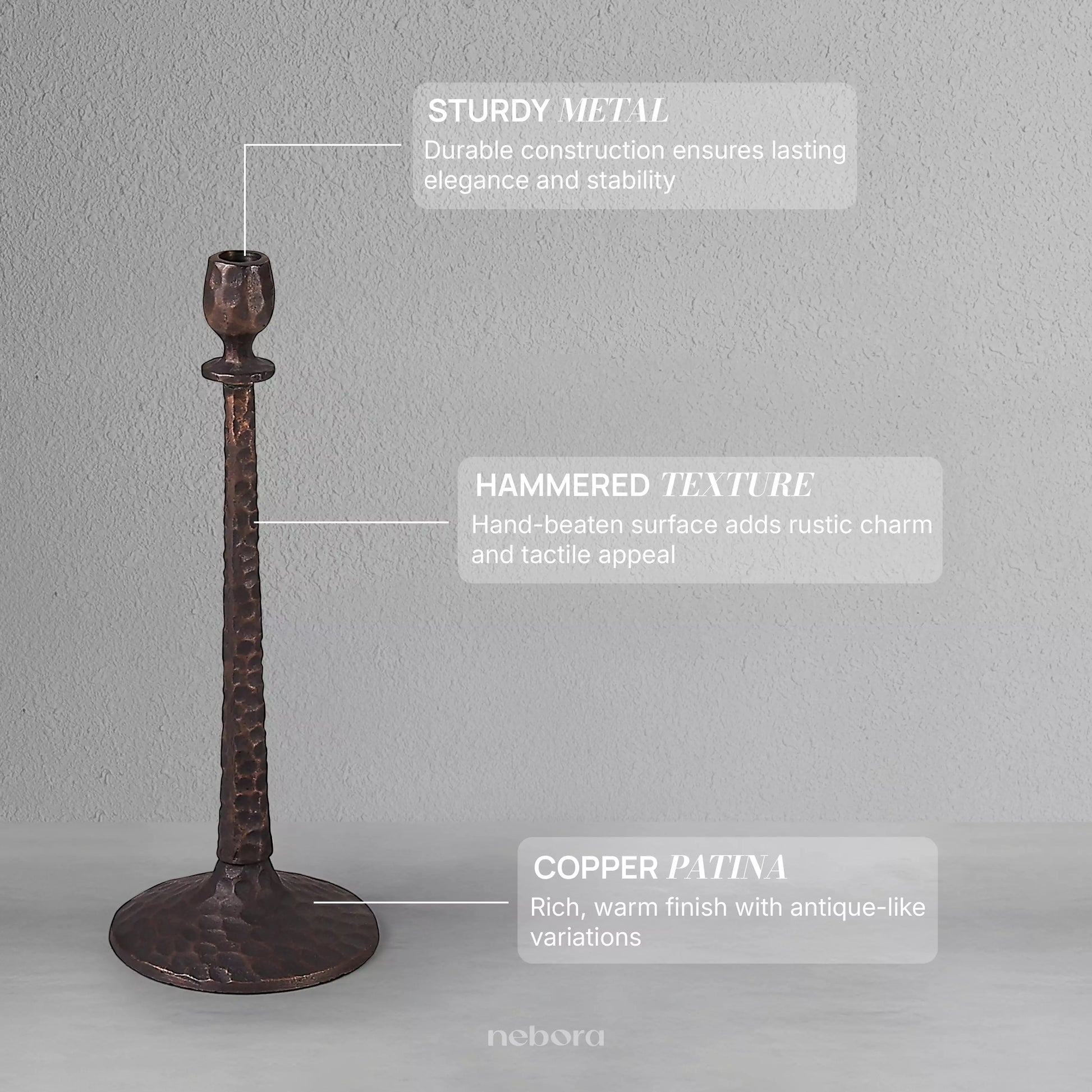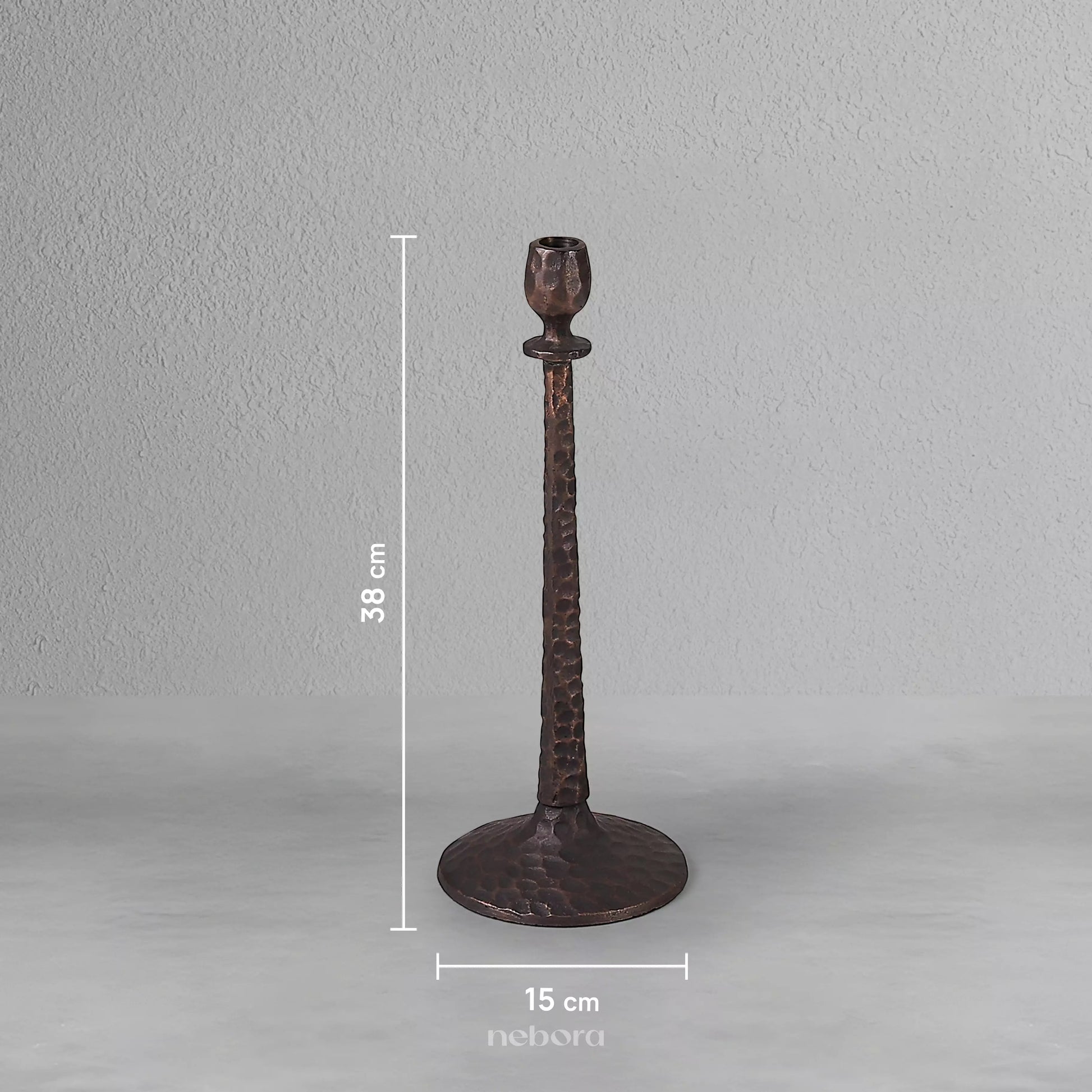 With its commanding height and a rich, antiqued bronze finish, this large candle holder is a magnificent piece of timeless elegance. The hand-hammered texture of the stem and base gives it a soulful, old-world feel, suggesting a story of history and regal charm. This Monarch Candle Holder is a perfect solo statement for a formal dining table or a fireplace mantel, where it will add a touch of warm, sophisticated drama and a sense of enduring beauty.