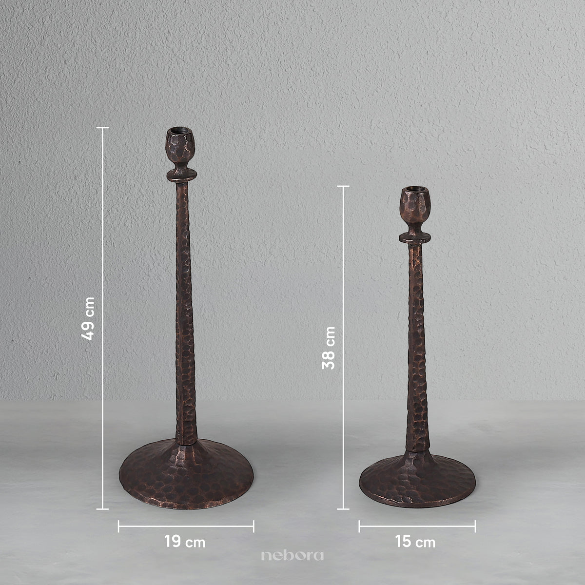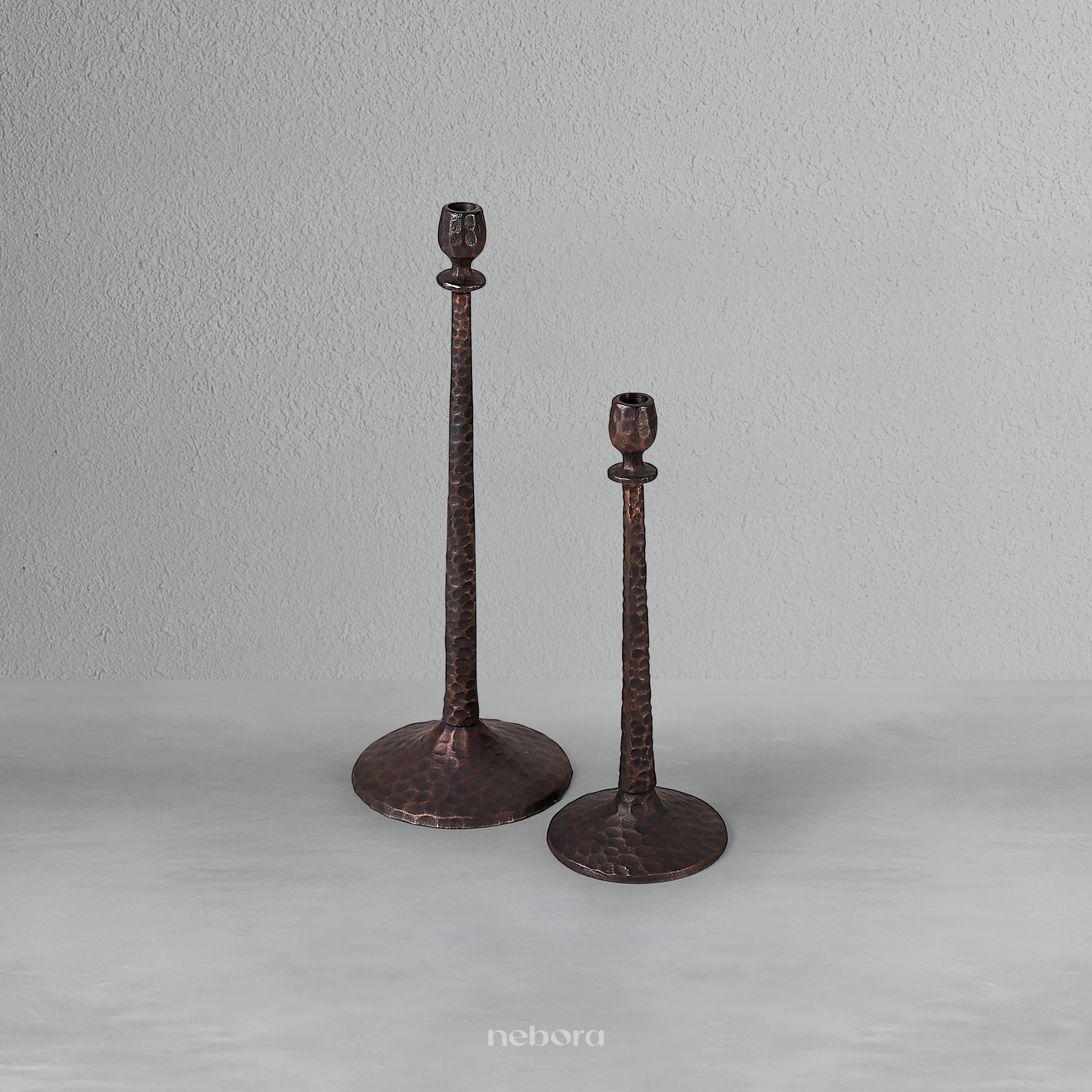 This magnificent set of two Monarch Candle Holders, featuring a large and a small size, is a testament to timeless elegance and masterful craftsmanship. Both pieces share a rich, antiqued bronze finish and a hand-hammered texture, creating a beautiful harmony of old-world charm and visual interest. Display them together on a mantel or a formal dining table to create a sophisticated, multi-level centerpiece that infuses your space with a sense of warm history and stately grace.