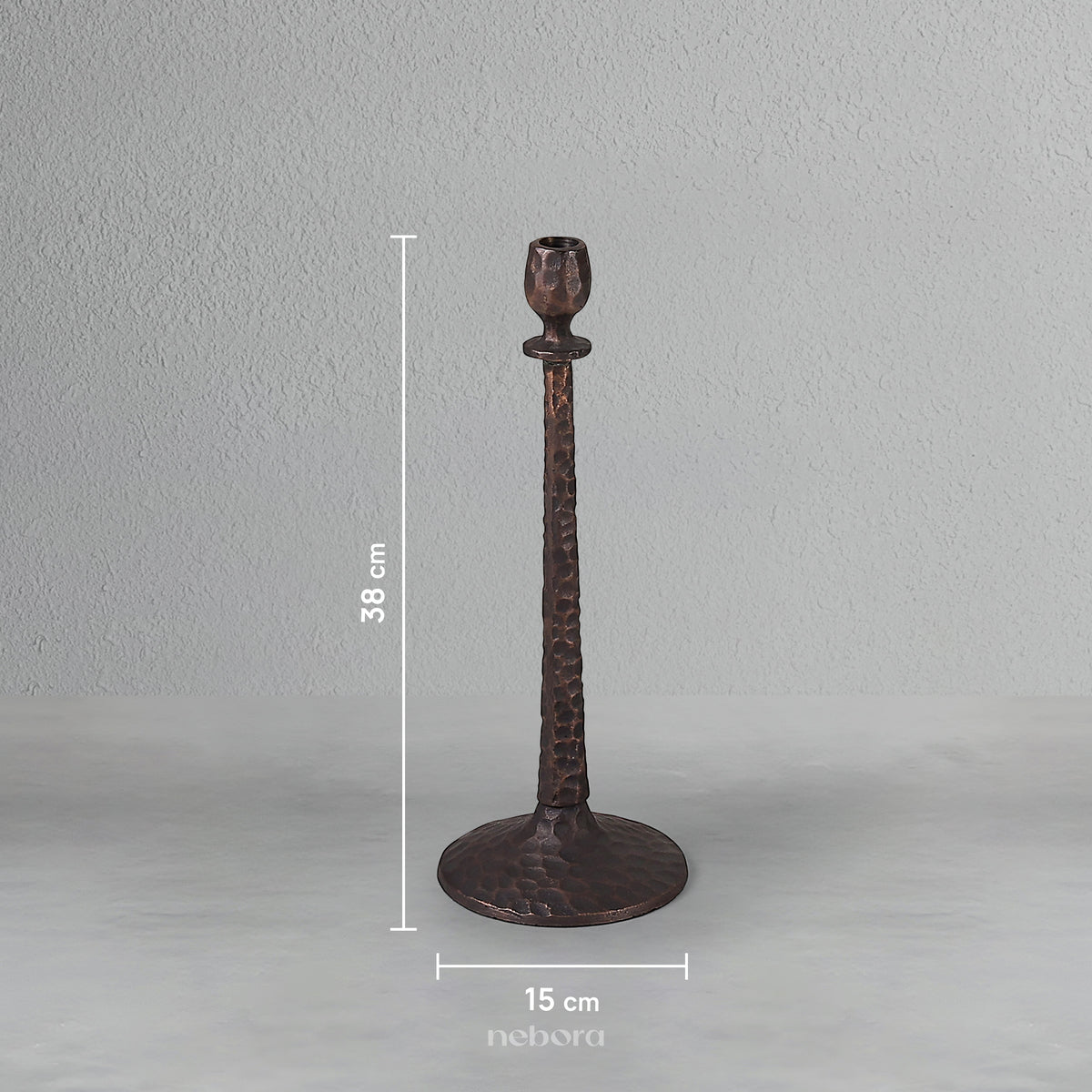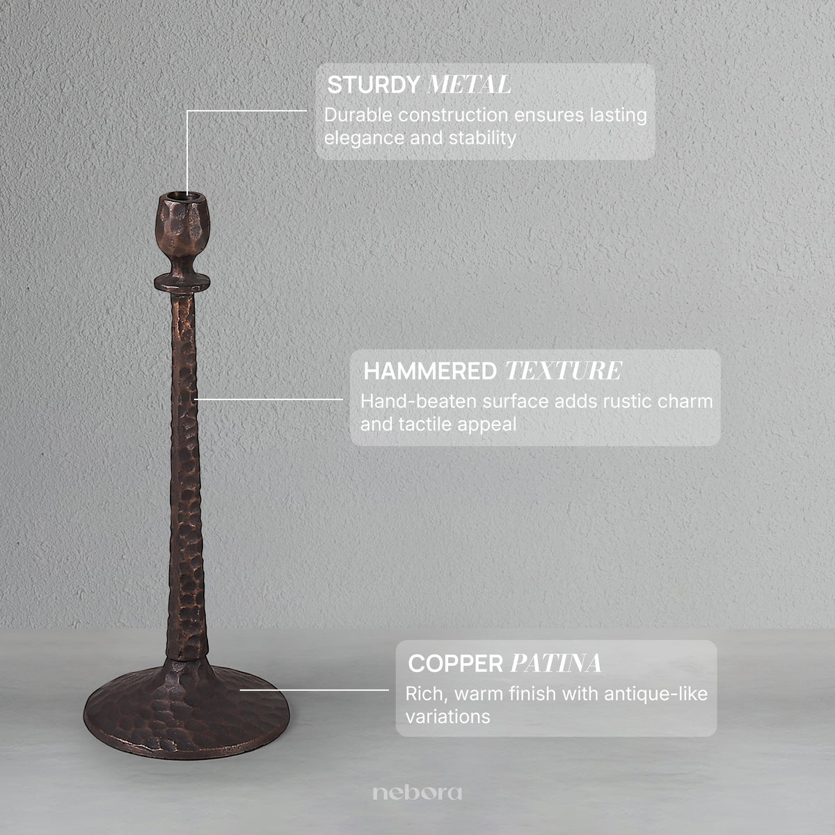 This beautifully crafted candle holder, with its antiqued bronze finish and distinctive hand-hammered texture, is a smaller monument to timeless style. The classic silhouette, though scaled down, retains a powerful, rustic elegance that grounds any space it inhabits. It is an ideal companion for its larger counterpart or a standalone piece on a mantel, adding a touch of sophisticated history and a quiet, dignified charm.