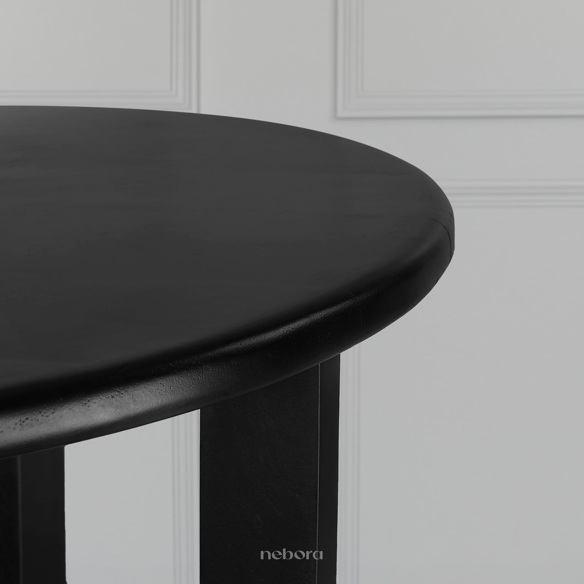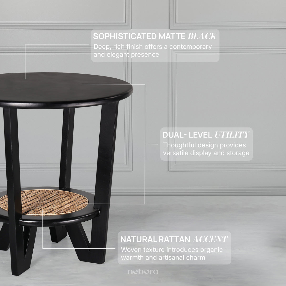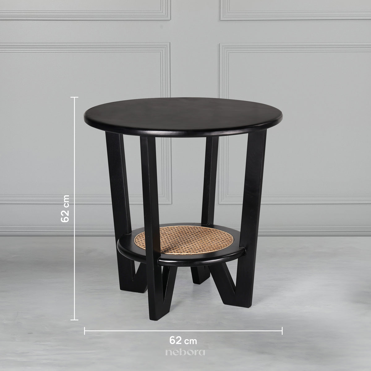 A study in elegant contrast, this round table blends a sleek, noir-finished frame with the warm, organic texture of a woven rattan shelf. The splayed legs and open silhouette create a modern, architectural feel, while the natural element adds a touch of bohemian charm. This table is a perfect companion for an armchair or a bed, offering a beautiful surface and a touch of thoughtful design to any space.