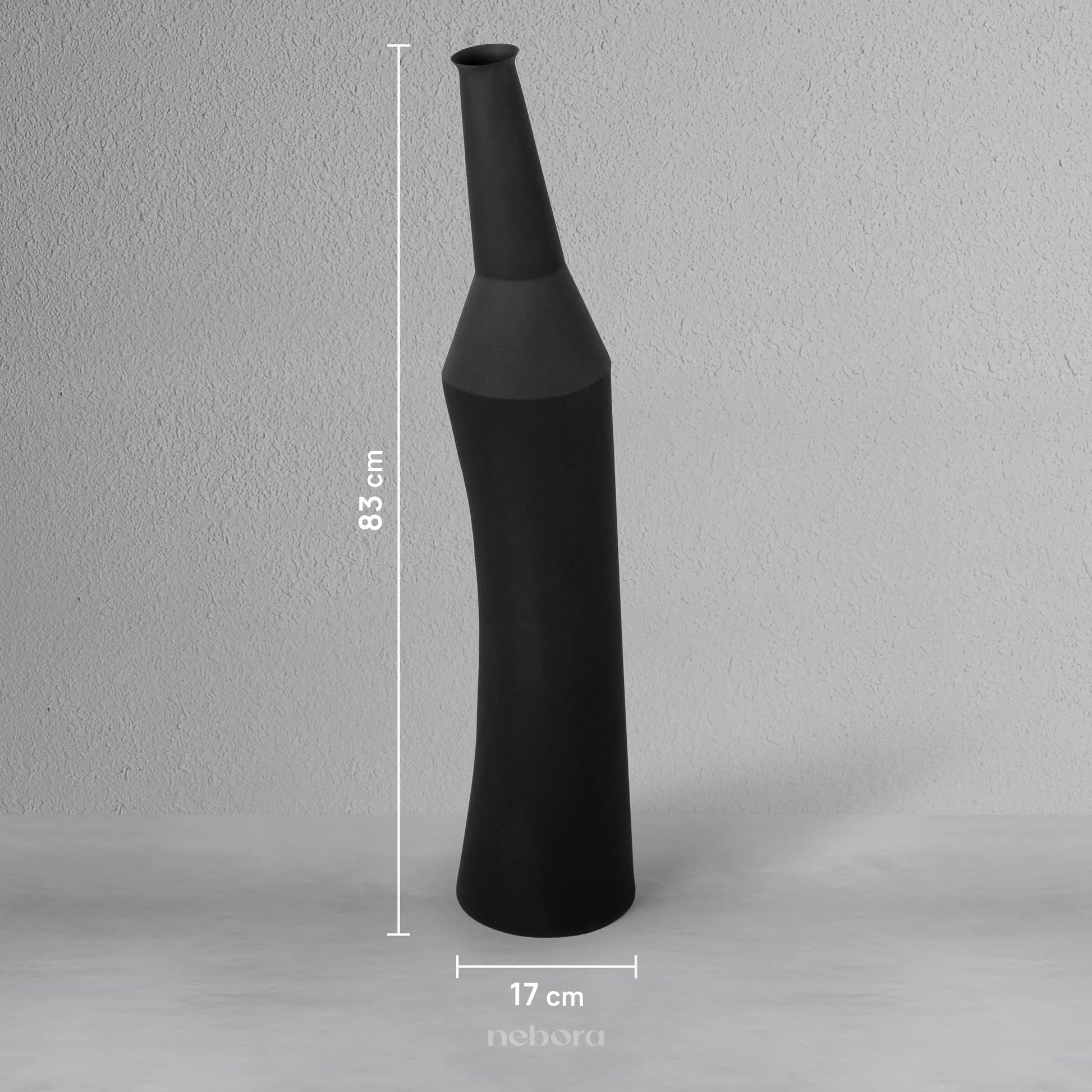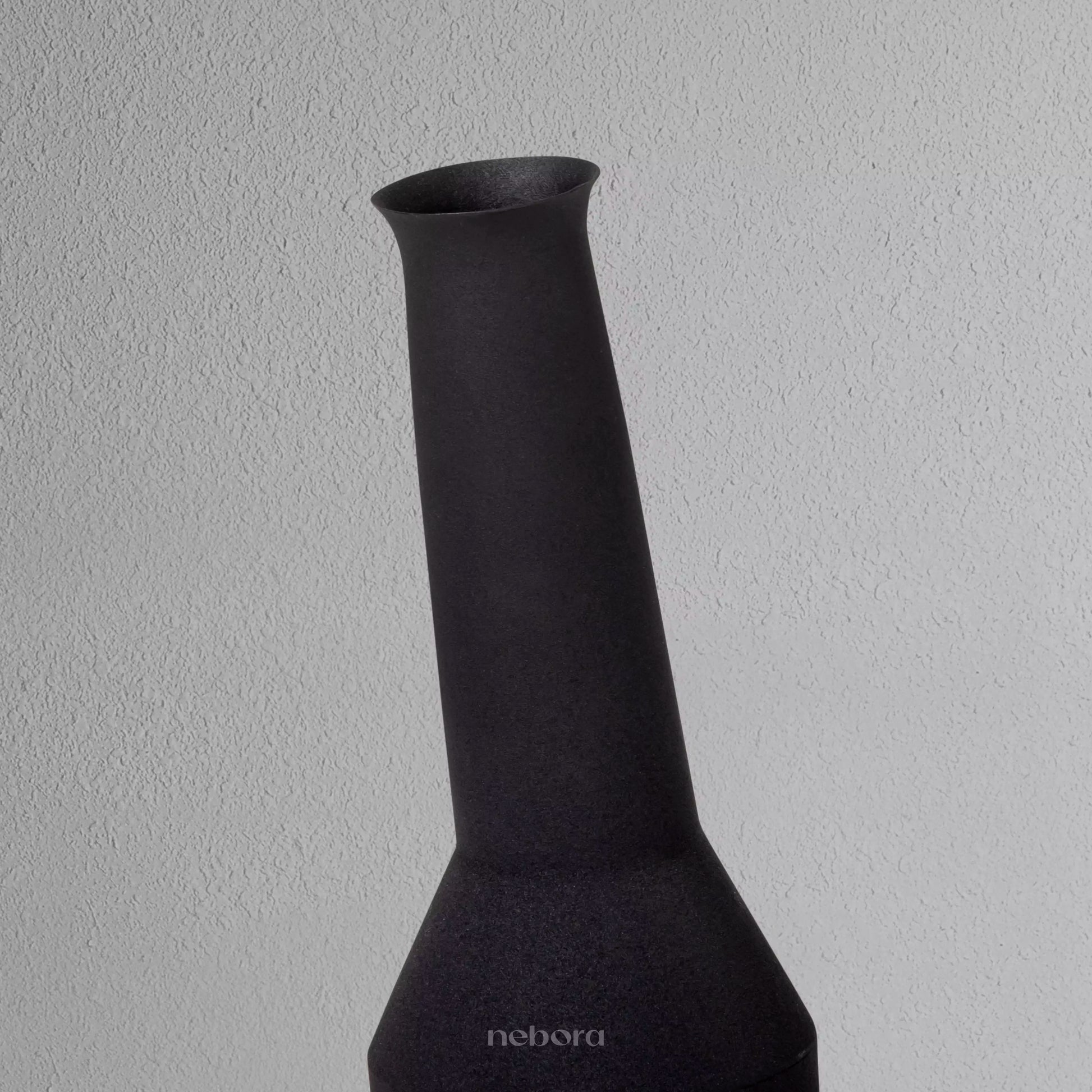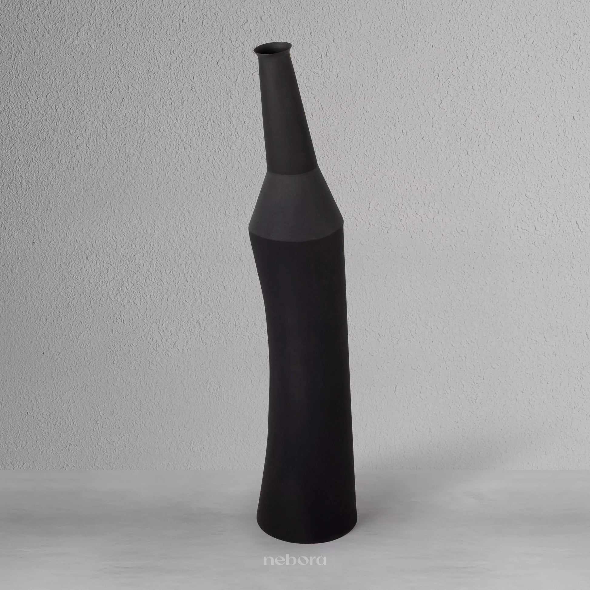 This Onyx Vase is a beautiful expression of modern sculpture, with sleek, bottle-like silhouettes of varying heights. The larger vase features a graceful, subtle curve that contrasts beautifully with the straight, elegant form of its smaller counterpart. Finished in a profound matte black, this vase is a perfect statement for a console table or a mantel, where it will infuse your home with a sense of quiet drama and minimalist sophistication.
