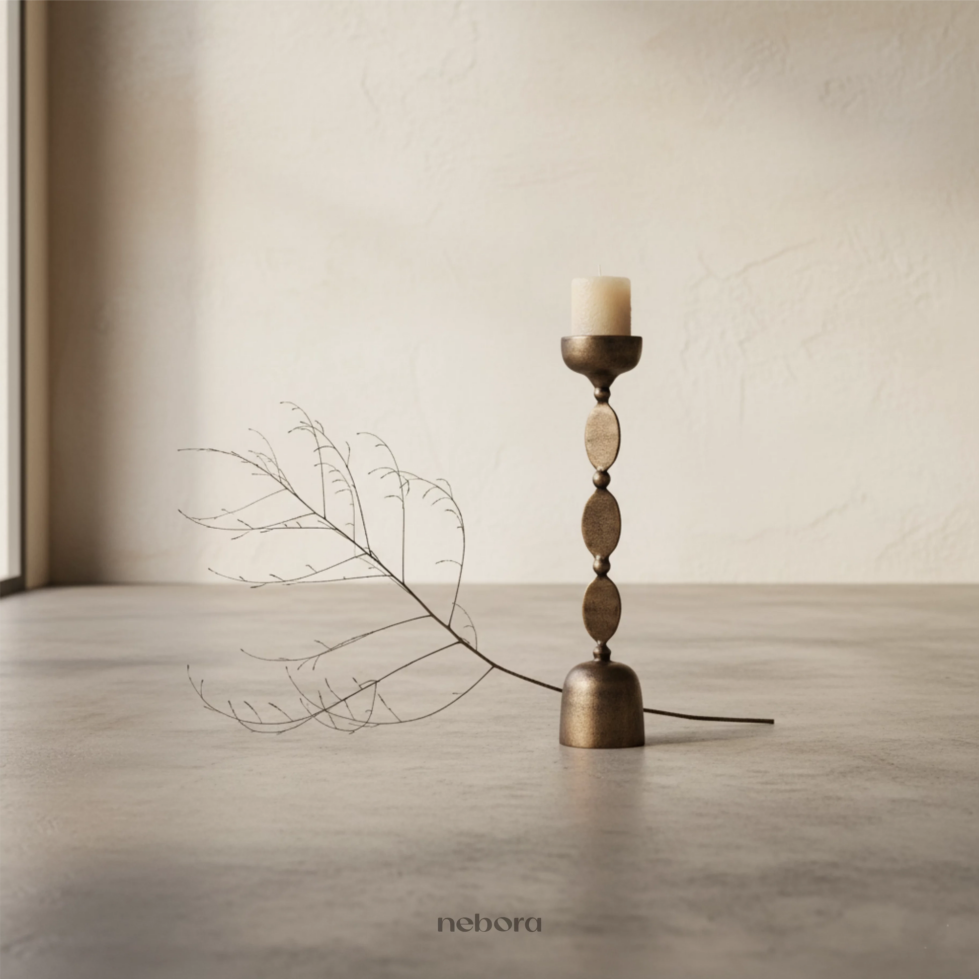 The Orb Chain Candle Stand rises through a sequence of rounded and tapered shapes, creating a gentle visual rhythm that feels collected and intentional. Each metal element is proportioned to build a balanced vertical composition.