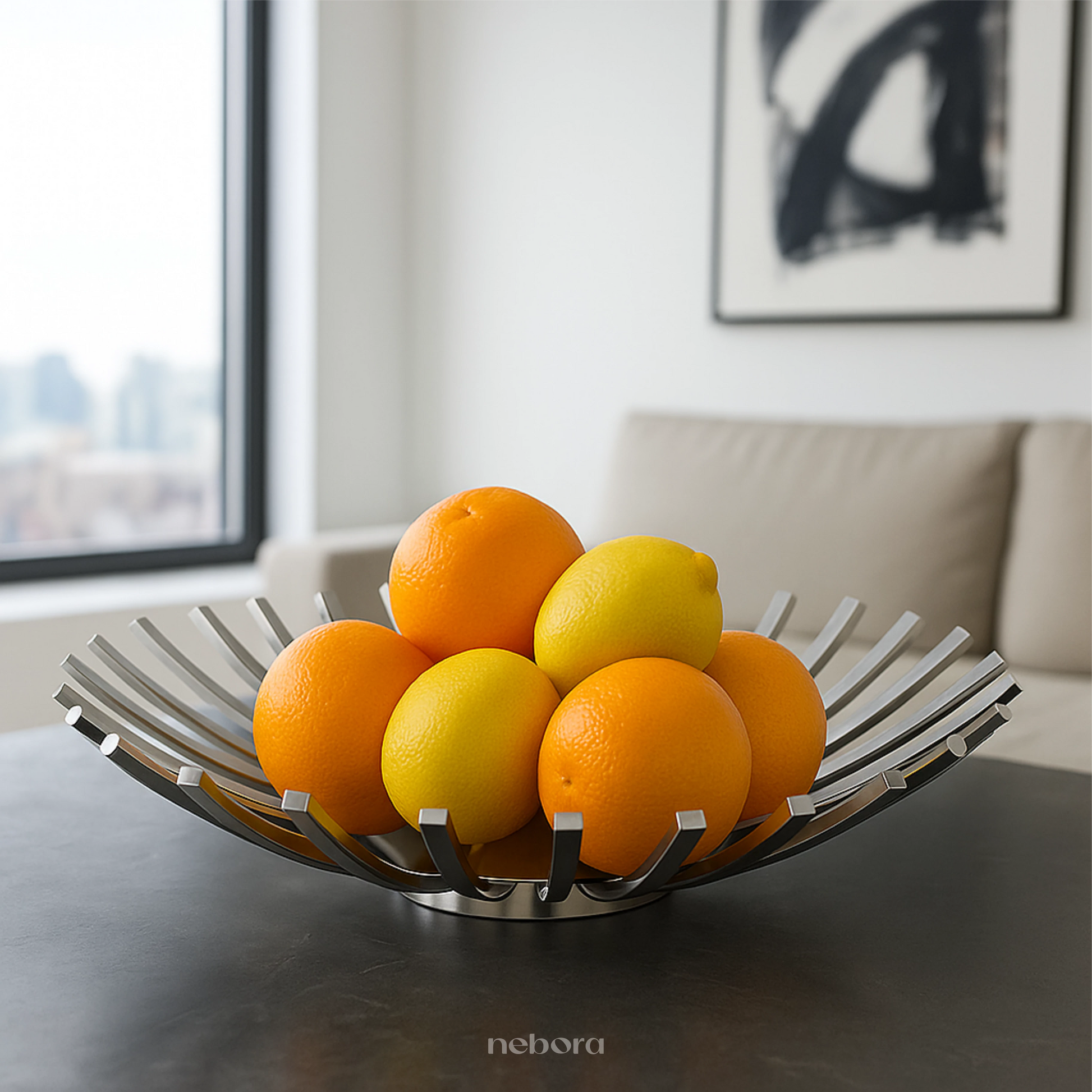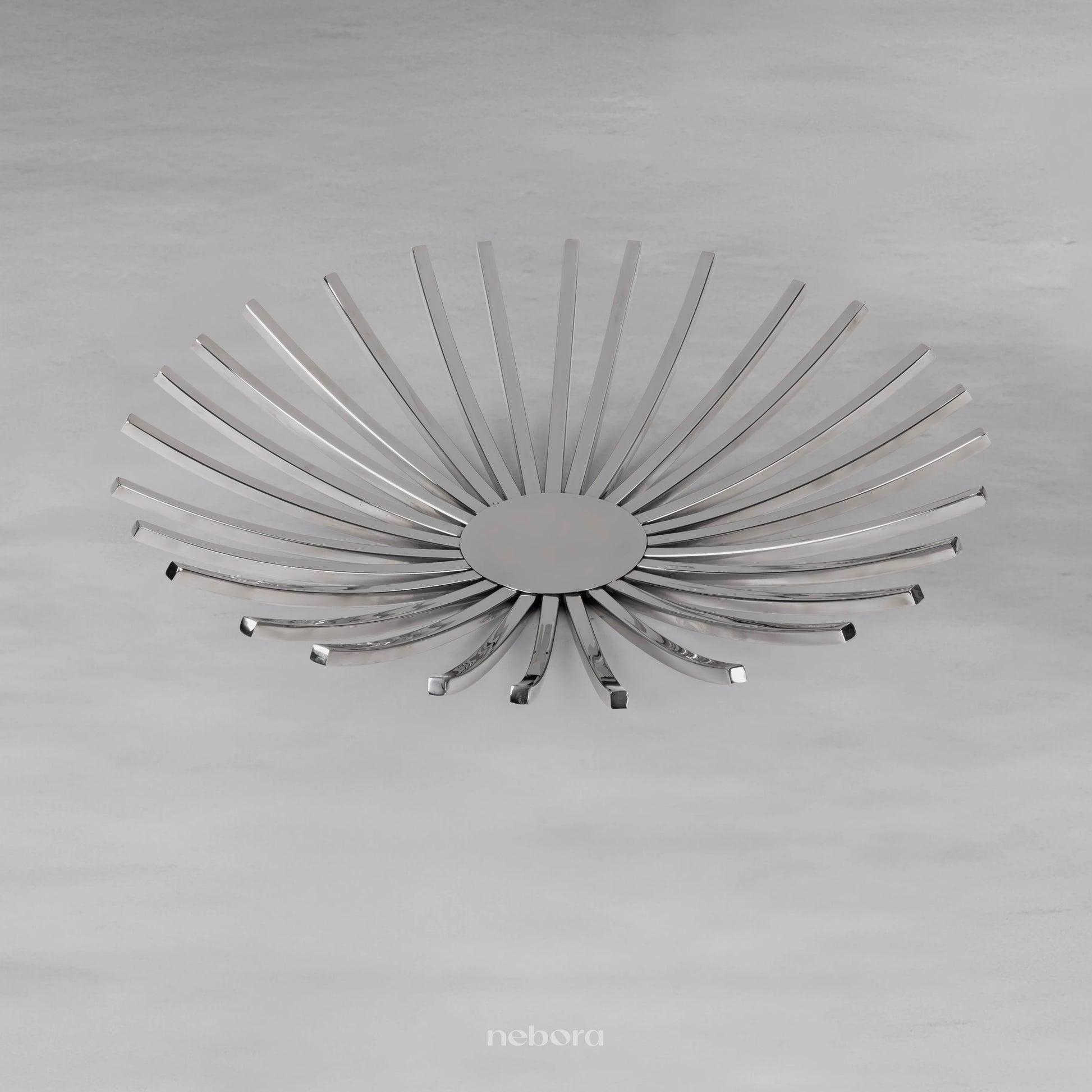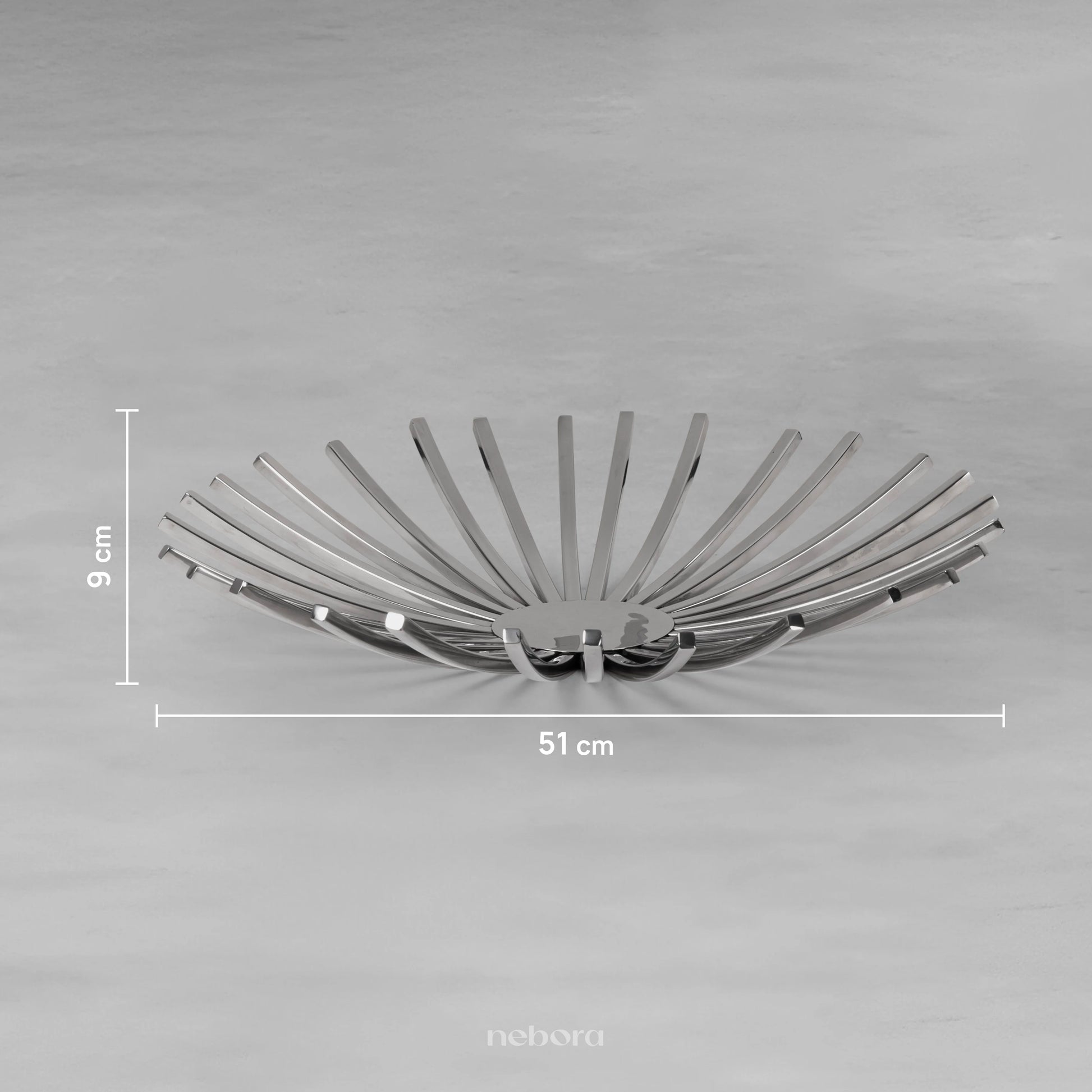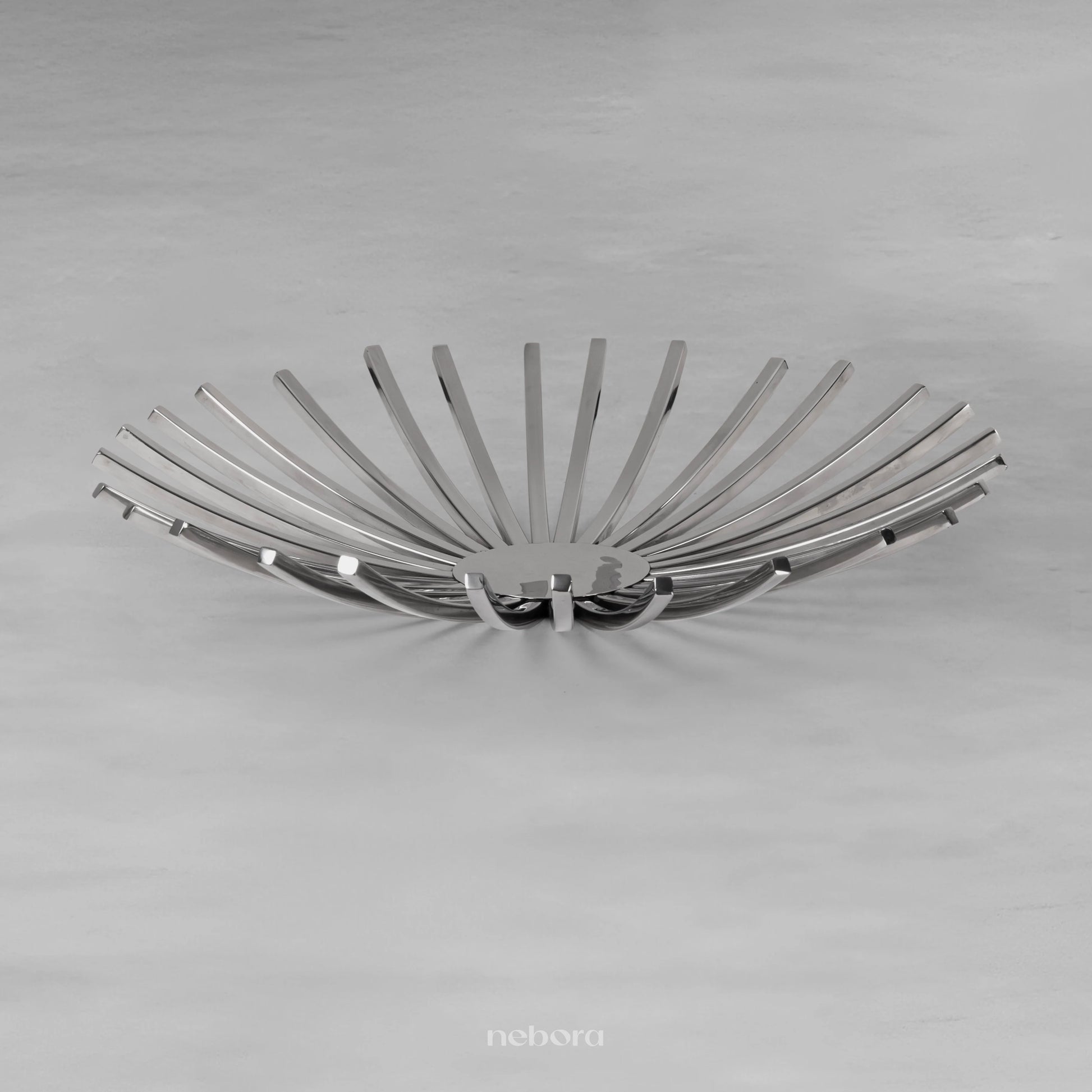 A captivating piece of modern sculpture, this platter is formed from a series of polished chrome ribbons that gracefully radiate from a central core, creating a dynamic and airy silhouette. The highly reflective surface and sunburst design turn a simple fruit bowl into a stunning focal point, catching the light and transforming any space with its elegant energy. This is the perfect centrepiece for a dining table or a coffee table, where its unique form will inspire conversation and admiration.