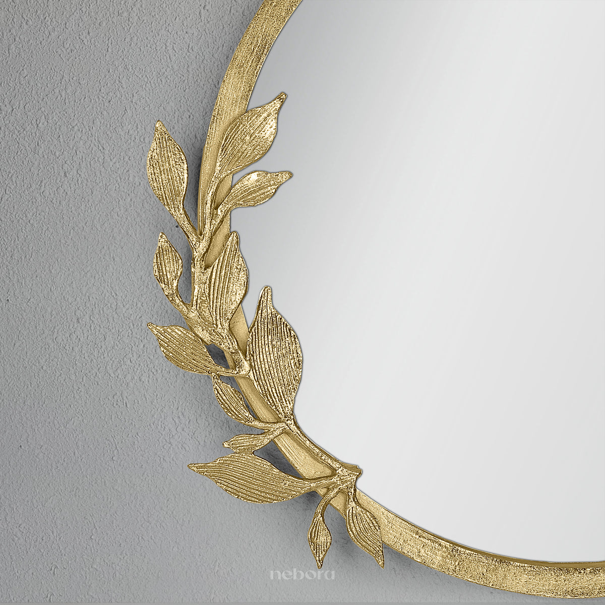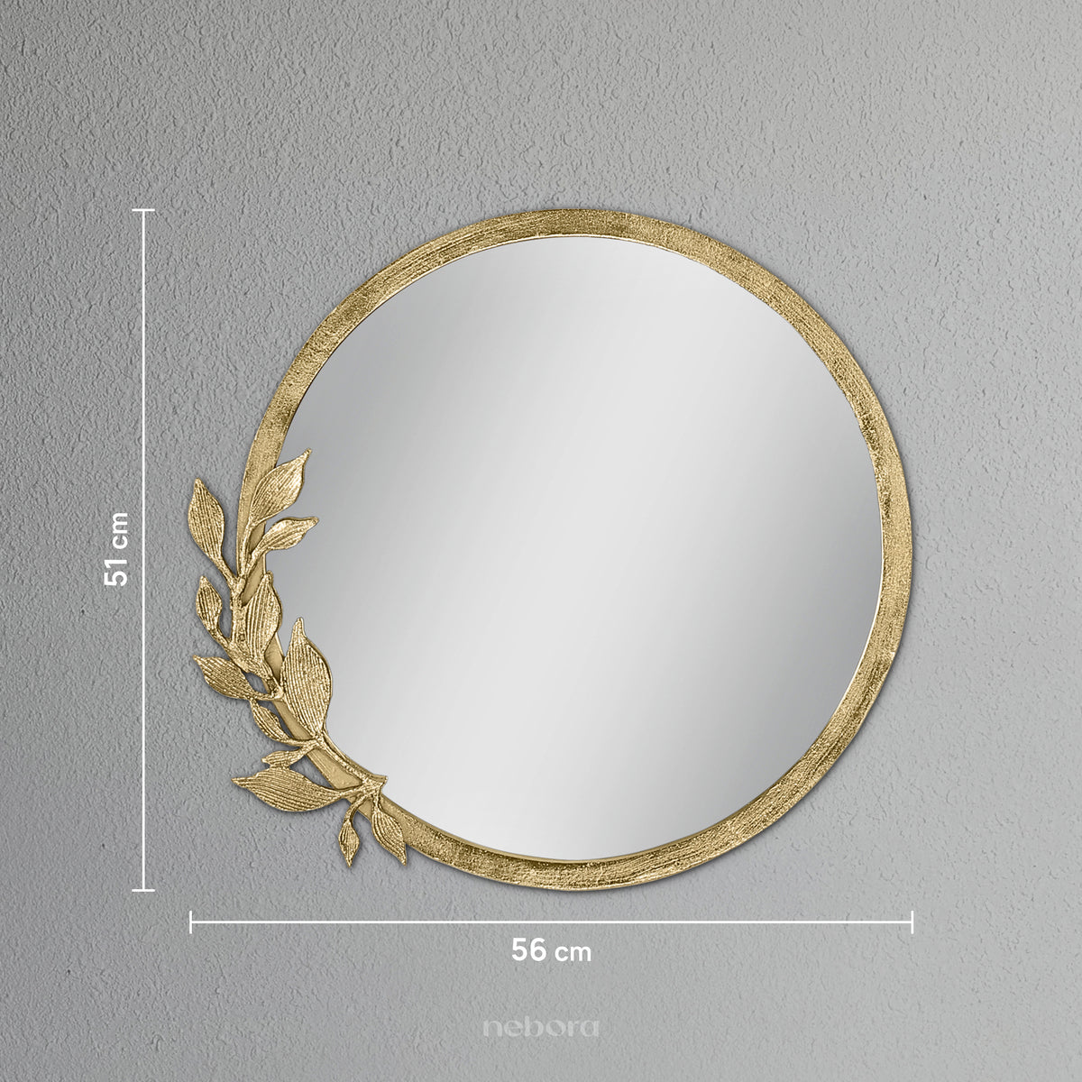 A truly regal piece, this mirror is a masterful fusion of classic elegance and natural beauty. Its round frame is finished in a rich, antiqued gold, from which a beautifully sculpted botanical branch with delicate leaves emerges, creating a captivating focal point. This mirror is perfect for a grand entryway or above a mantelpiece, where its timeless design and sophisticated charm will infuse your home with a sense of graceful luxury and artistic flair.