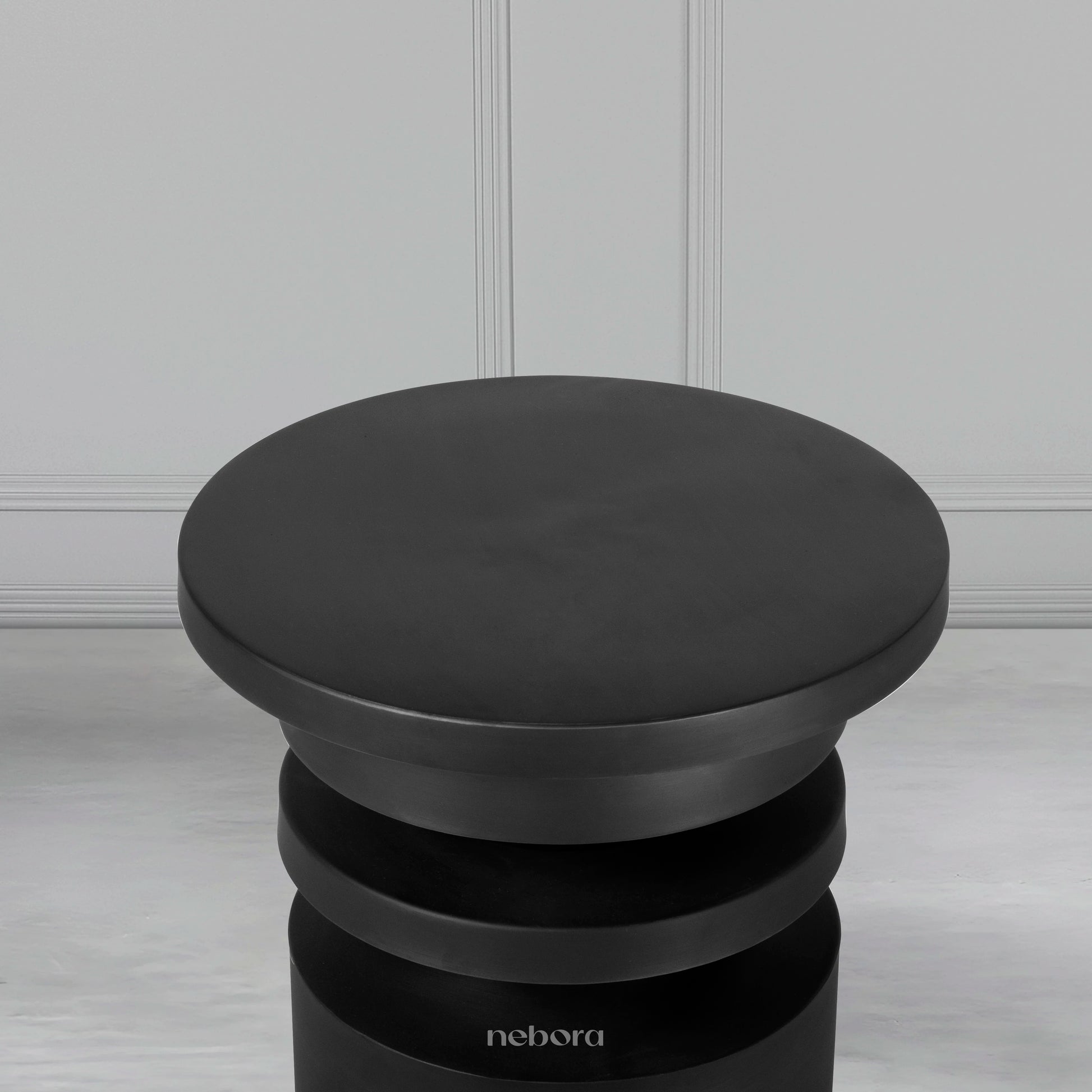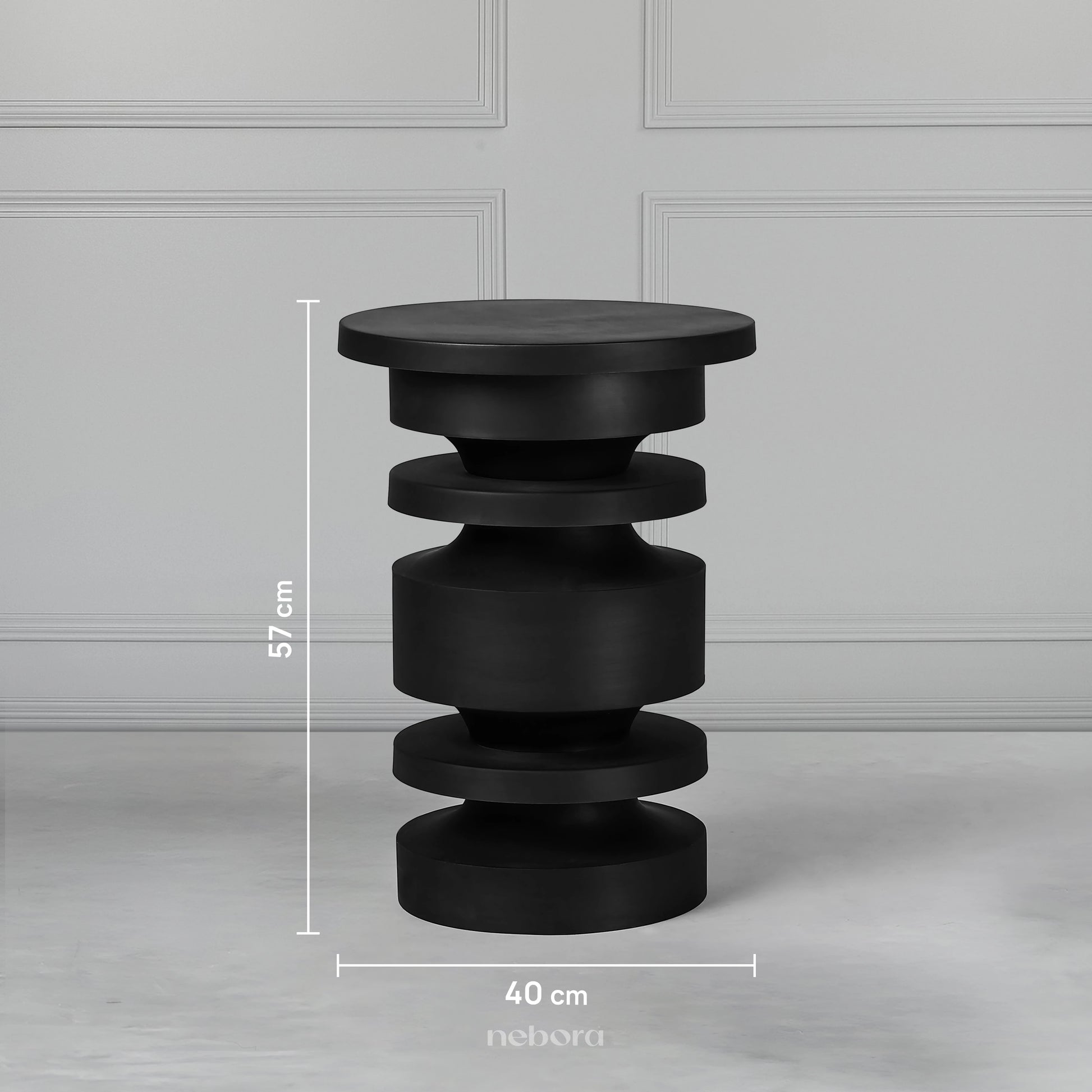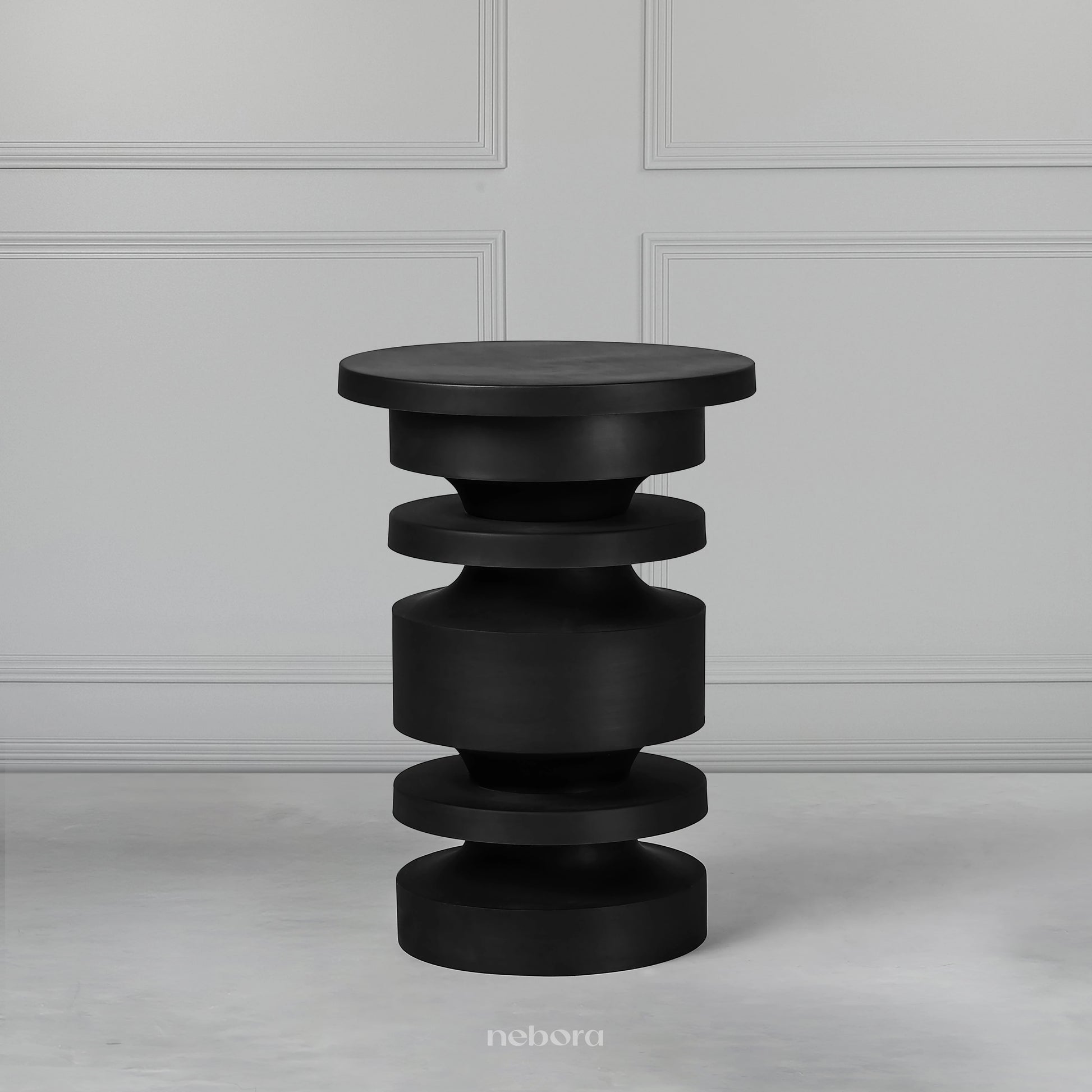 A masterpiece of modern form, this side table features a striking, sculptural bobbin silhouette that is both playful and profoundly elegant. The matte black finish accentuates its unique stacked design, giving it a powerful, grounding presence that feels both bold and understated. This table is a perfect statement piece next to a sofa or armchair, where its artistic and geometric form will add a touch of confident style and visual intrigue.