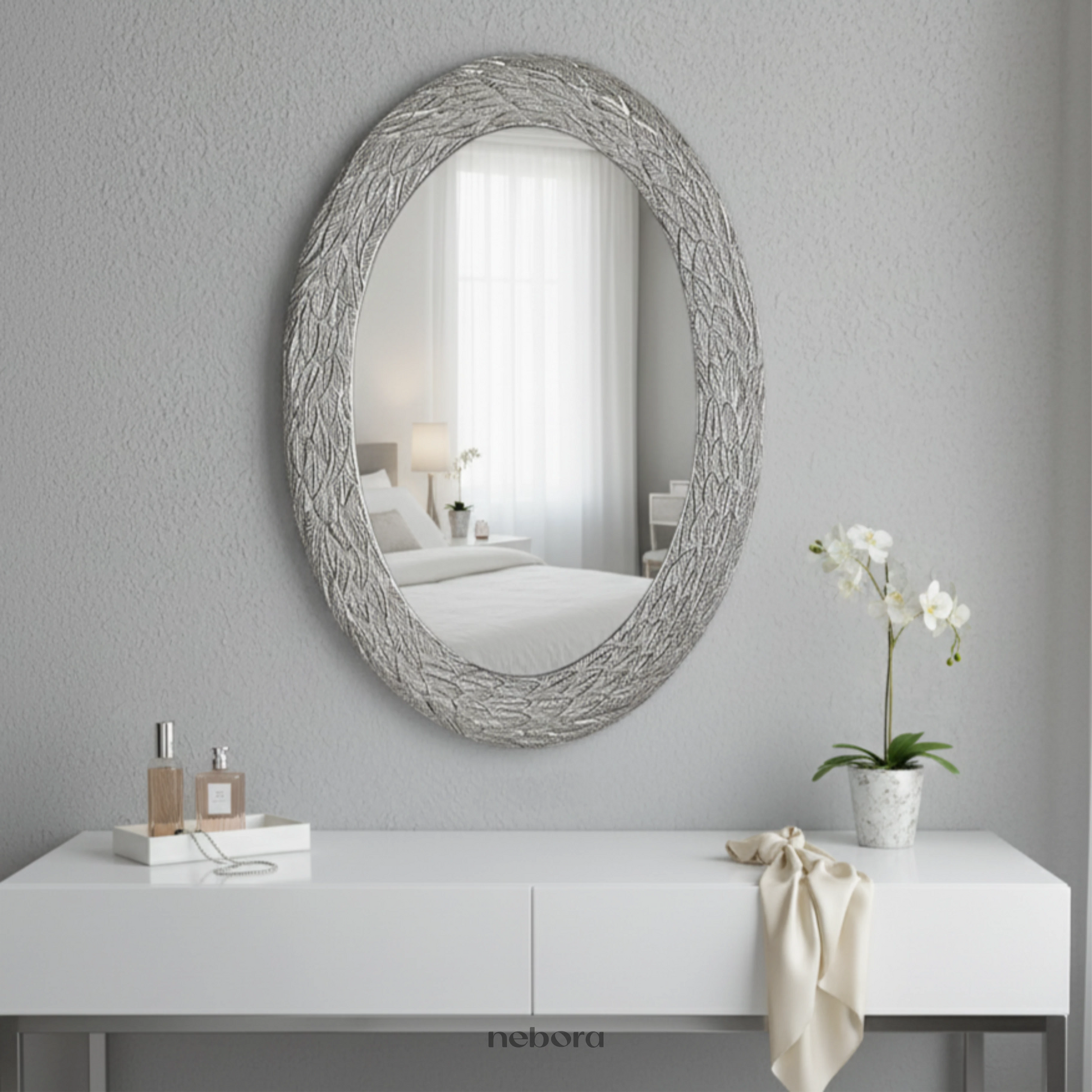 A testament to classic luxury, this mirror is an elegant oval framed by a wide, meticulously crafted band of sterling-finished metal. The intricate, textured pattern of the frame gives it a precious, jewel-like quality, while its soft silver tone adds a touch of understated glamour. This mirror is the perfect accent for a sophisticated dressing room or a formal sitting area, where its timeless beauty will elevate the space with a feeling of opulent charm.