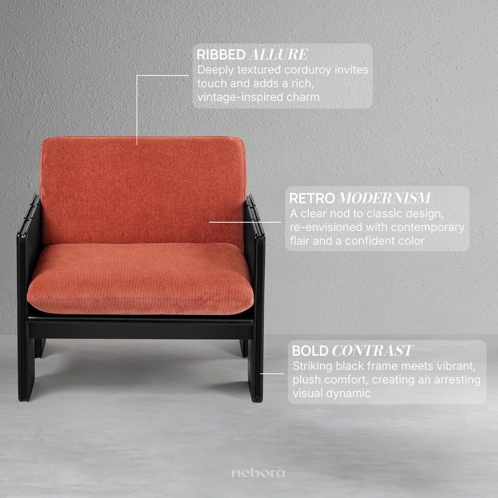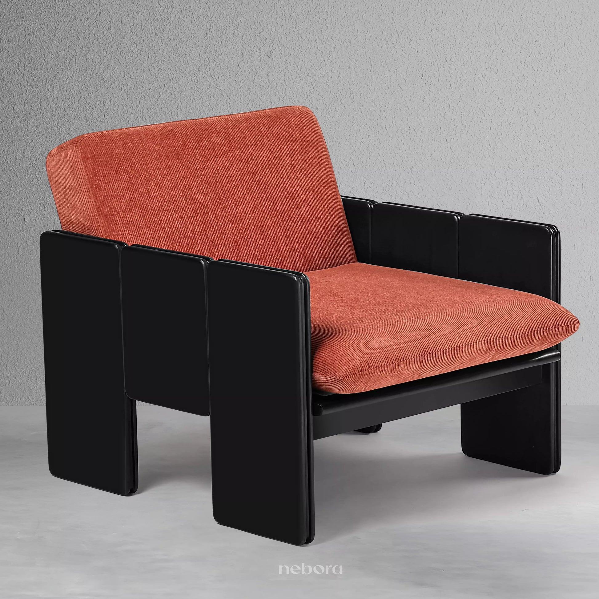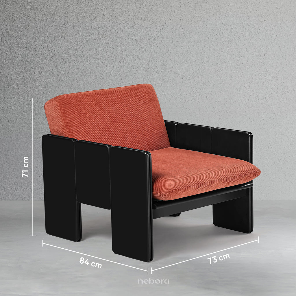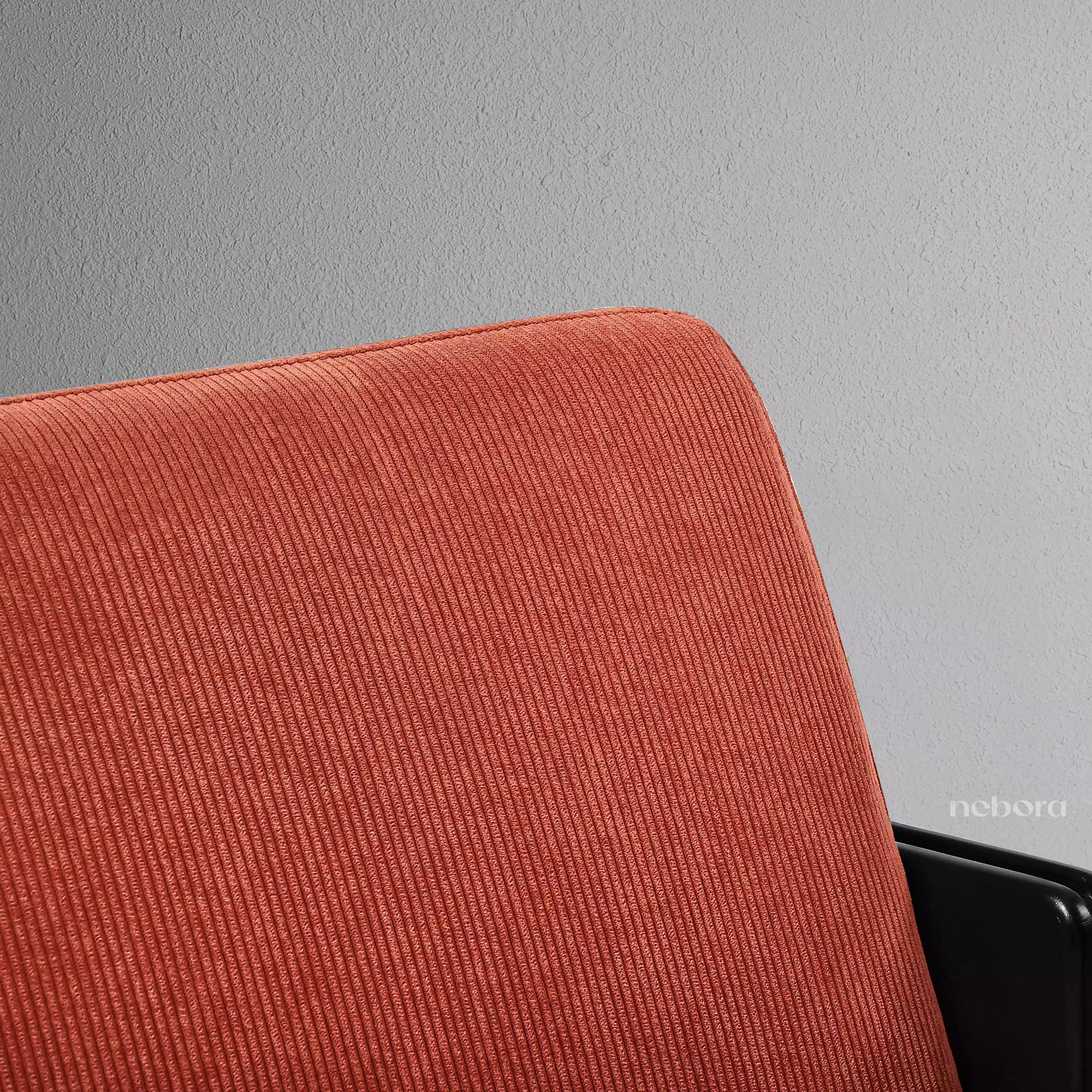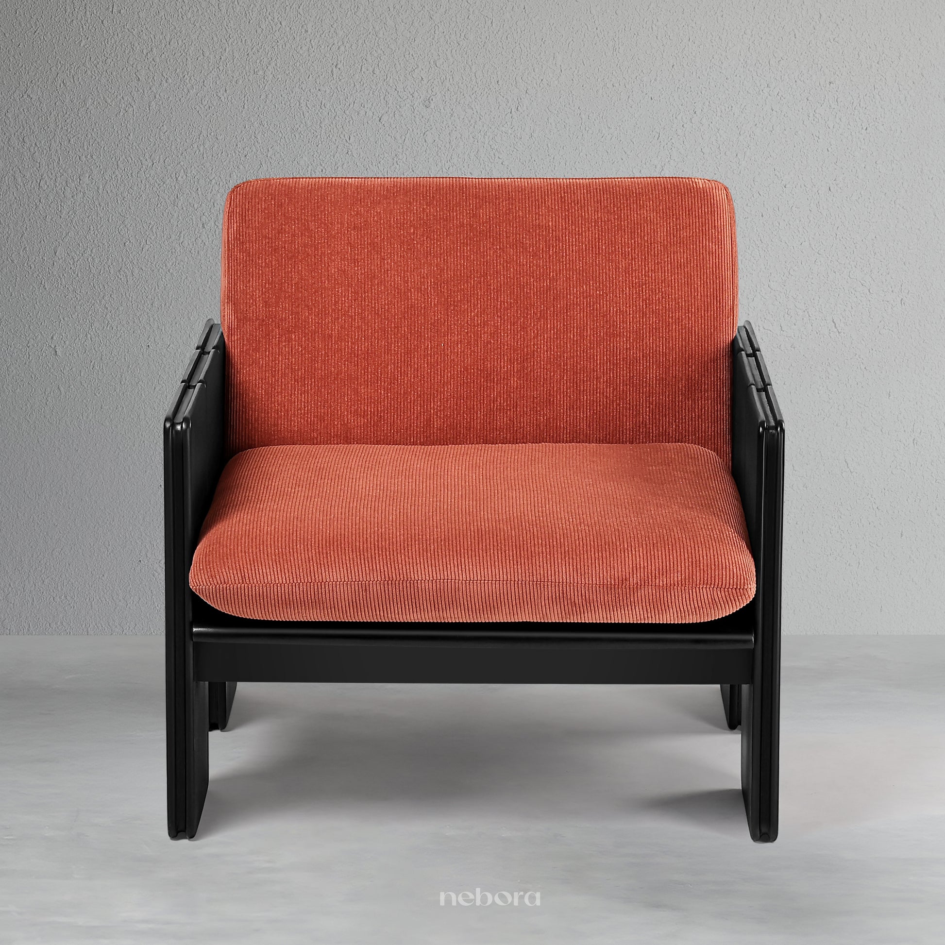 Embrace a bold statement of comfort with Stretto Single Seater Sofa. Its architectural black frame, defined by sleek lines and a confident structure, creates a striking contrast with the plush, burnt-orange cushions. Upholstered in a soft, wide-wale corduroy, this chair invites you to sink into a world of sophisticated style and cozy relaxation. More than just an armchair, the Stretto is a personal retreat designed for those who appreciate both sharp design and unwavering comfort.