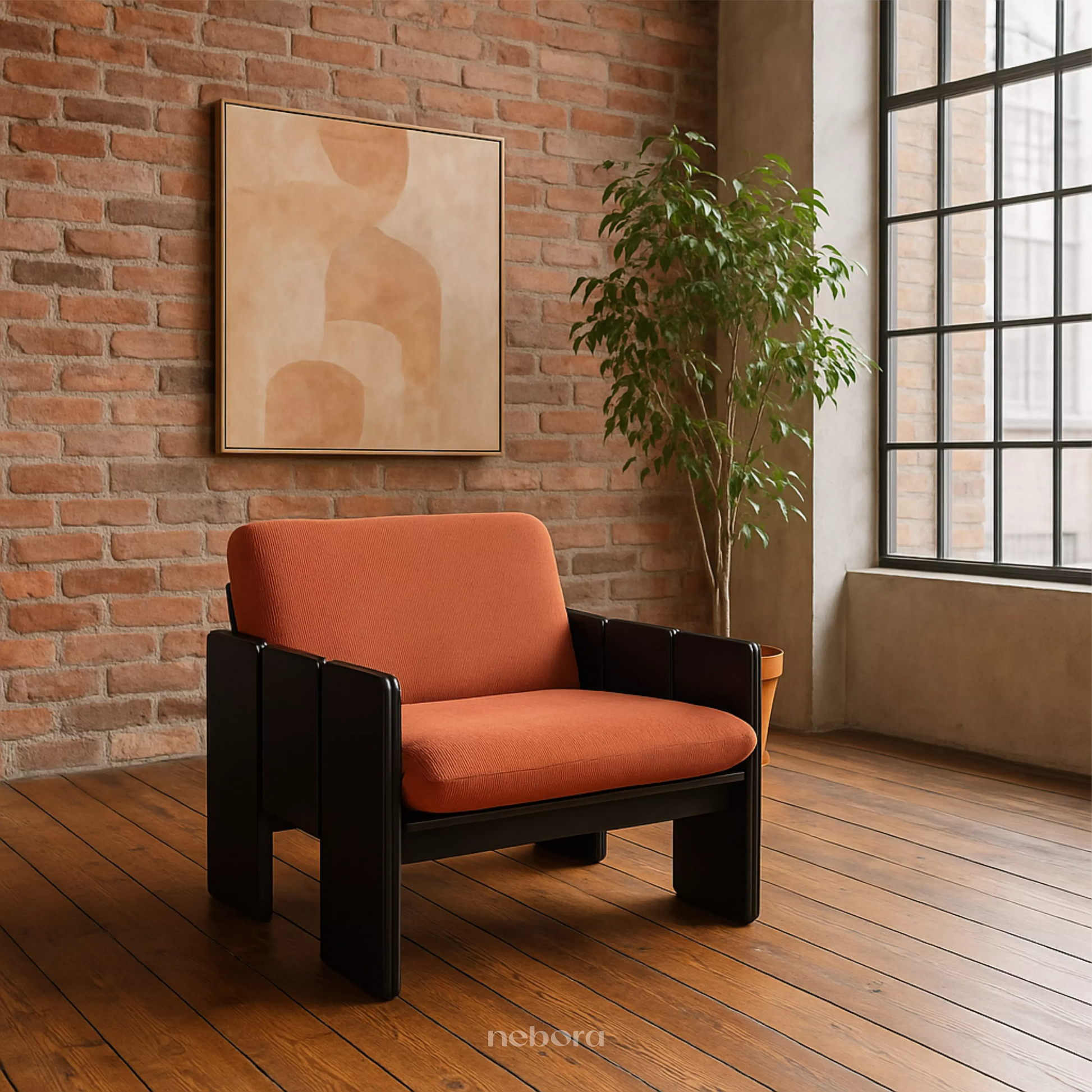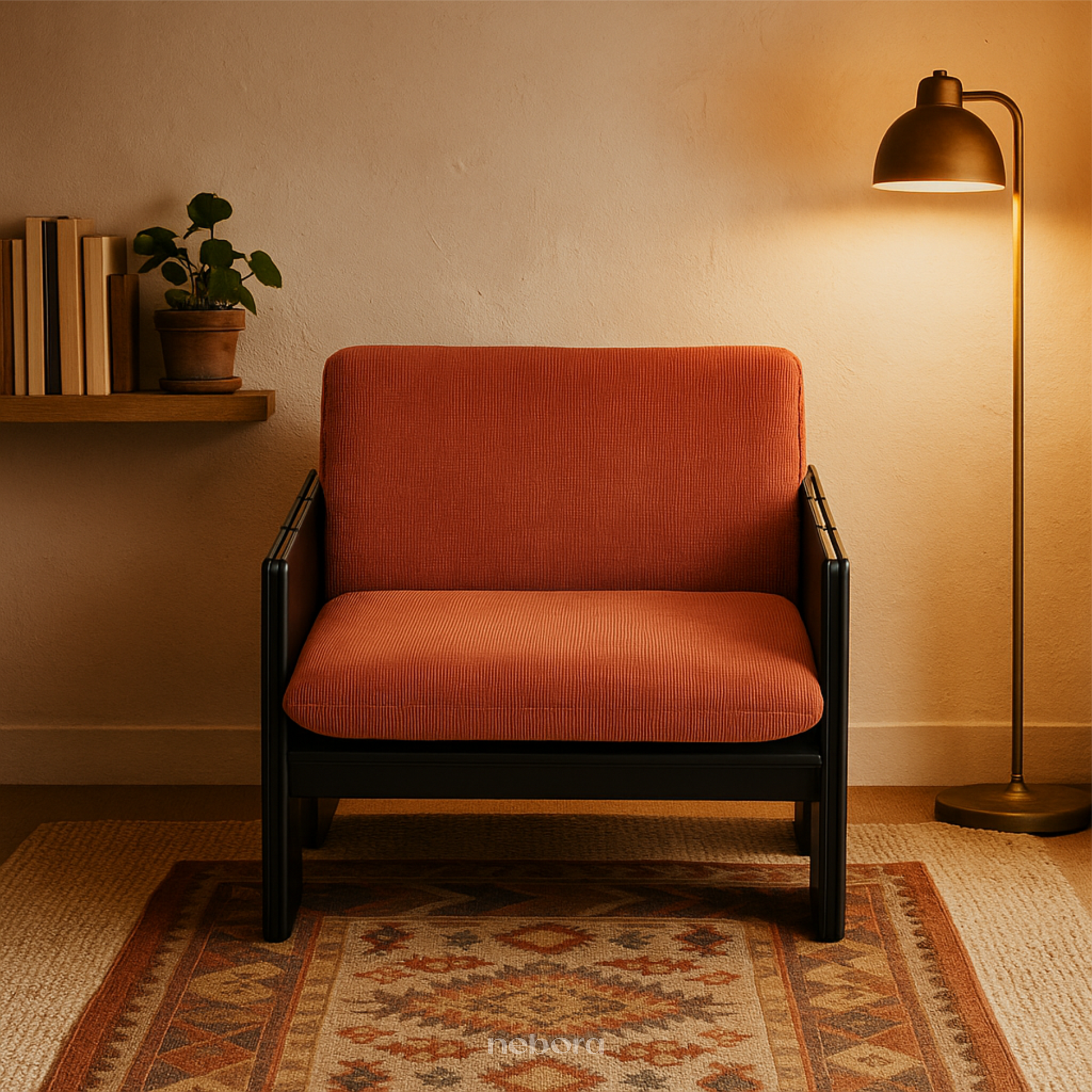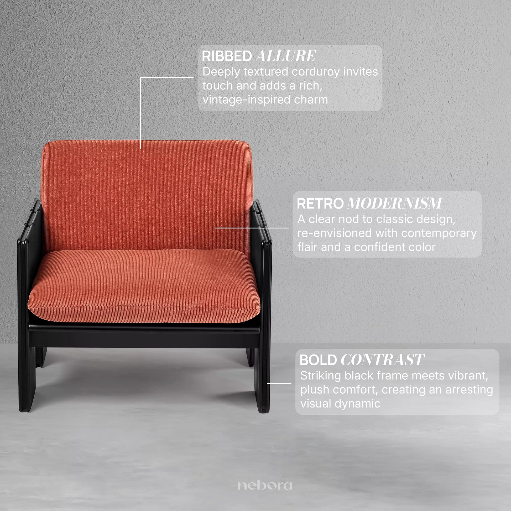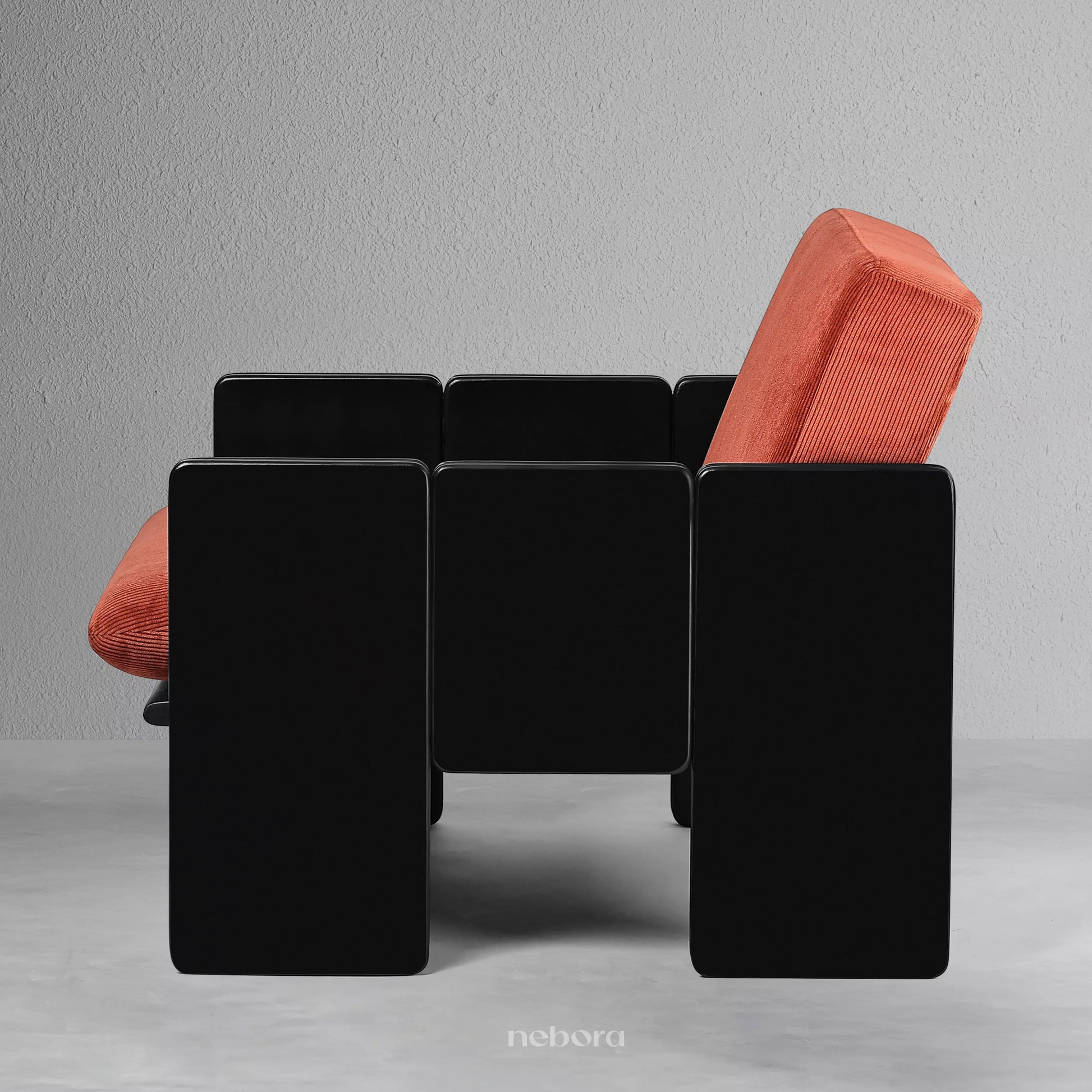 Embrace a bold statement of comfort with Stretto Single Seater Sofa. Its architectural black frame, defined by sleek lines and a confident structure, creates a striking contrast with the plush, burnt-orange cushions. Upholstered in a soft, wide-wale corduroy, this chair invites you to sink into a world of sophisticated style and cozy relaxation. More than just an armchair, the Stretto is a personal retreat designed for those who appreciate both sharp design and unwavering comfort.