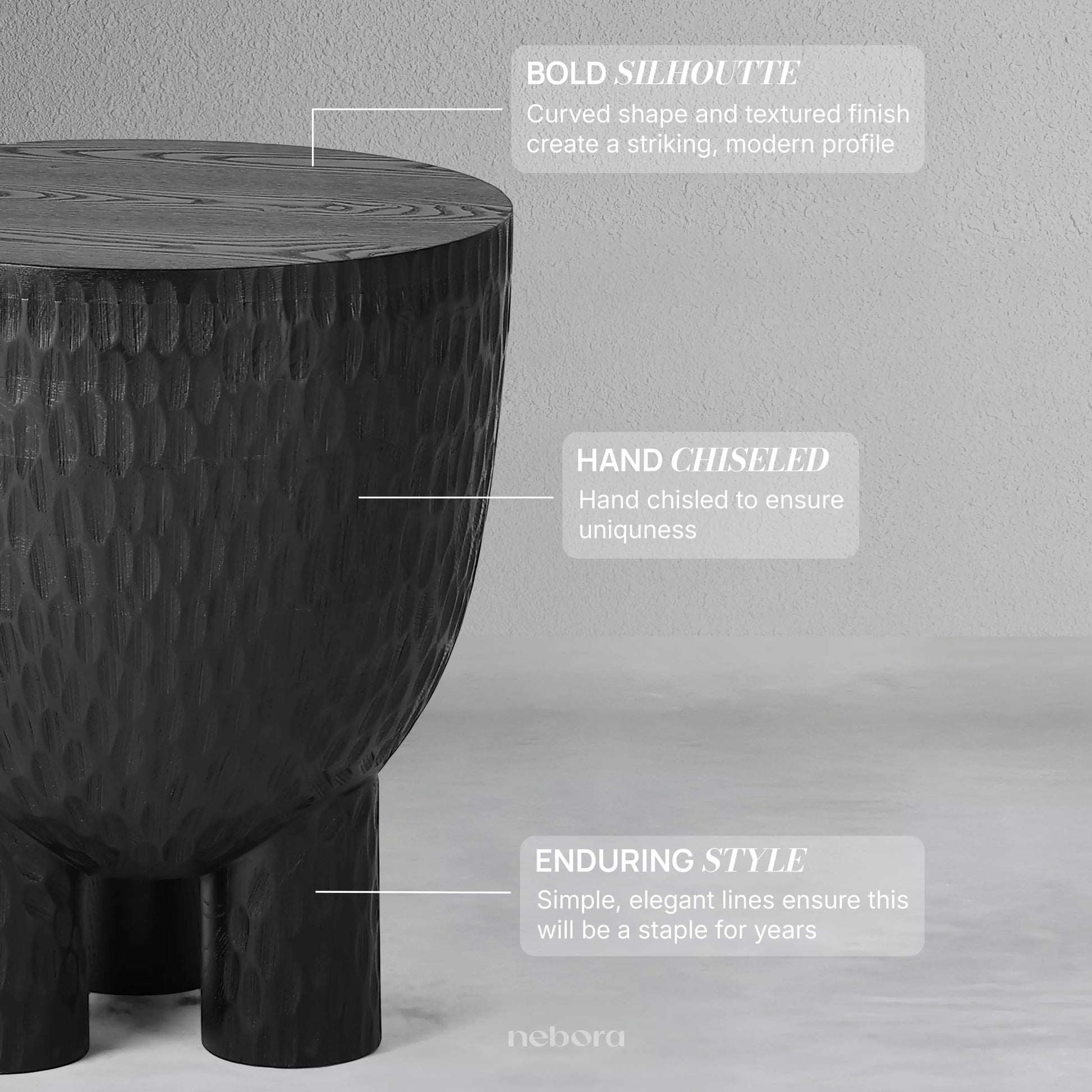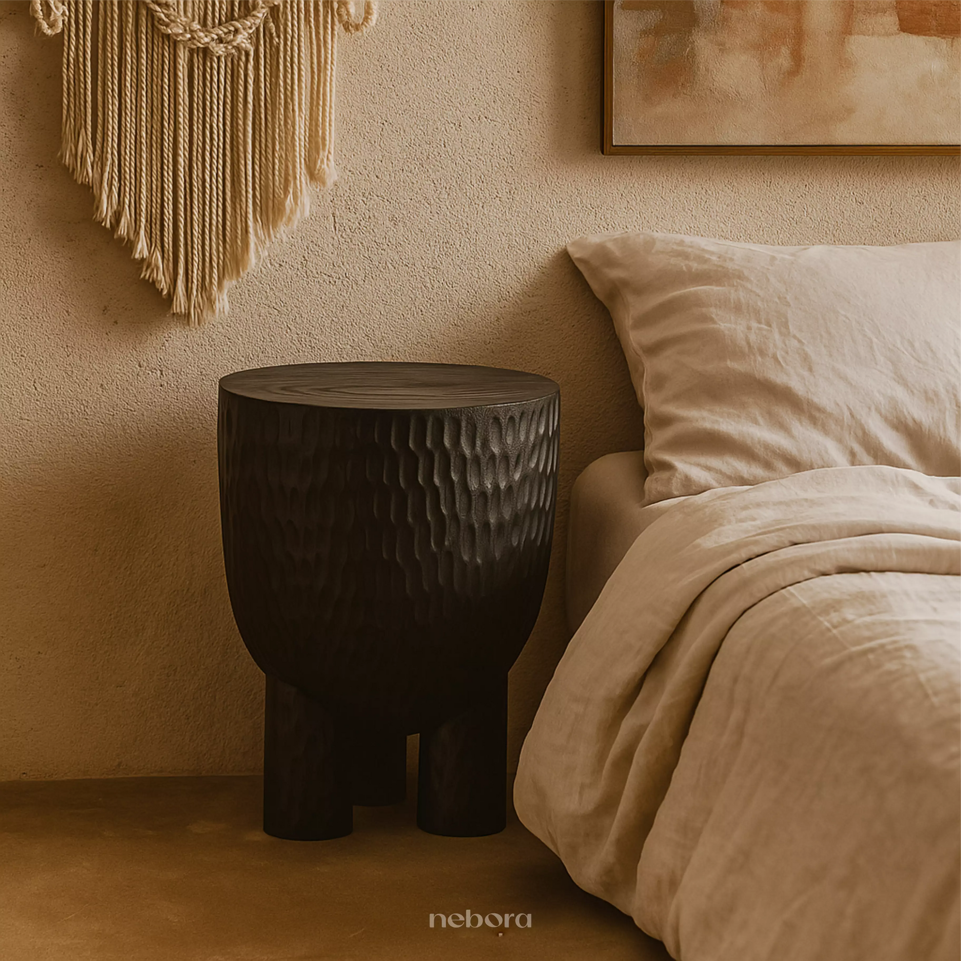 Feel the grounding presence of nature within your home with this organically sculpted side table. Hand-carved from solid wood, its rich texture and deep ebony finish evoke ancient artistry and a connection to the earth. Perfect beside a natural linen sofa or as a unique bedside companion, it offers a tactile beauty that grounds your space in authentic, soulful design.
